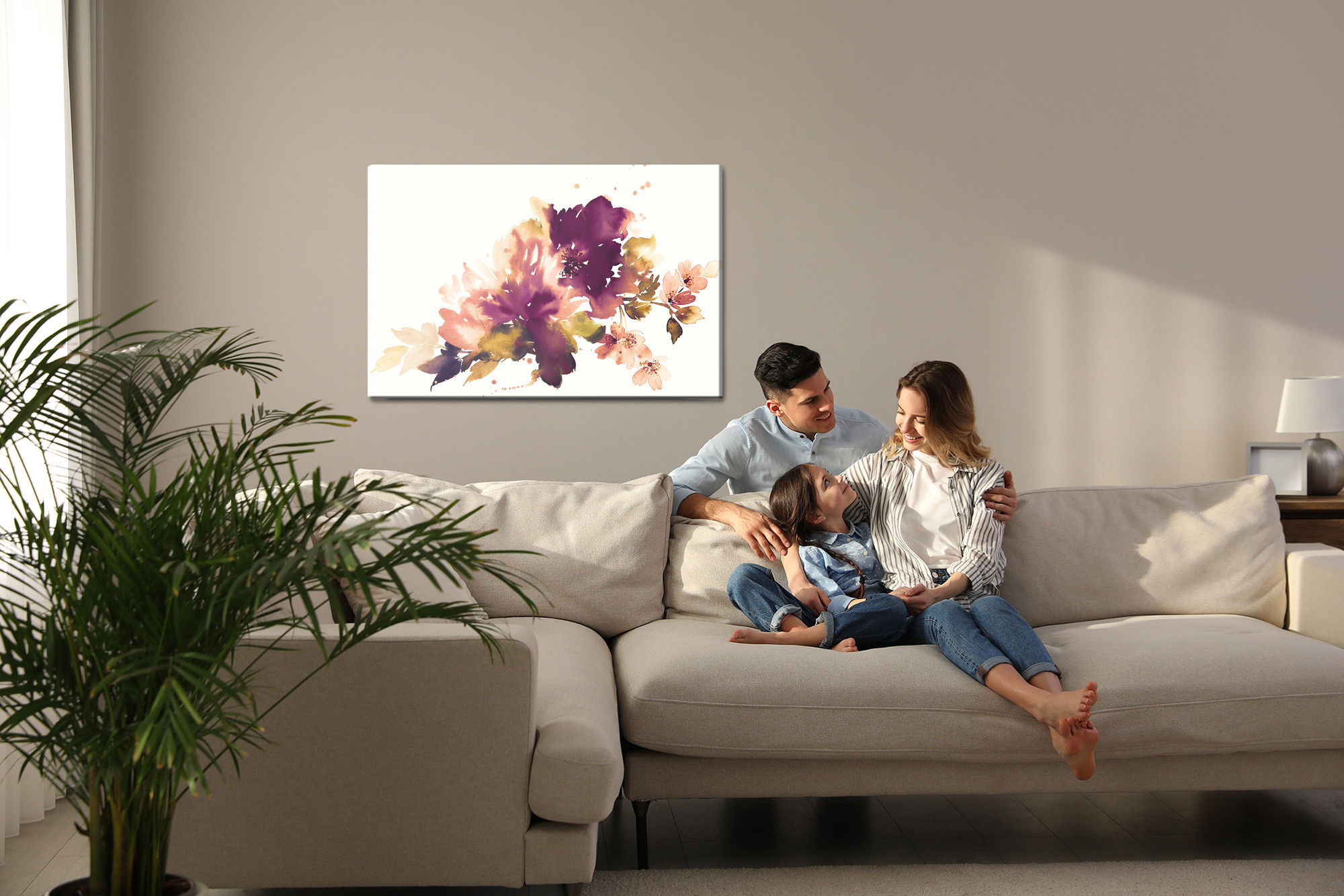Motivet Watercolor leaves and flowers återges med hög färgprecision och detaljrikedom tack vare HP Latex-teknologi. Trycket sker med vattenbaserade, luktfria och GREENGUARD Gold-certifierade bläck som ger en upplösning på upp till 300 DPI. Färgerna är UV-beständiga och behåller sin styrka även i ljusa rum, vilket gör tavlan lämplig för både hem- och offentliga miljöer.