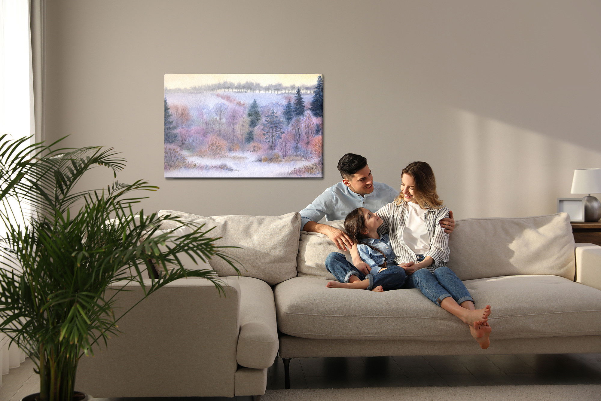 Varje tavla monteras på en massiv fururam. Format upp till 70×50 cm har en ram på 15 mm, medan format från 90×60 cm och uppåt har en ram på 20 mm. Den exakta dukspänningen gör att tavlan håller sin form över tid. Motivet Winter forest in the valley trycks runt hela ramen vilket ger ett stilrent galleriuttryck där tavlan är lika vacker från sidan som framifrån. Kombinationen av rak dukspänning, rena linjer och korrekt tryck ger en professionell finish.