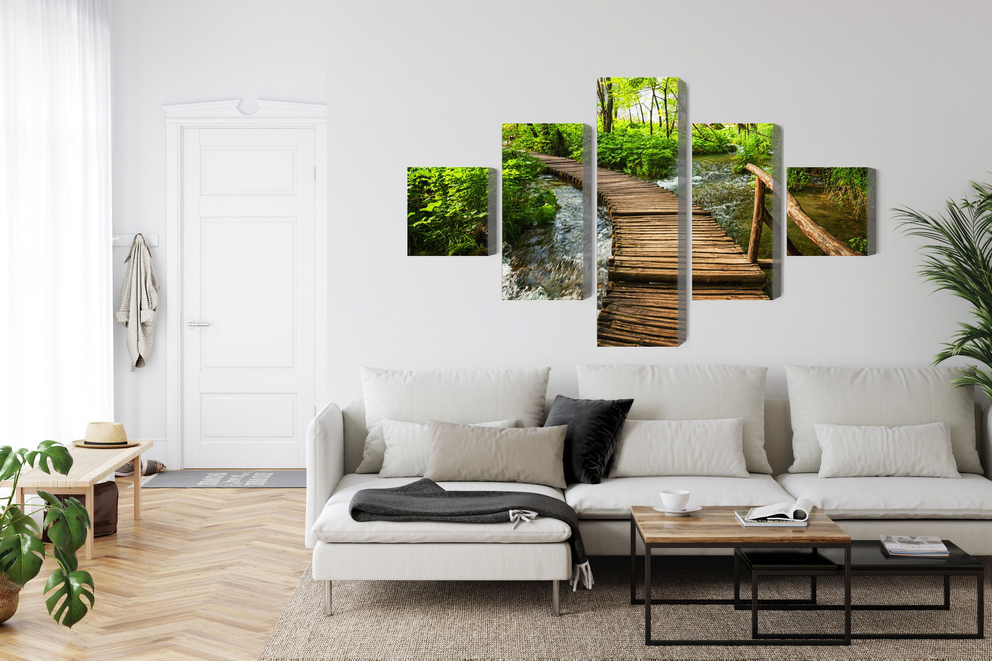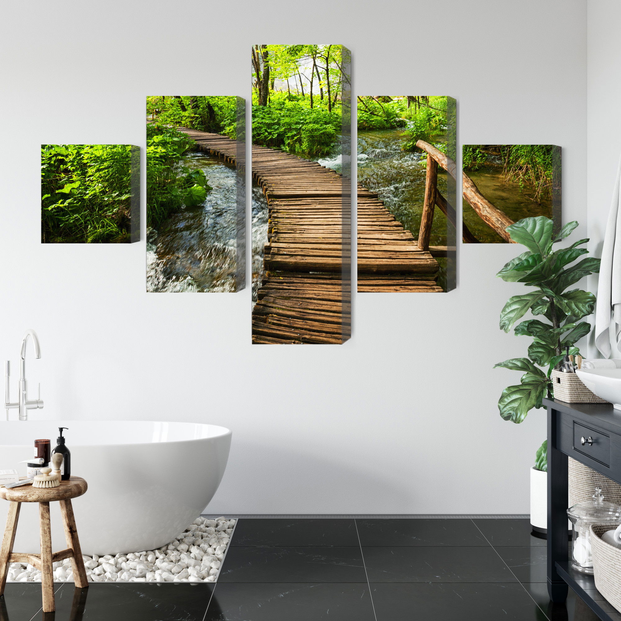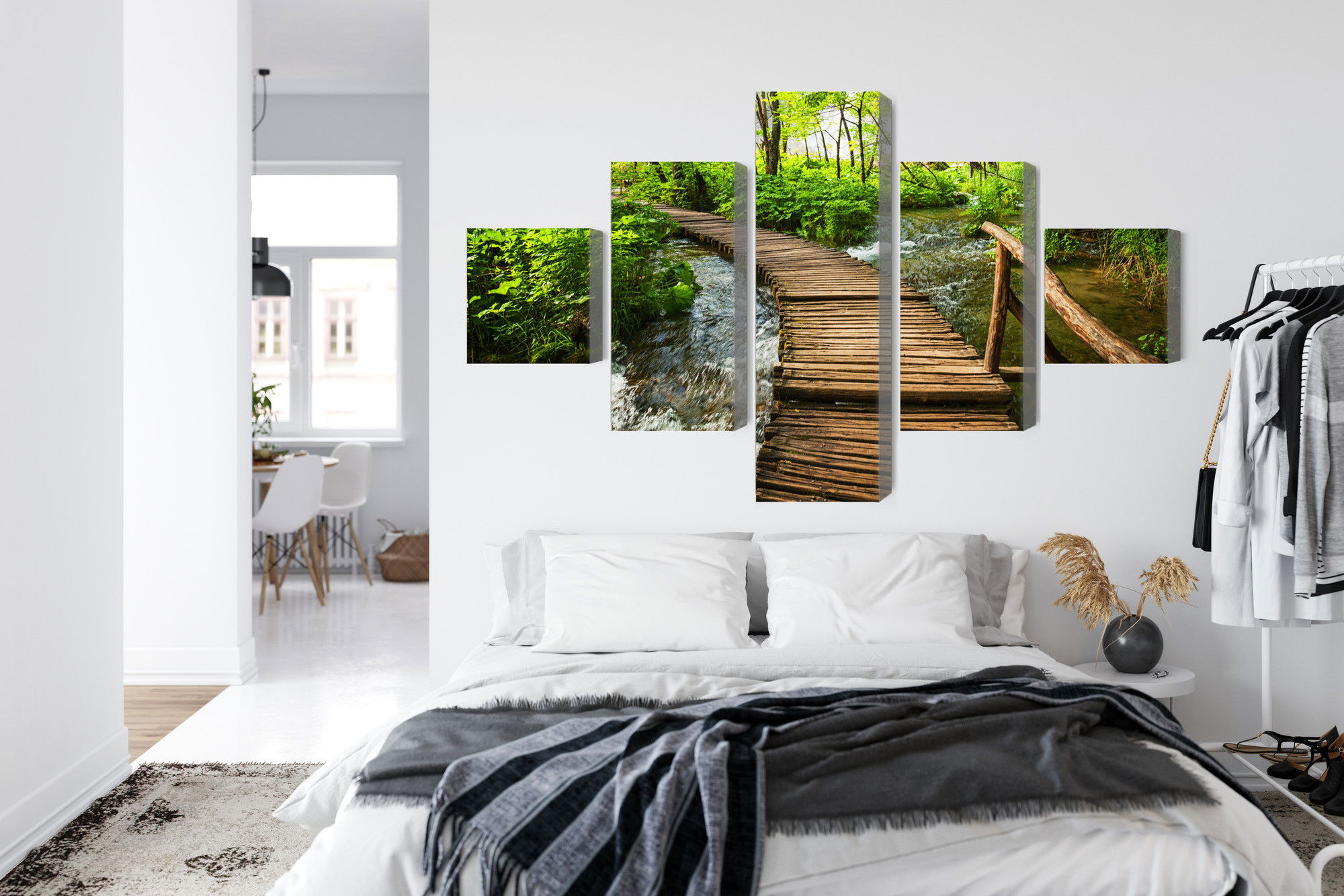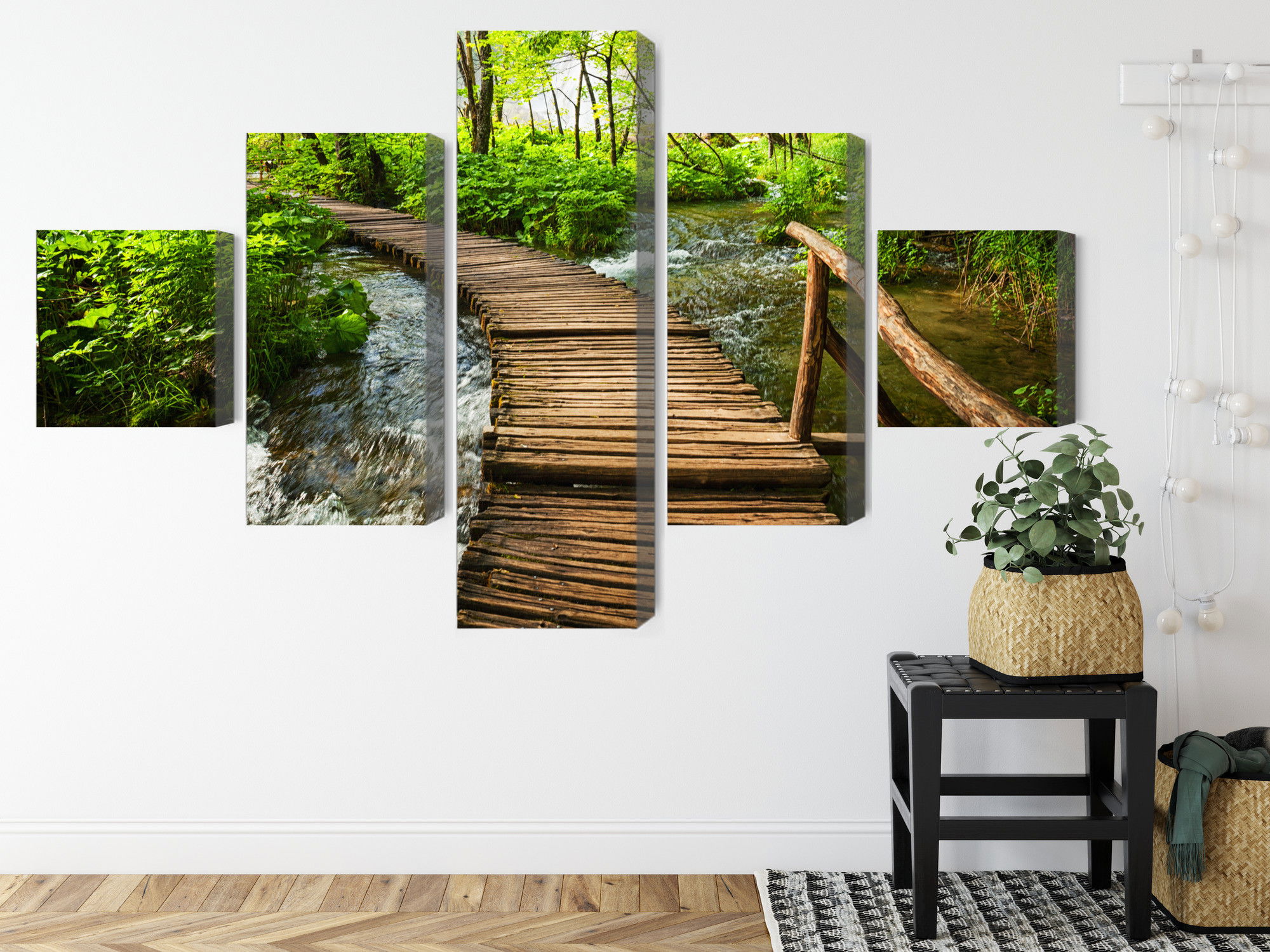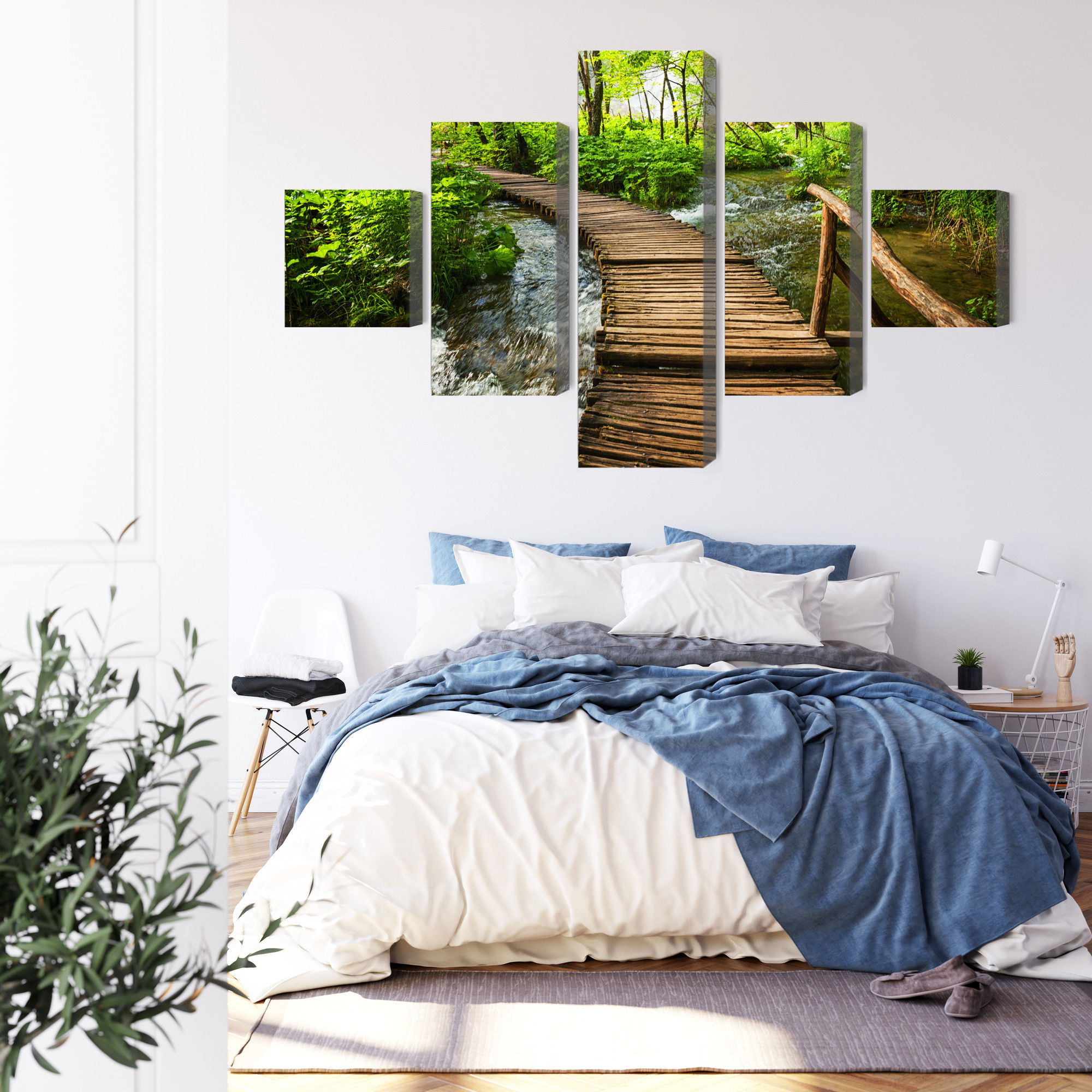 Varje tavla monteras på en massiv fururam. Format upp till 70×50 cm har en ram på 15 mm, medan format från 90×60 cm och uppåt har en ram på 20 mm. Den exakta dukspänningen gör att tavlan håller sin form över tid. Motivet Wooden pier in the forest trycks runt hela ramen vilket ger ett stilrent galleriuttryck där tavlan är lika vacker från sidan som framifrån. Kombinationen av rak dukspänning, rena linjer och korrekt tryck ger en professionell finish.