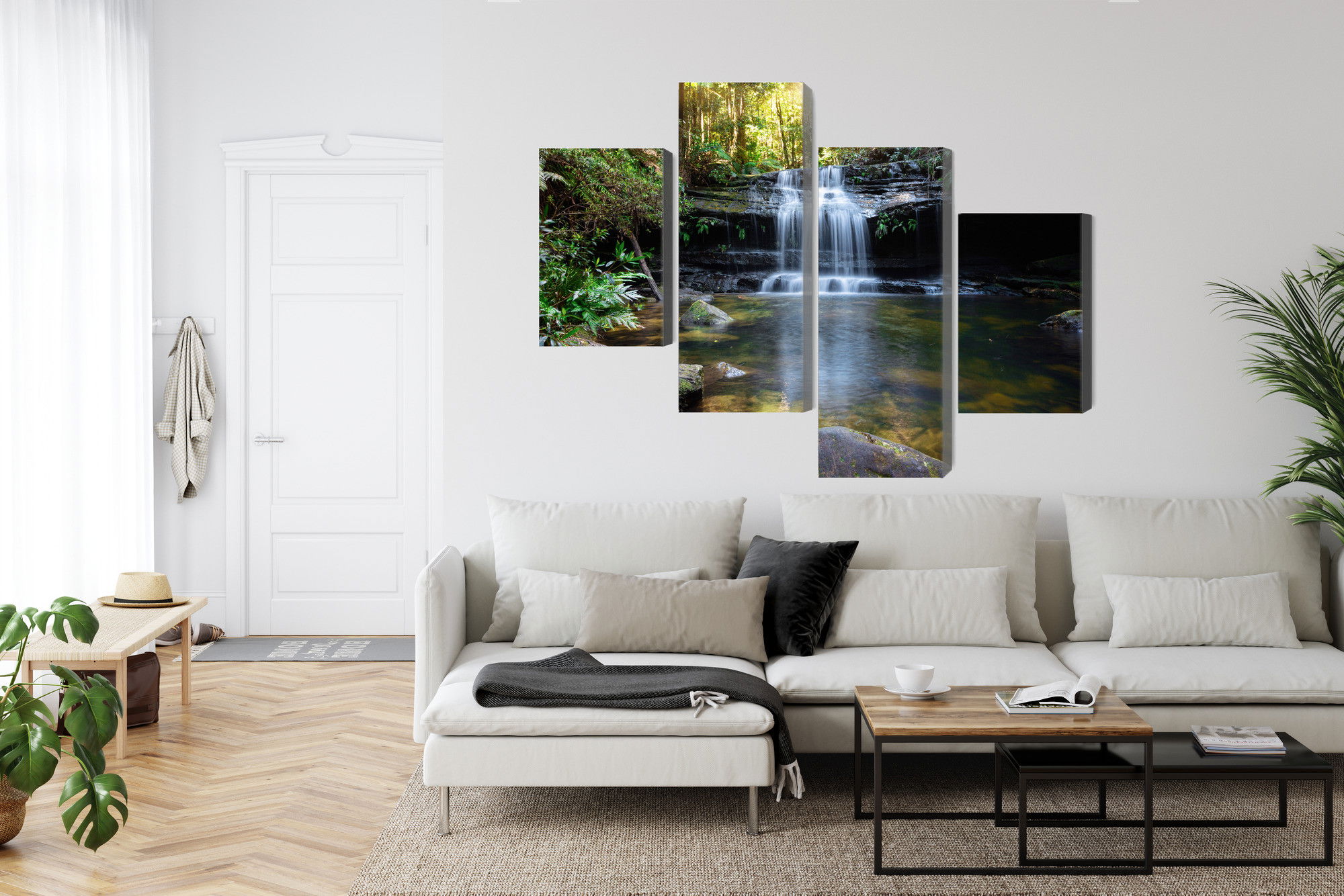 SilentDirects ljuddämpande tavla A waterfall in the bush kombinerar ett högupplöst motiv med avancerad akustikteknik. Varje tavla monteras i Sverige och bygger på en stabil canvastavla med fururam, där insidan av ramen fylls med en ljudabsorberande kärna av återvunnen polyester. Konstruktionen gör tavlan till ett både estetiskt och funktionellt inslag i rummet.