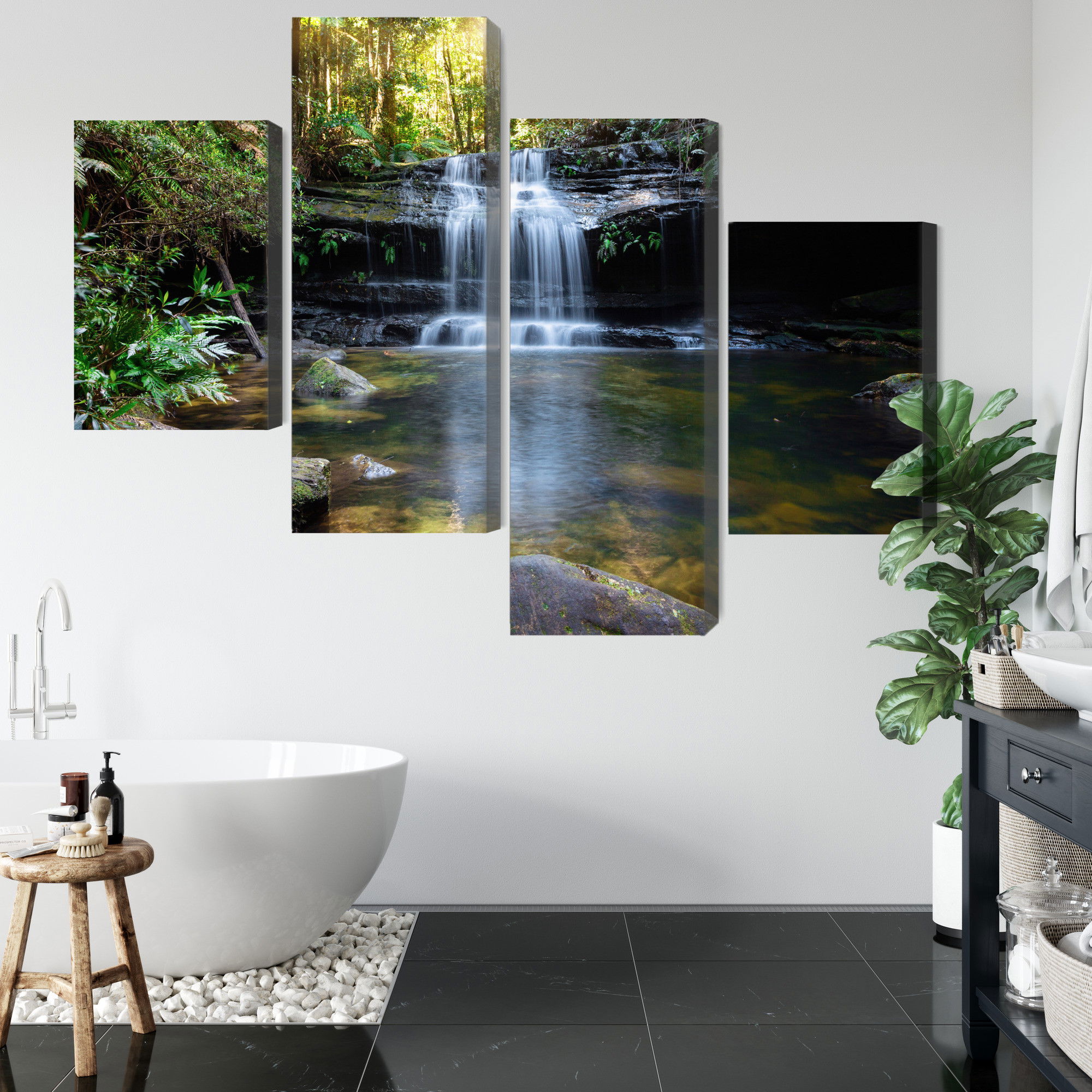 Varje tavla monteras på en massiv fururam. Format upp till 70×50 cm har en ram på 15 mm, medan format från 90×60 cm och uppåt har en ram på 20 mm. Den exakta dukspänningen gör att tavlan håller sin form över tid. Motivet A waterfall in the bush trycks runt hela ramen vilket ger ett stilrent galleriuttryck där tavlan är lika vacker från sidan som framifrån. Kombinationen av rak dukspänning, rena linjer och korrekt tryck ger en professionell finish.