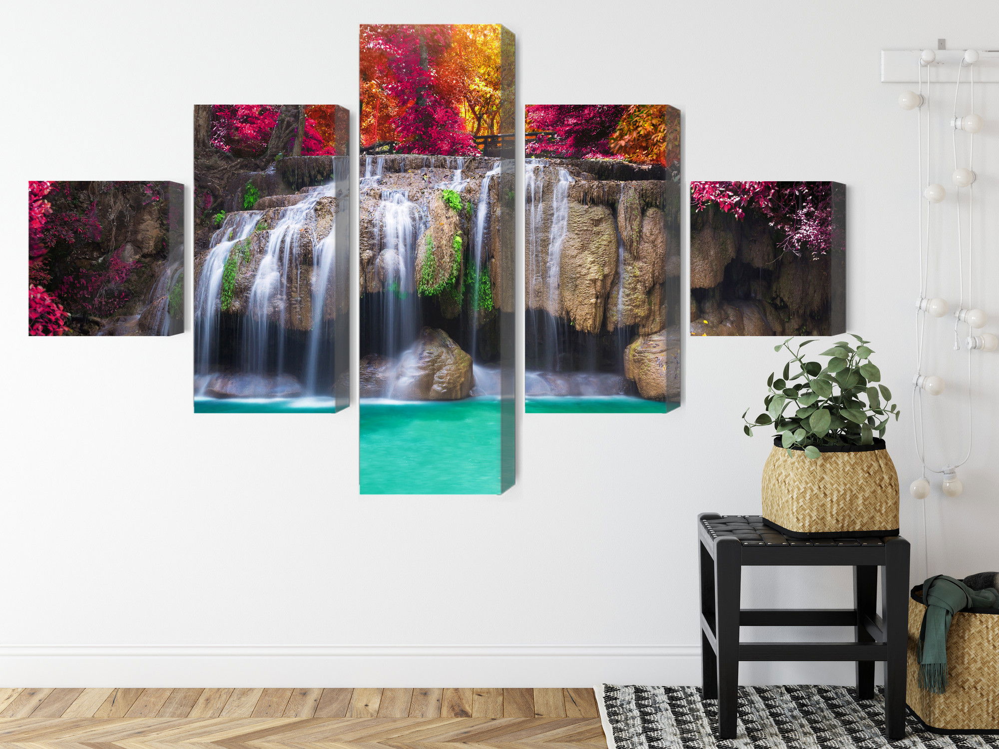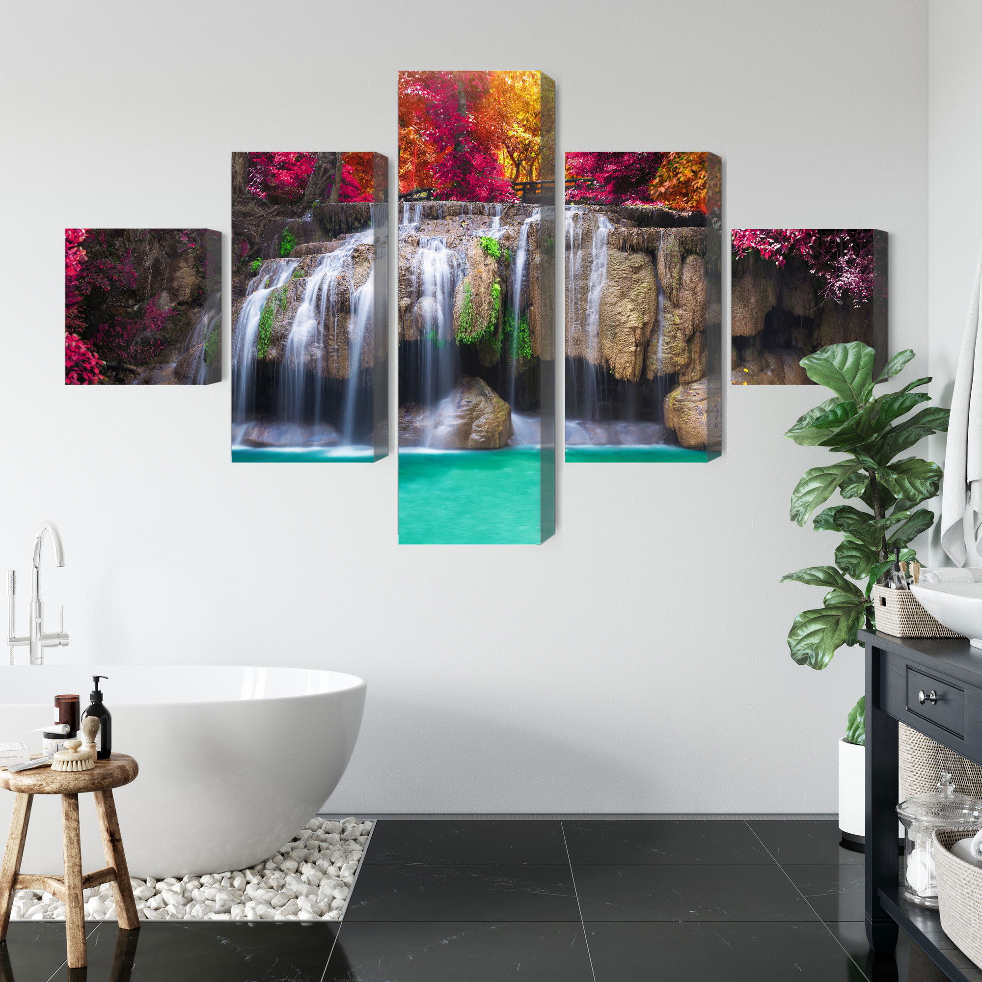 Motivet A waterfall in the deep återges med hög färgprecision och detaljrikedom tack vare HP Latex-teknologi. Trycket sker med vattenbaserade, luktfria och GREENGUARD Gold-certifierade bläck som ger en upplösning på upp till 300 DPI. Färgerna är UV-beständiga och behåller sin styrka även i ljusa rum, vilket gör tavlan lämplig för både hem- och offentliga miljöer.