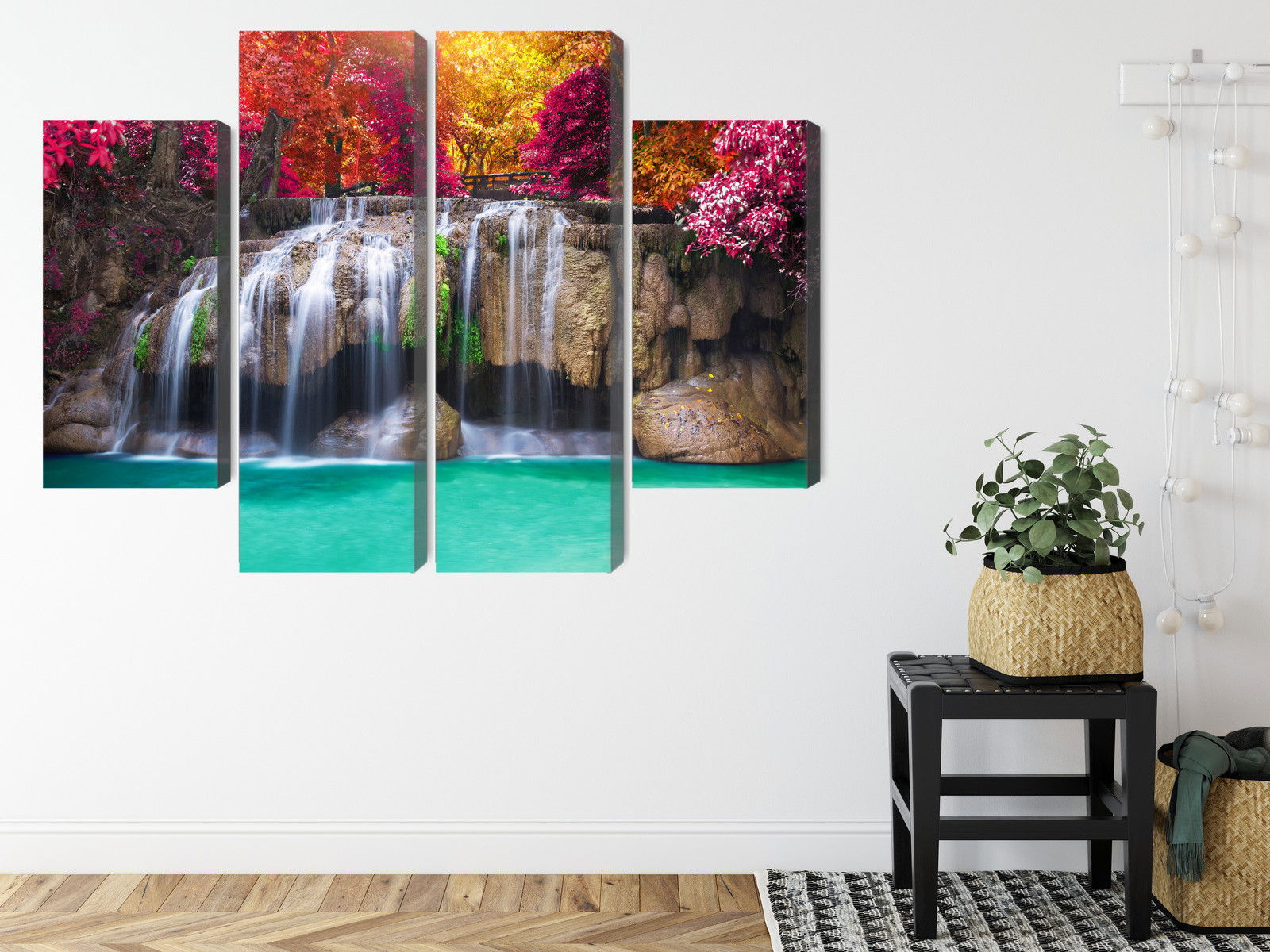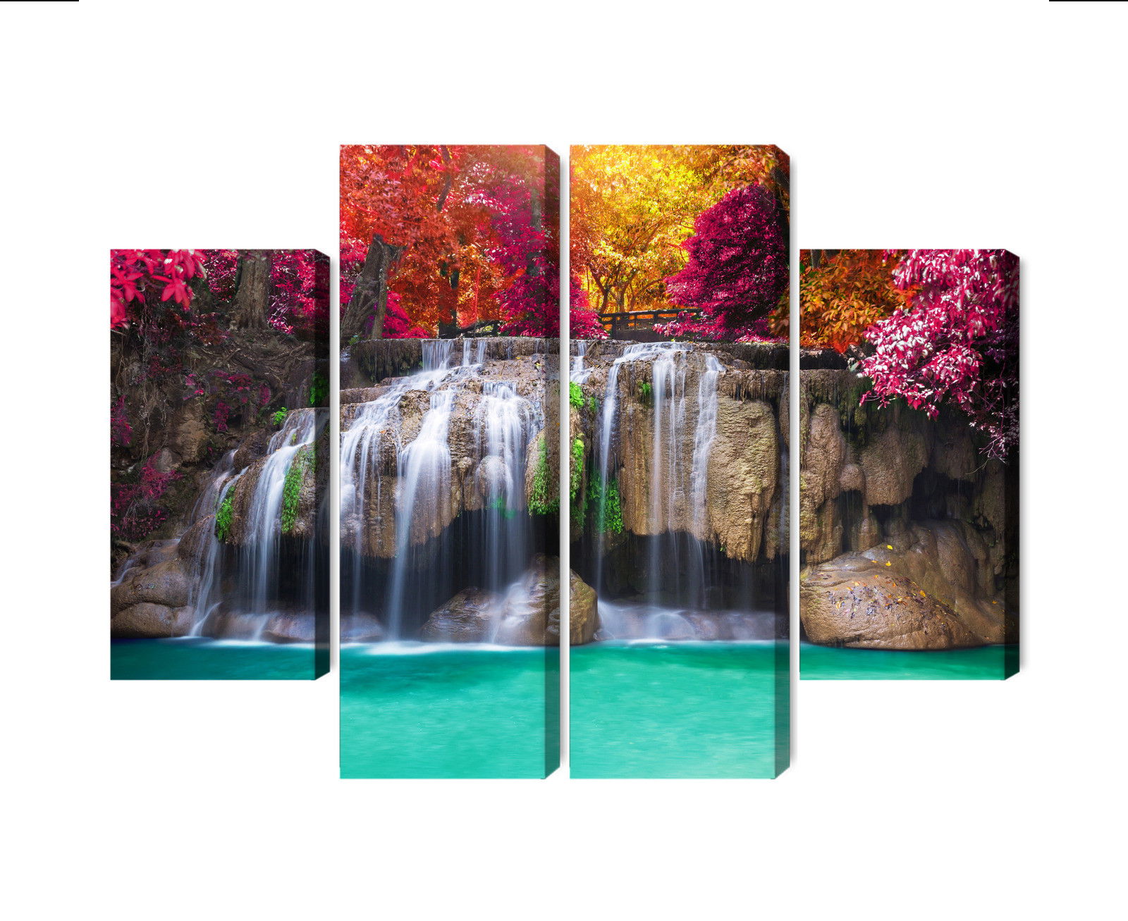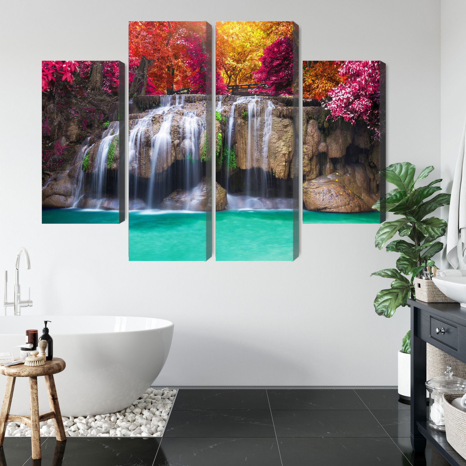 Motivet A waterfall in the deep återges med hög färgprecision och detaljrikedom tack vare HP Latex-teknologi. Trycket sker med vattenbaserade, luktfria och GREENGUARD Gold-certifierade bläck som ger en upplösning på upp till 300 DPI. Färgerna är UV-beständiga och behåller sin styrka även i ljusa rum, vilket gör tavlan lämplig för både hem- och offentliga miljöer.