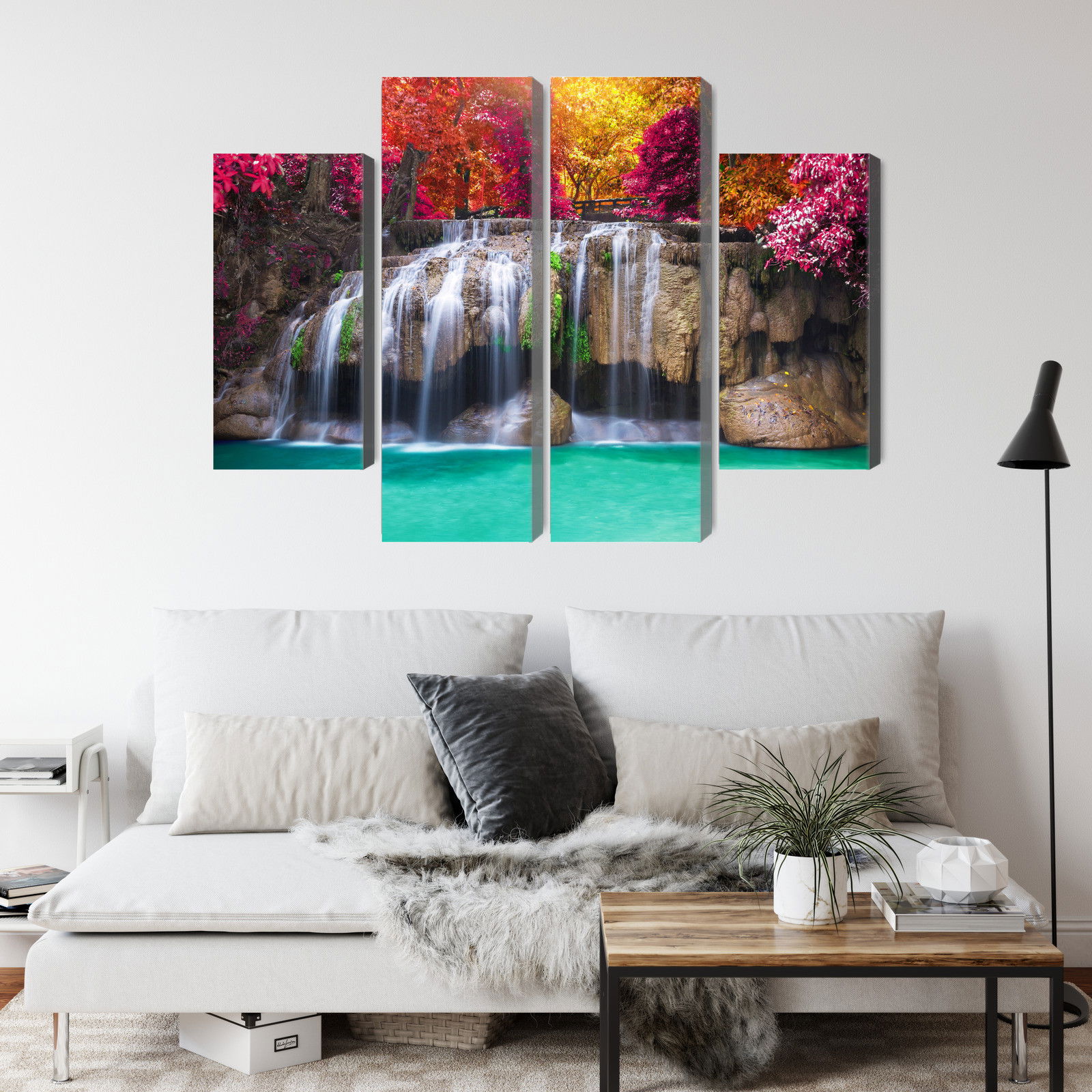 Varje tavla monteras på en massiv fururam. Format upp till 70×50 cm har en ram på 15 mm, medan format från 90×60 cm och uppåt har en ram på 20 mm. Den exakta dukspänningen gör att tavlan håller sin form över tid. Motivet A waterfall in the deep trycks runt hela ramen vilket ger ett stilrent galleriuttryck där tavlan är lika vacker från sidan som framifrån. Kombinationen av rak dukspänning, rena linjer och korrekt tryck ger en professionell finish.