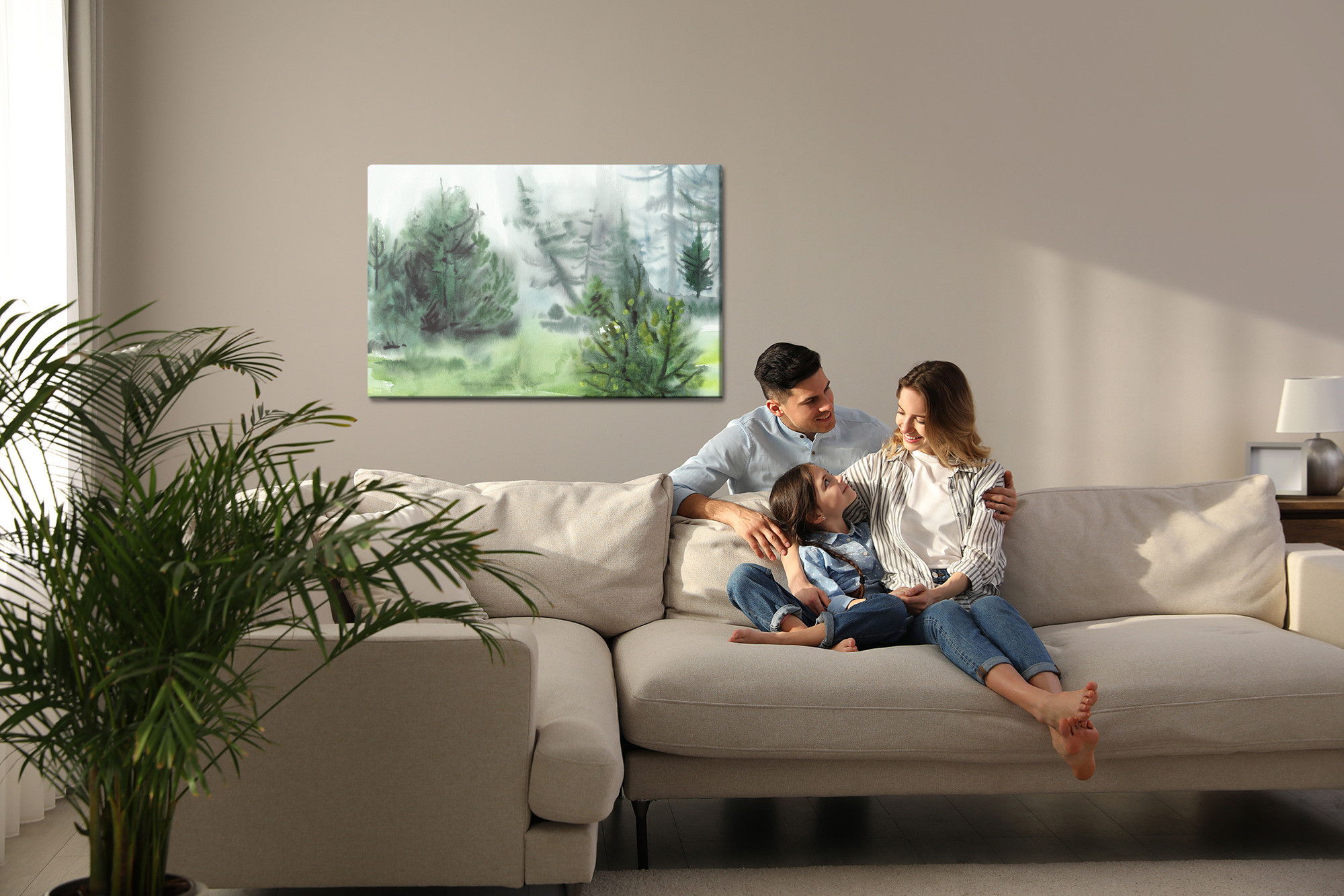 Varje tavla monteras på en massiv fururam. Format upp till 70×50 cm har en ram på 15 mm, medan format från 90×60 cm och uppåt har en ram på 20 mm. Den exakta dukspänningen gör att tavlan håller sin form över tid. Motivet Pine forest trycks runt hela ramen vilket ger ett stilrent galleriuttryck där tavlan är lika vacker från sidan som framifrån. Kombinationen av rak dukspänning, rena linjer och korrekt tryck ger en professionell finish.