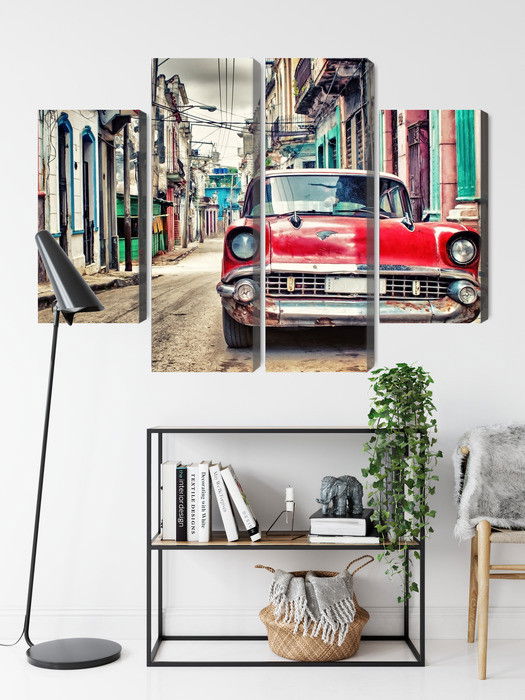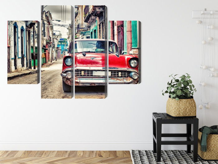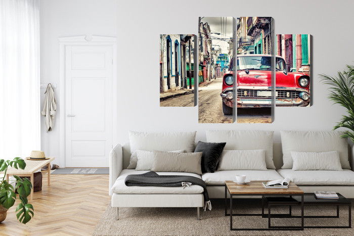 Varje tavla monteras på en massiv fururam. Format upp till 70×50 cm har en ram på 15 mm, medan format från 90×60 cm och uppåt har en ram på 20 mm. Den exakta dukspänningen gör att tavlan håller sin form över tid. Motivet Red chevrolet car in retro trycks runt hela ramen vilket ger ett stilrent galleriuttryck där tavlan är lika vacker från sidan som framifrån. Kombinationen av rak dukspänning, rena linjer och korrekt tryck ger en professionell finish.
