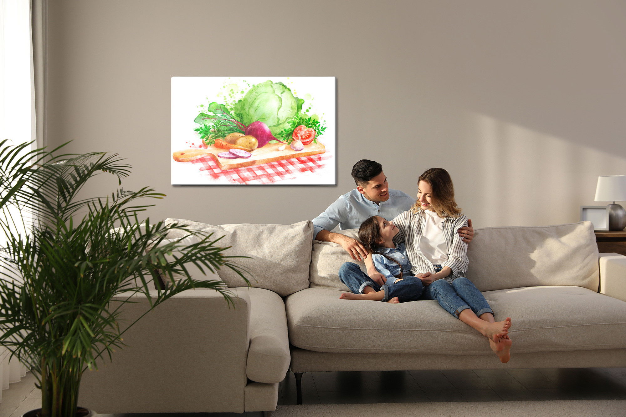 Varje tavla monteras på en massiv fururam. Format upp till 70×50 cm har en ram på 15 mm, medan format från 90×60 cm och uppåt har en ram på 20 mm. Den exakta dukspänningen gör att tavlan håller sin form över tid. Motivet Vegetables on a chopping trycks runt hela ramen vilket ger ett stilrent galleriuttryck där tavlan är lika vacker från sidan som framifrån. Kombinationen av rak dukspänning, rena linjer och korrekt tryck ger en professionell finish.