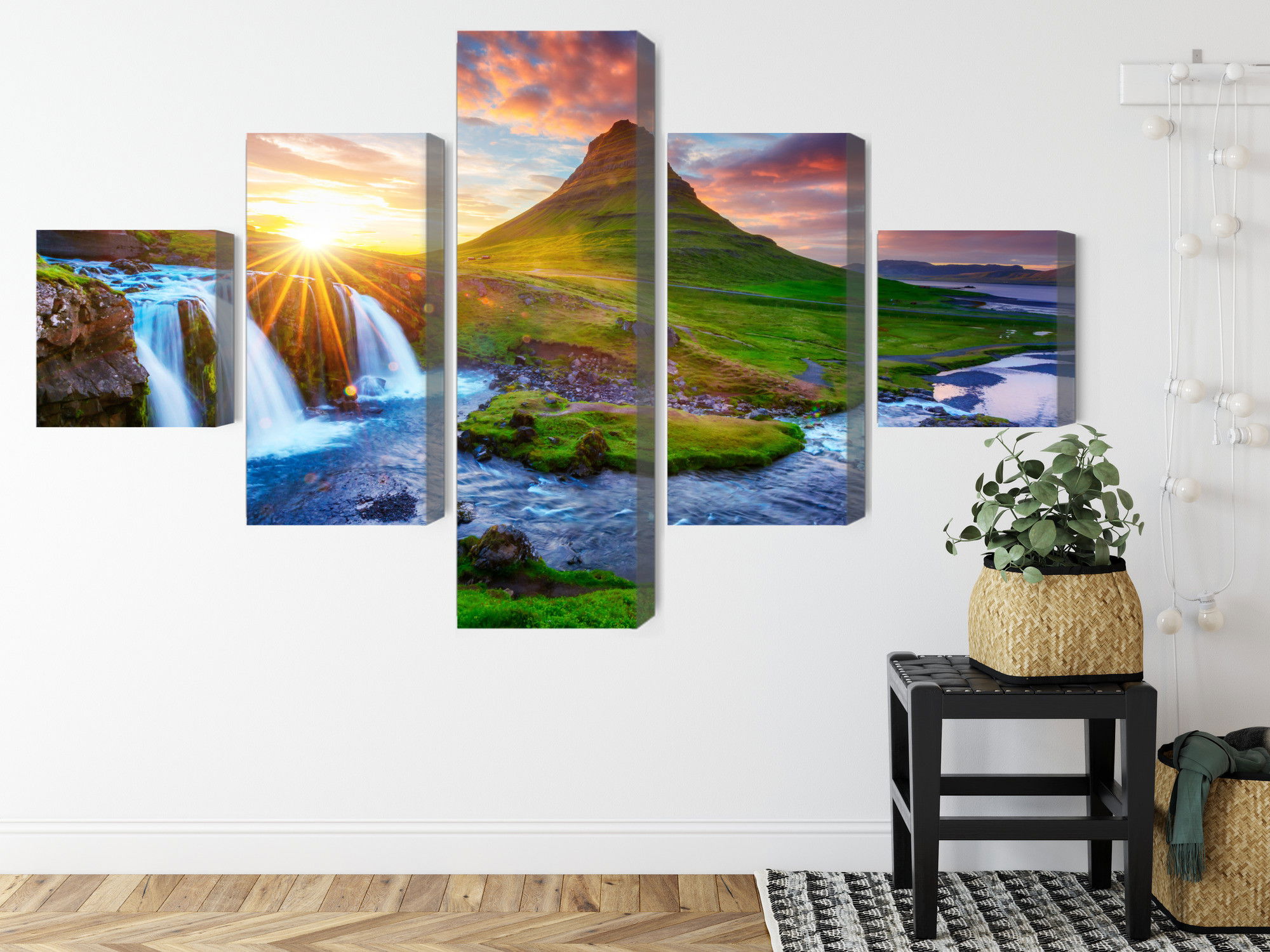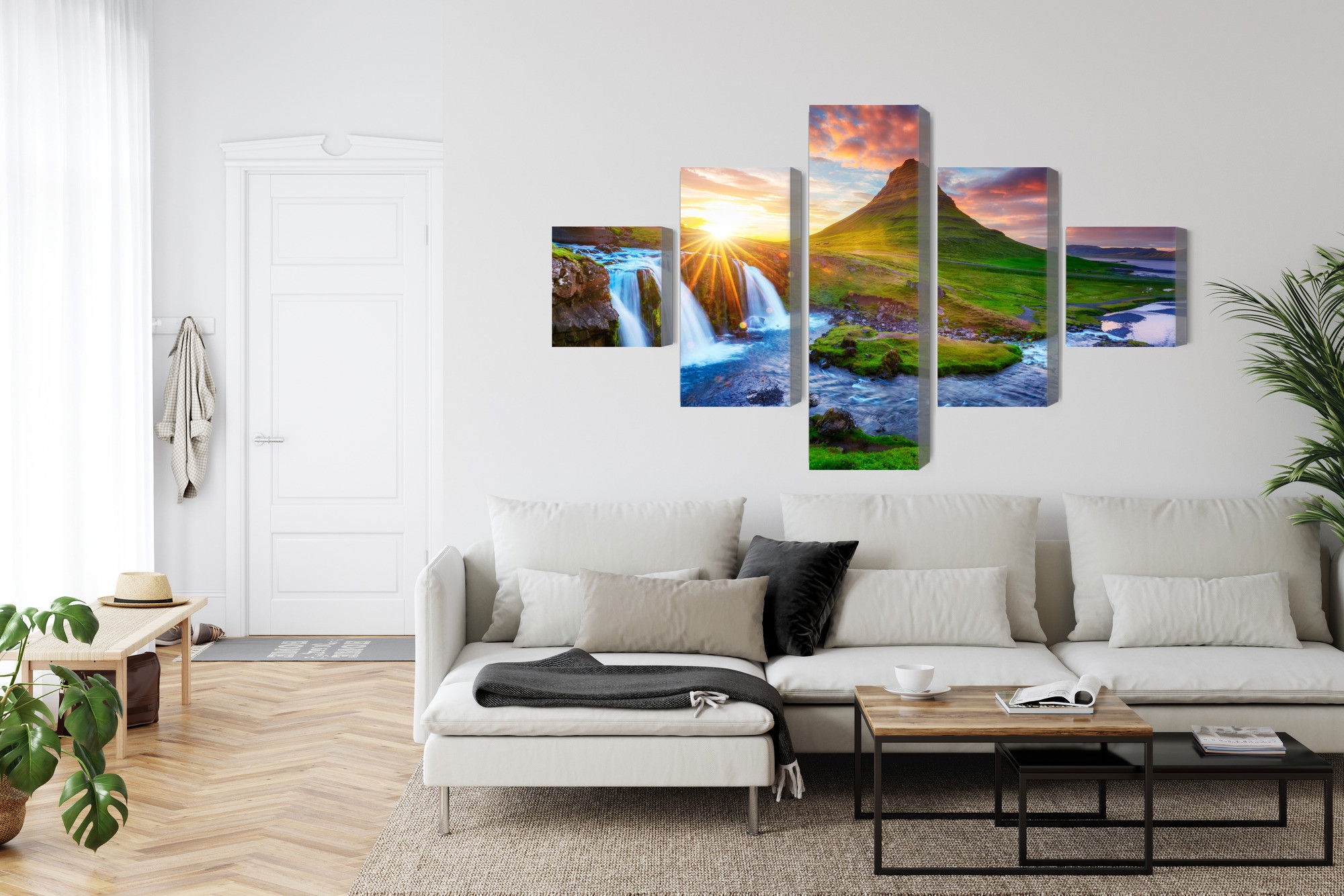 Varje tavla monteras på en massiv fururam. Format upp till 70×50 cm har en ram på 15 mm, medan format från 90×60 cm och uppåt har en ram på 20 mm. Den exakta dukspänningen gör att tavlan håller sin form över tid. Motivet View of the kirkjufellsfoss trycks runt hela ramen vilket ger ett stilrent galleriuttryck där tavlan är lika vacker från sidan som framifrån. Kombinationen av rak dukspänning, rena linjer och korrekt tryck ger en professionell finish.