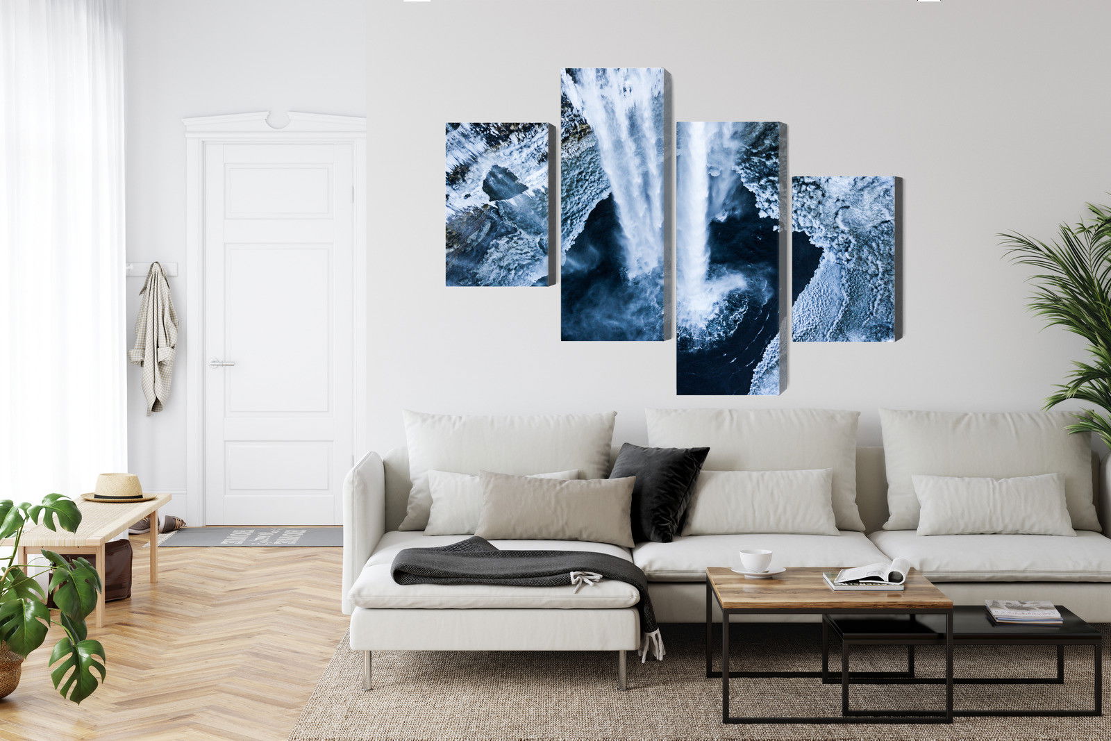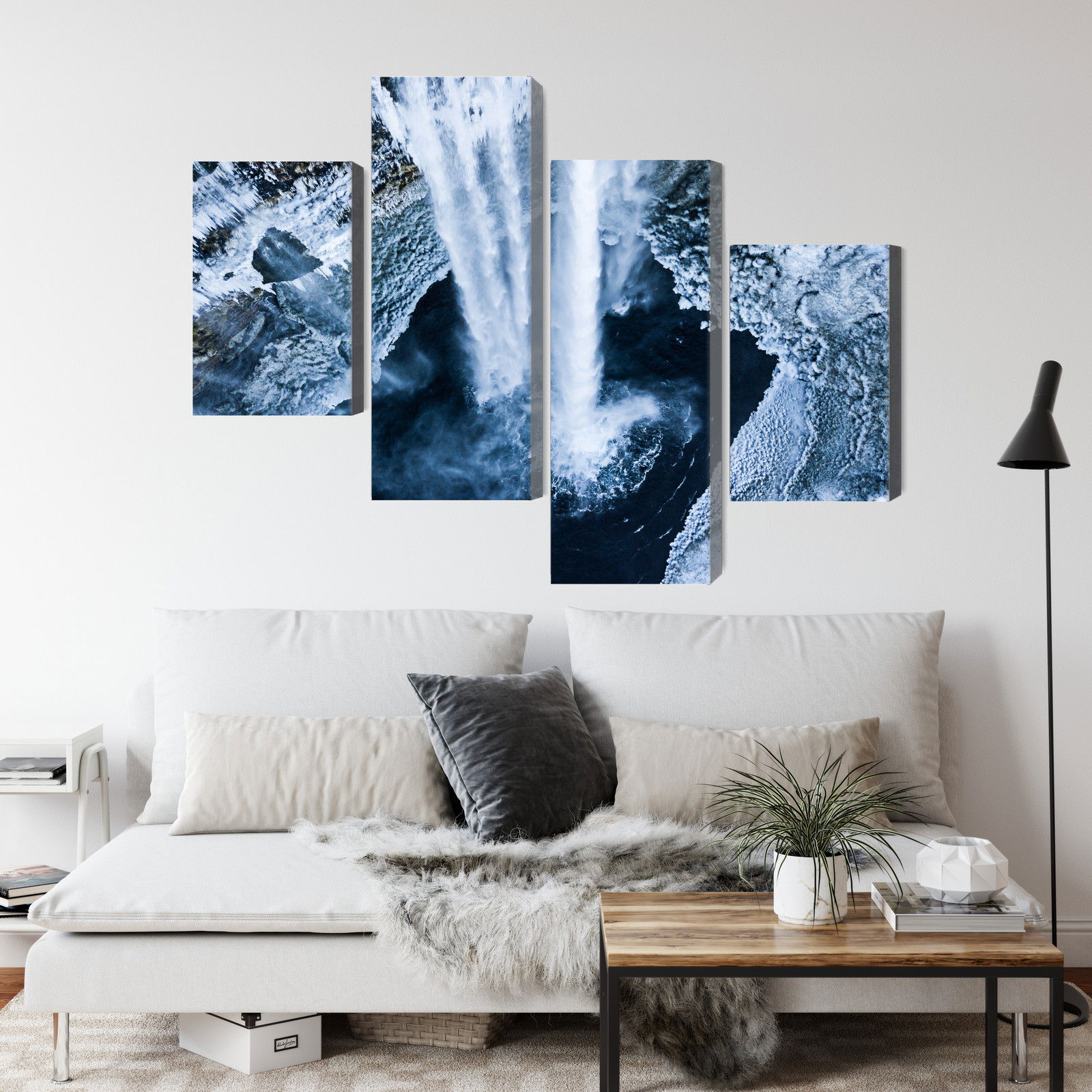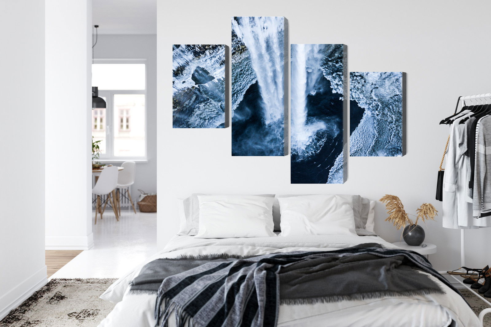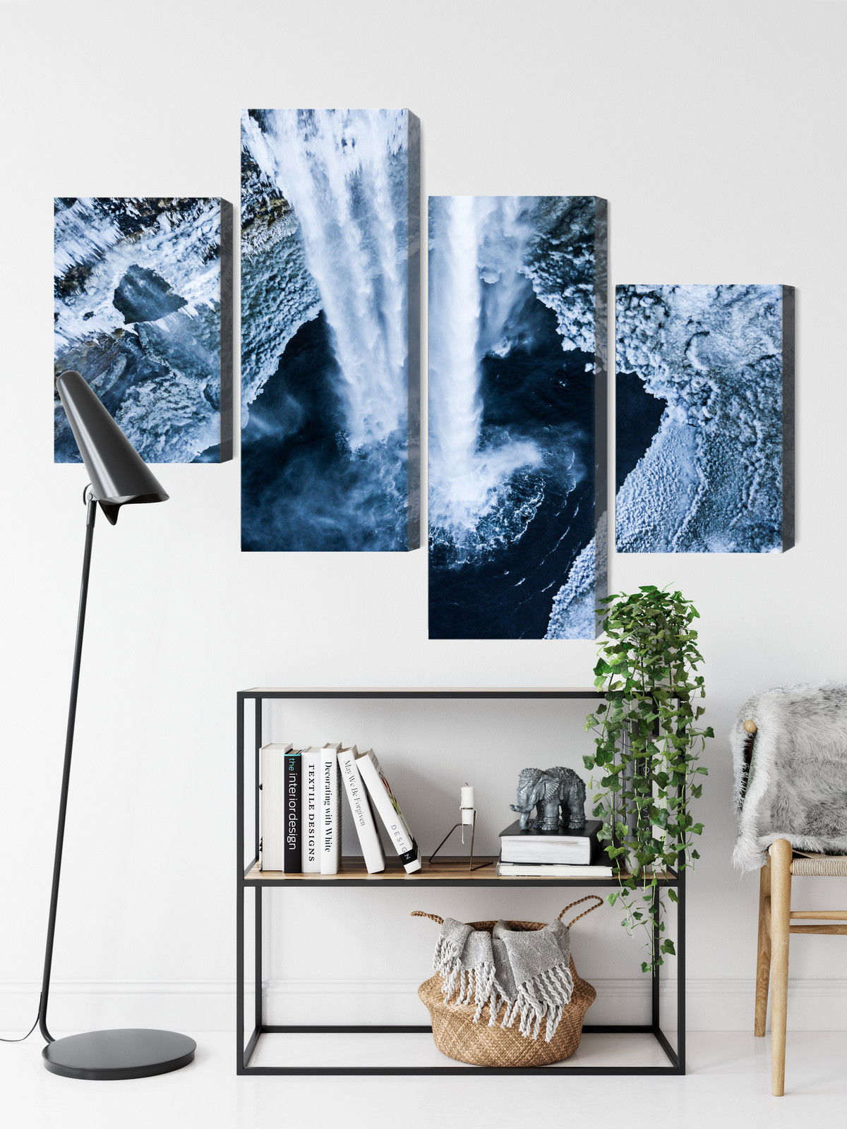 Varje tavla monteras på en massiv fururam. Format upp till 70×50 cm har en ram på 15 mm, medan format från 90×60 cm och uppåt har en ram på 20 mm. Den exakta dukspänningen gör att tavlan håller sin form över tid. Motivet Winter waterfall trycks runt hela ramen vilket ger ett stilrent galleriuttryck där tavlan är lika vacker från sidan som framifrån. Kombinationen av rak dukspänning, rena linjer och korrekt tryck ger en professionell finish.