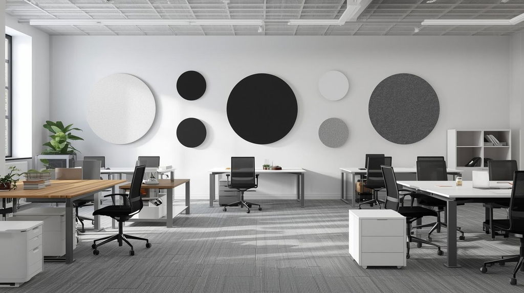 Ljudabsorbering till vägg - PES wall 1200x900mm svart, vit och grå i rymligt kontor.