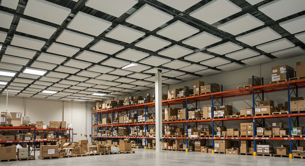 Takabsorbenter är ofta den mest effektiva första åtgärden i industrilokaler med hög takhöjd och stora fria ytor.