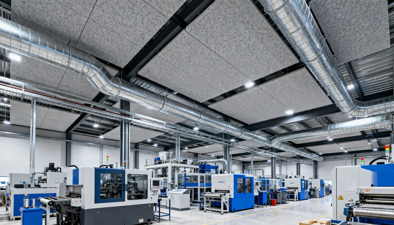 I en produktionshall uppstår ljudproblem sällan från en enda källa. Ofta samverkar maskinbuller, ventilation, trucktrafik, hårda väggar, plåttak och stora öppna volymer så att den totala ljudmiljön blir ansträngande. Därför behöver man skilja på vad som ska ljudabsorberas i rummet och vad som behöver ljudisoleras eller vibrationsdämpas som kompletterande åtgärder. När målet är att minska eko, korta efterklangen och förbättra taluppfattningen är ljudabsorbering nästan alltid första prioritet i en industrilokal.