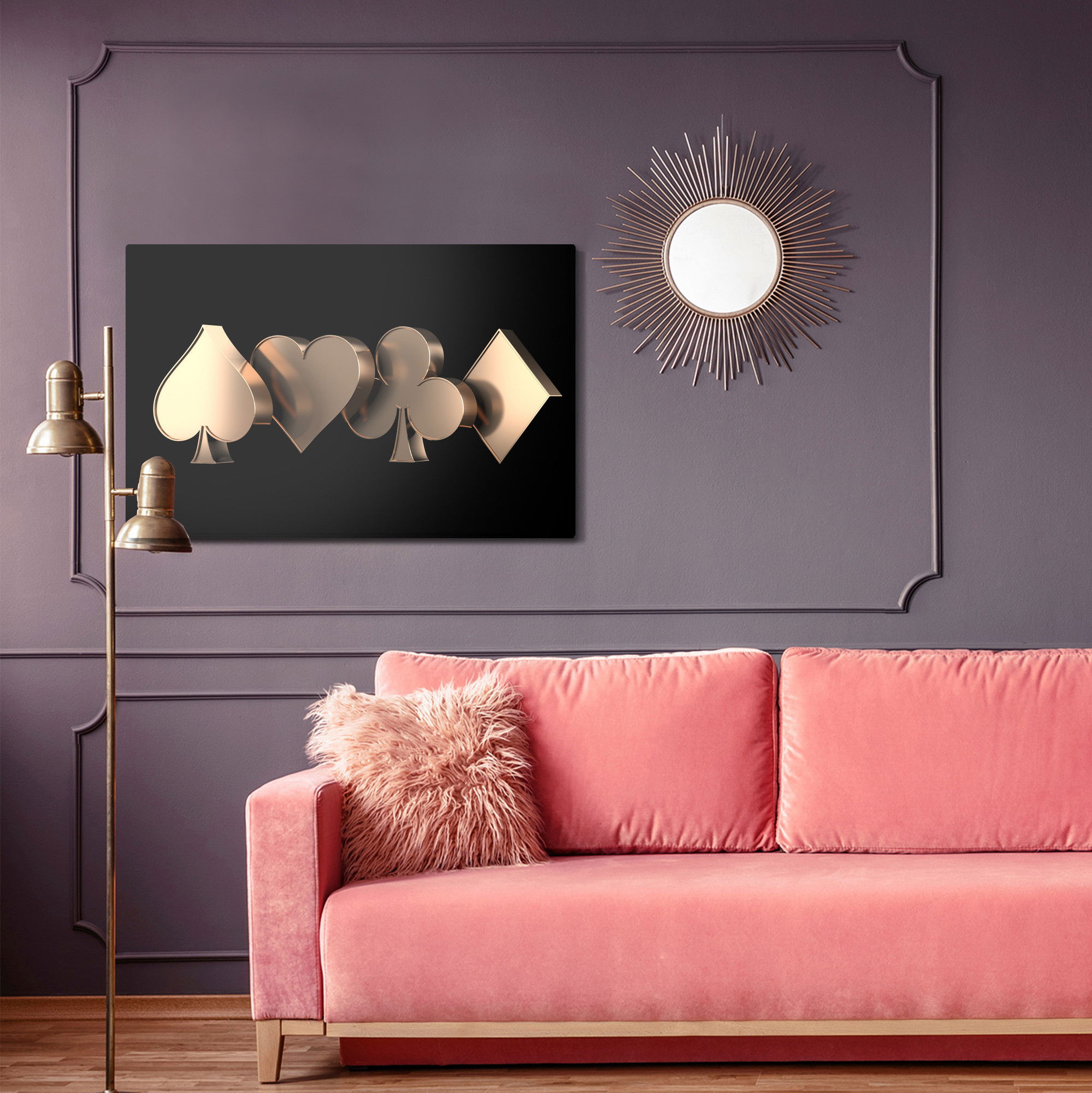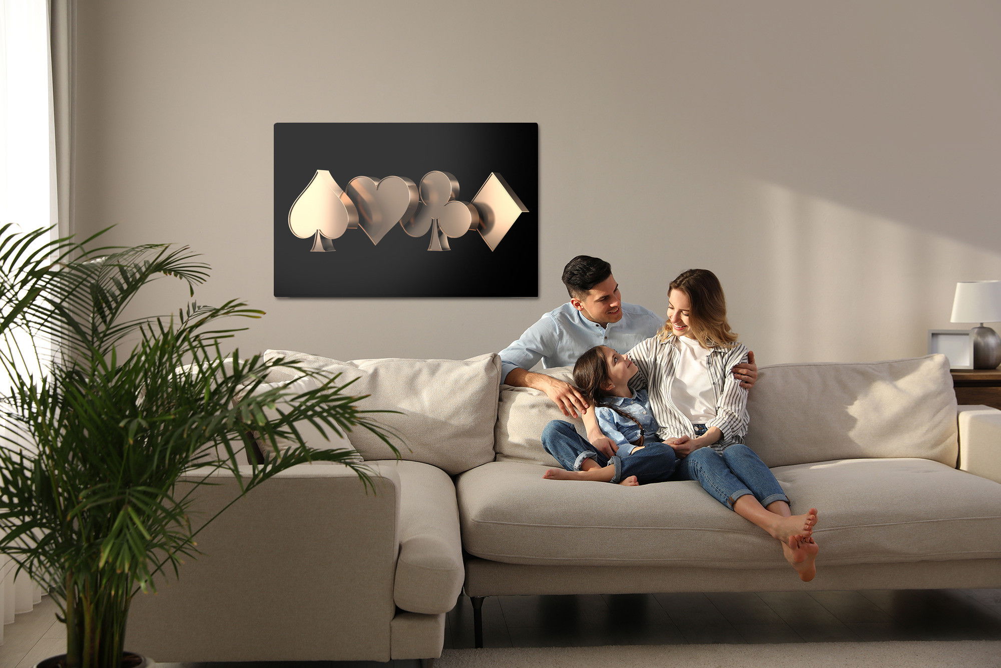 Motivet 3d card symbols återges med hög färgprecision och detaljrikedom tack vare HP Latex-teknologi. Trycket sker med vattenbaserade, luktfria och GREENGUARD Gold-certifierade bläck som ger en upplösning på upp till 300 DPI. Färgerna är UV-beständiga och behåller sin styrka även i ljusa rum, vilket gör tavlan lämplig för både hem- och offentliga miljöer.