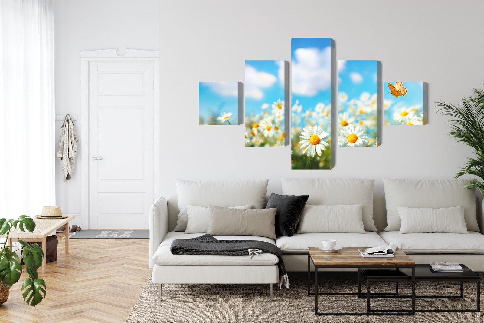 SilentDirects ljuddämpande tavla 3d daisy field kombinerar ett högupplöst motiv med avancerad akustikteknik. Varje tavla monteras i Sverige och bygger på en stabil canvastavla med fururam, där insidan av ramen fylls med en ljudabsorberande kärna av återvunnen polyester. Konstruktionen gör tavlan till ett både estetiskt och funktionellt inslag i rummet.