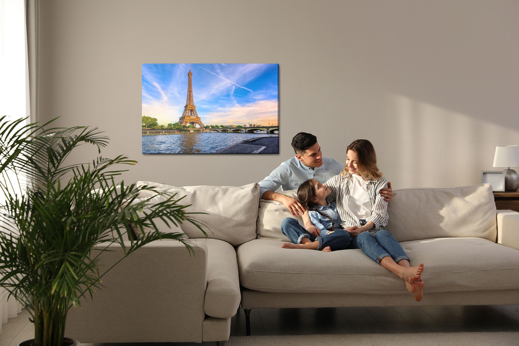 Motivet 3d view of the seine återges med hög färgprecision och detaljrikedom tack vare HP Latex-teknologi. Trycket sker med vattenbaserade, luktfria och GREENGUARD Gold-certifierade bläck som ger en upplösning på upp till 300 DPI. Färgerna är UV-beständiga och behåller sin styrka även i ljusa rum, vilket gör tavlan lämplig för både hem- och offentliga miljöer.