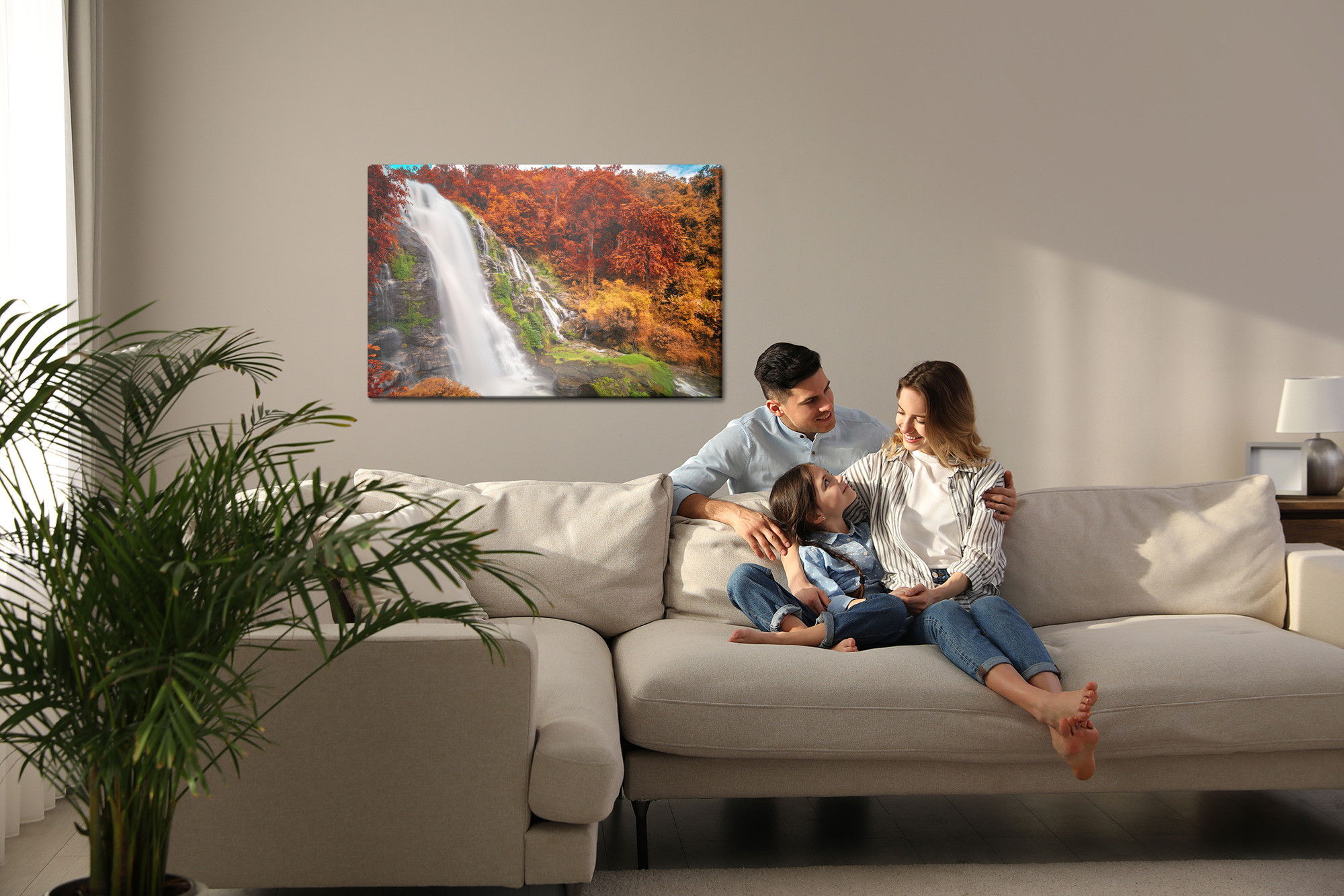Varje tavla monteras på en massiv fururam. Format upp till 70×50 cm har en ram på 15 mm, medan format från 90×60 cm och uppåt har en ram på 20 mm. Den exakta dukspänningen gör att tavlan håller sin form över tid. Motivet 3d view of the waterfall trycks runt hela ramen vilket ger ett stilrent galleriuttryck där tavlan är lika vacker från sidan som framifrån. Kombinationen av rak dukspänning, rena linjer och korrekt tryck ger en professionell finish.