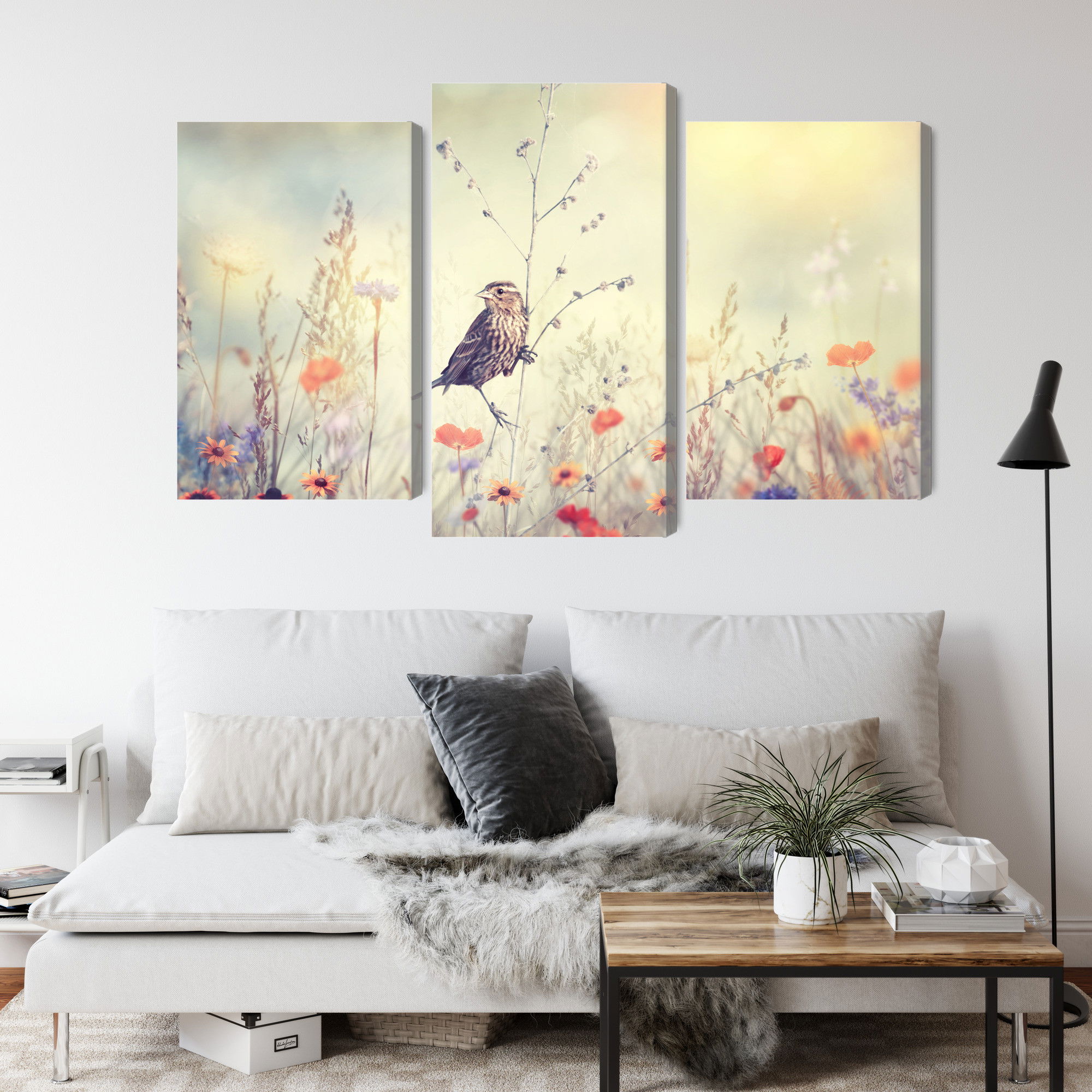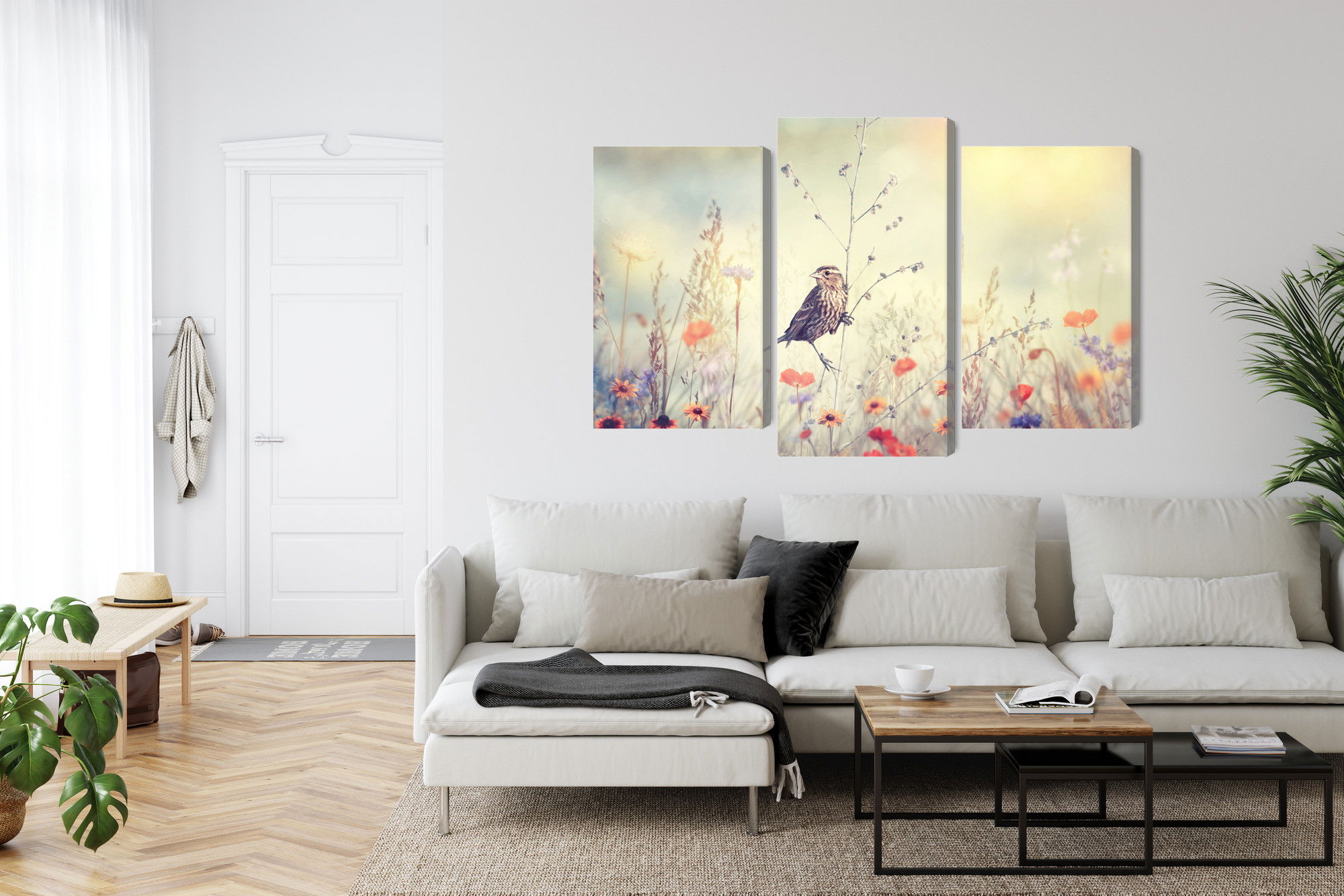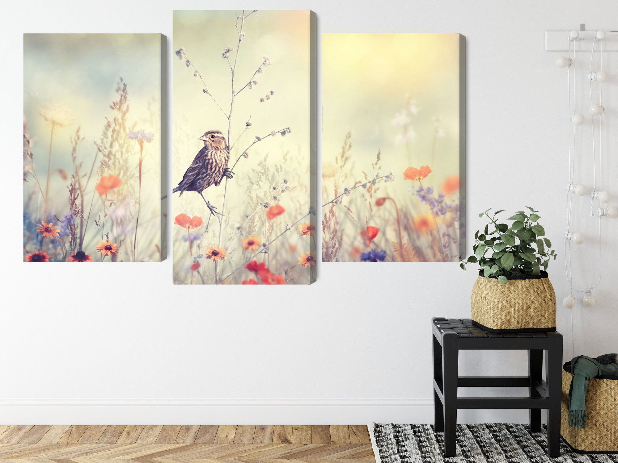 Ljuddämpande tavla – A bird among wild flowers för lugnare rum och mjukare akustik