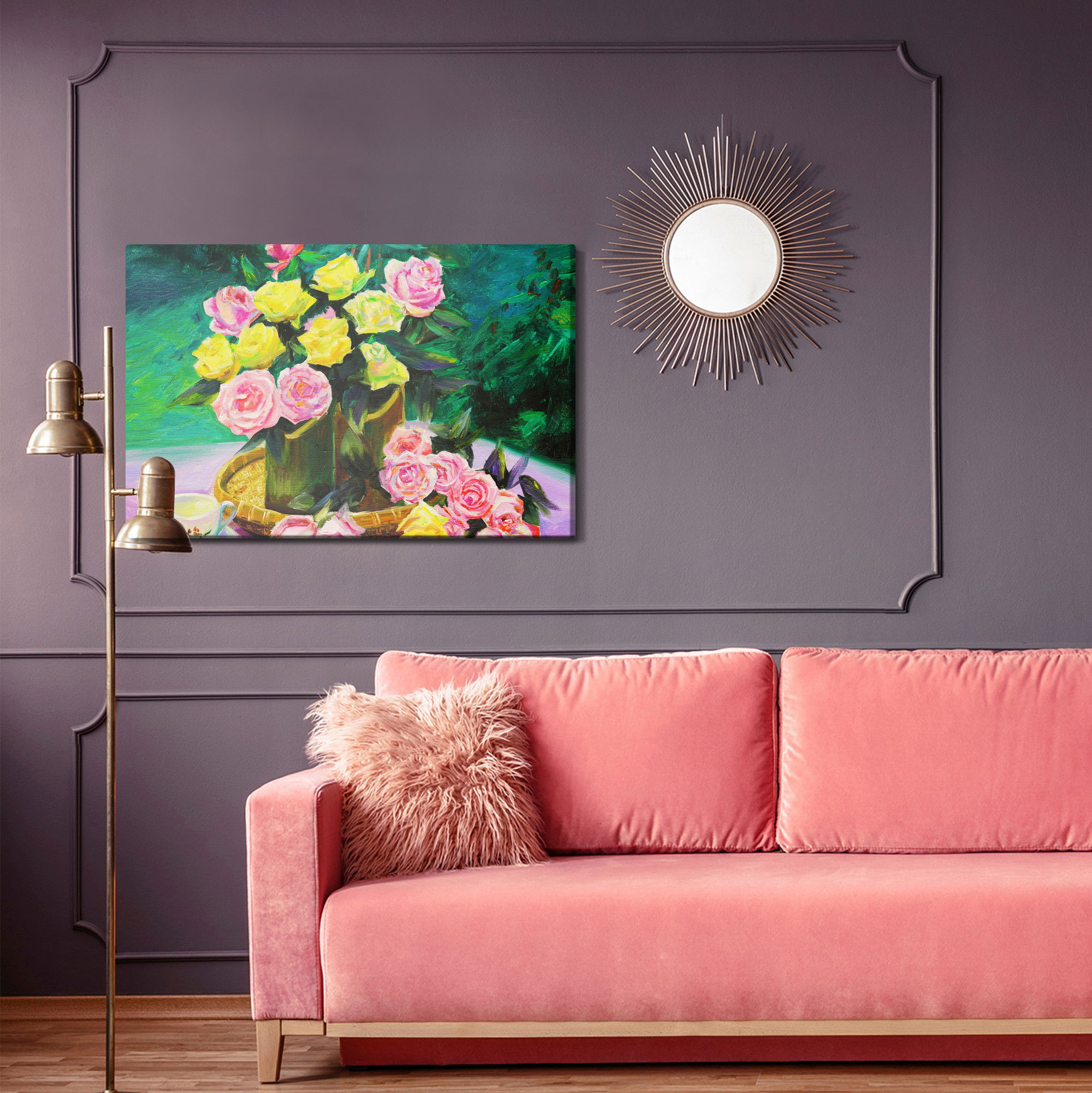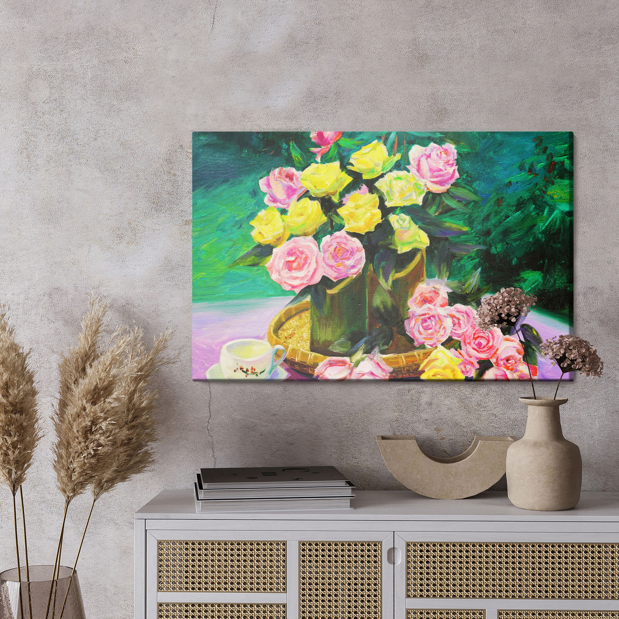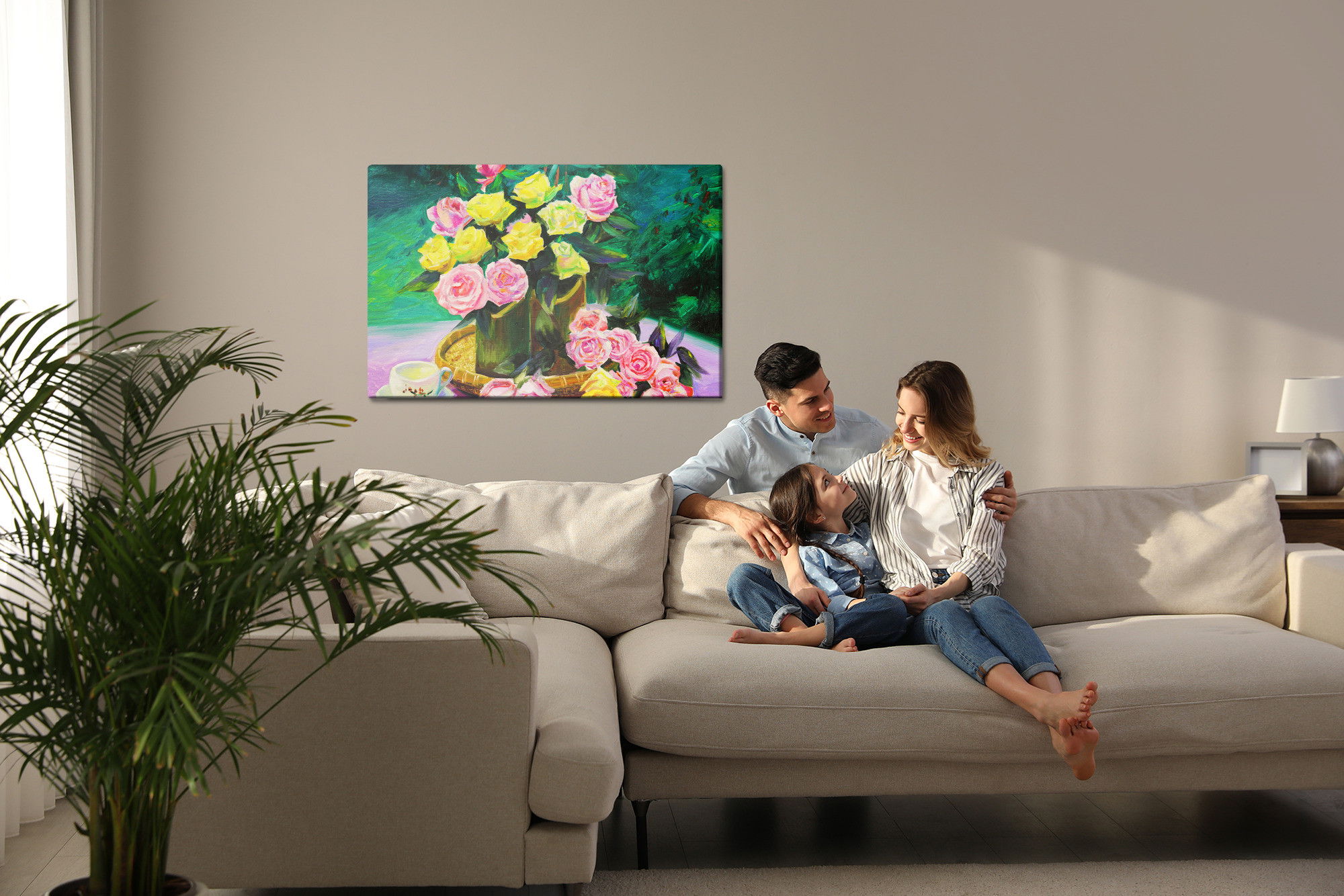 Motivet A bouquet of roses as painted återges med hög färgprecision och detaljrikedom tack vare HP Latex-teknologi. Trycket sker med vattenbaserade, luktfria och GREENGUARD Gold-certifierade bläck som ger en upplösning på upp till 300 DPI. Färgerna är UV-beständiga och behåller sin styrka även i ljusa rum, vilket gör tavlan lämplig för både hem- och offentliga miljöer.