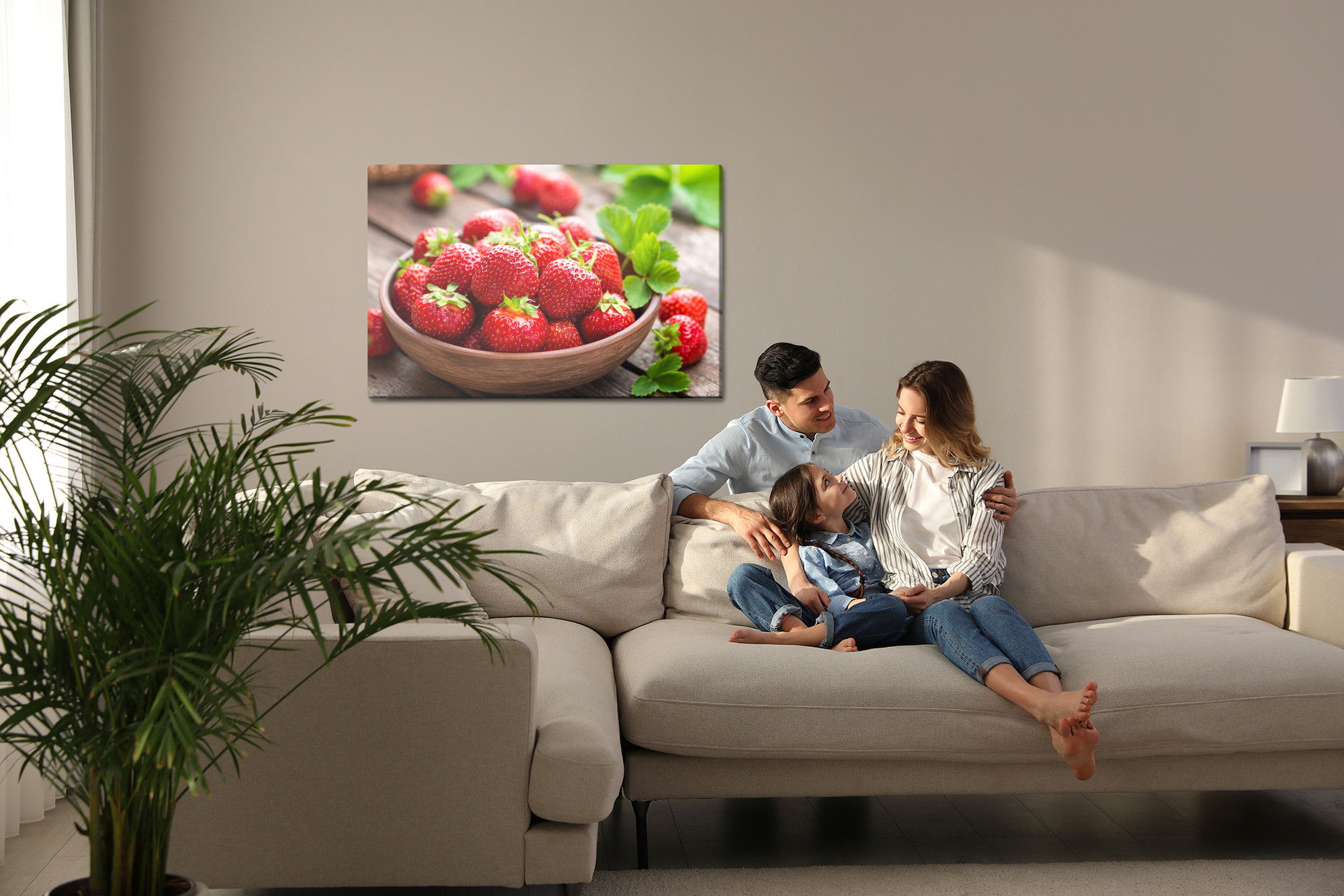 Motivet A bowl of strawberries återges med hög färgprecision och detaljrikedom tack vare HP Latex-teknologi. Trycket sker med vattenbaserade, luktfria och GREENGUARD Gold-certifierade bläck som ger en upplösning på upp till 300 DPI. Färgerna är UV-beständiga och behåller sin styrka även i ljusa rum, vilket gör tavlan lämplig för både hem- och offentliga miljöer.