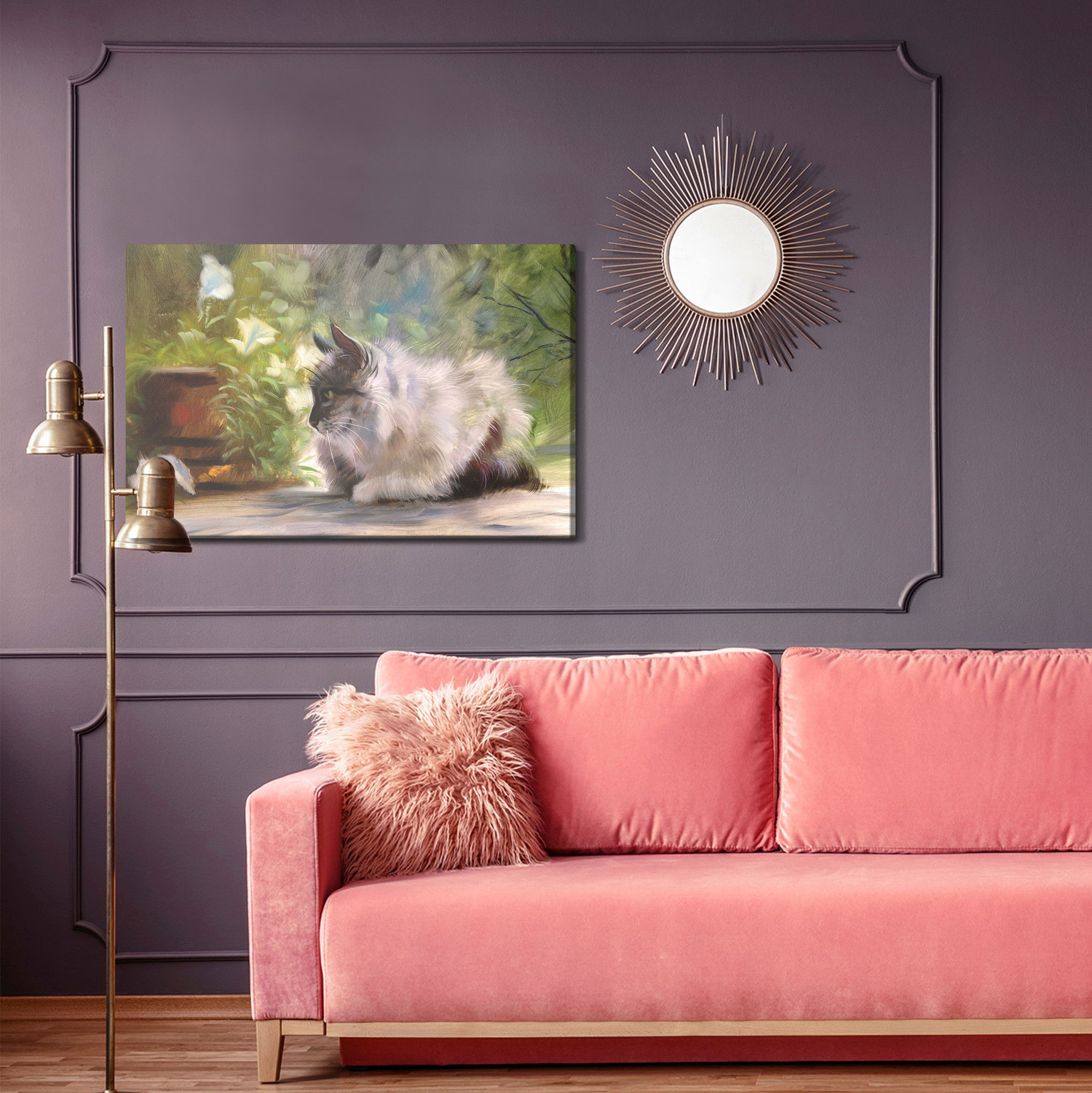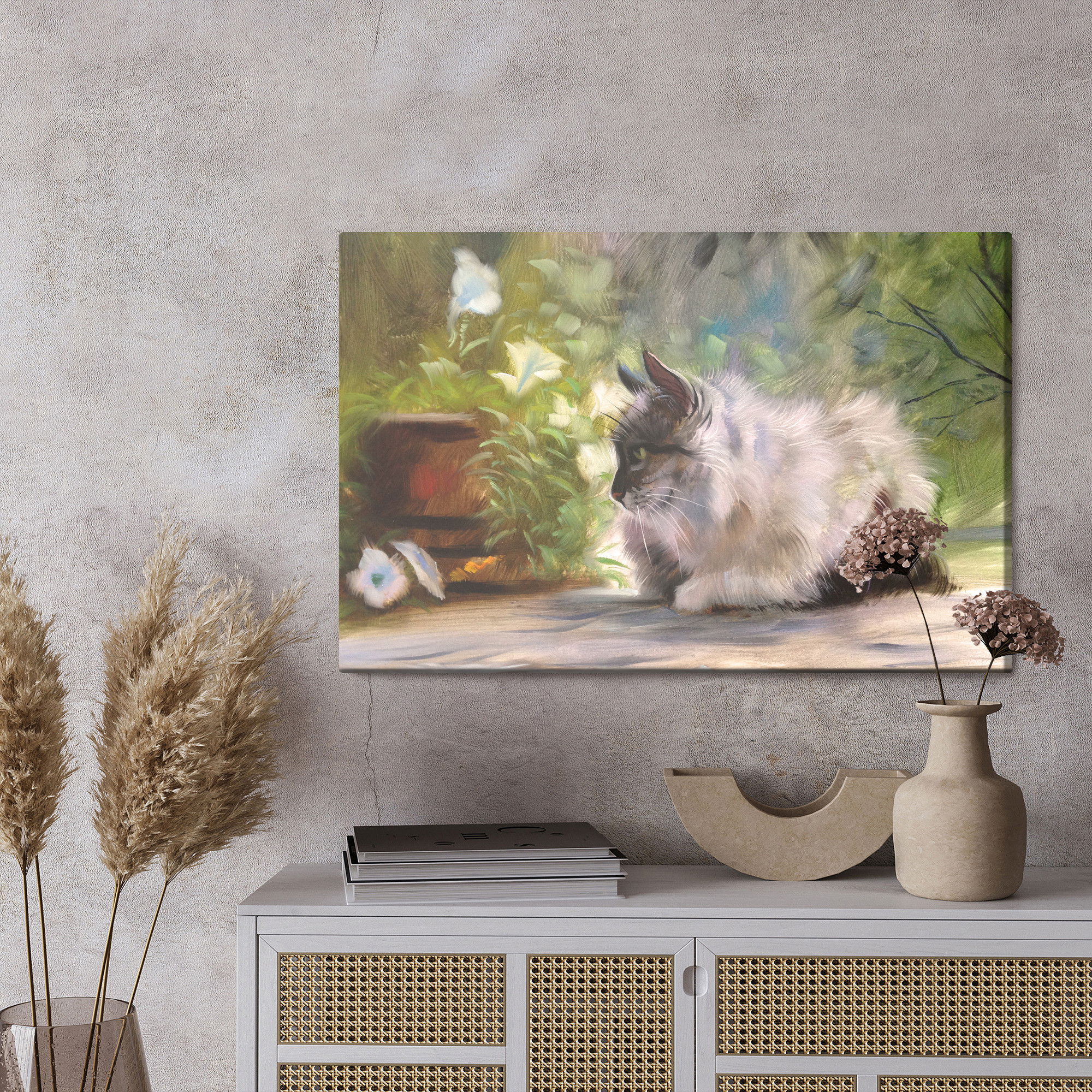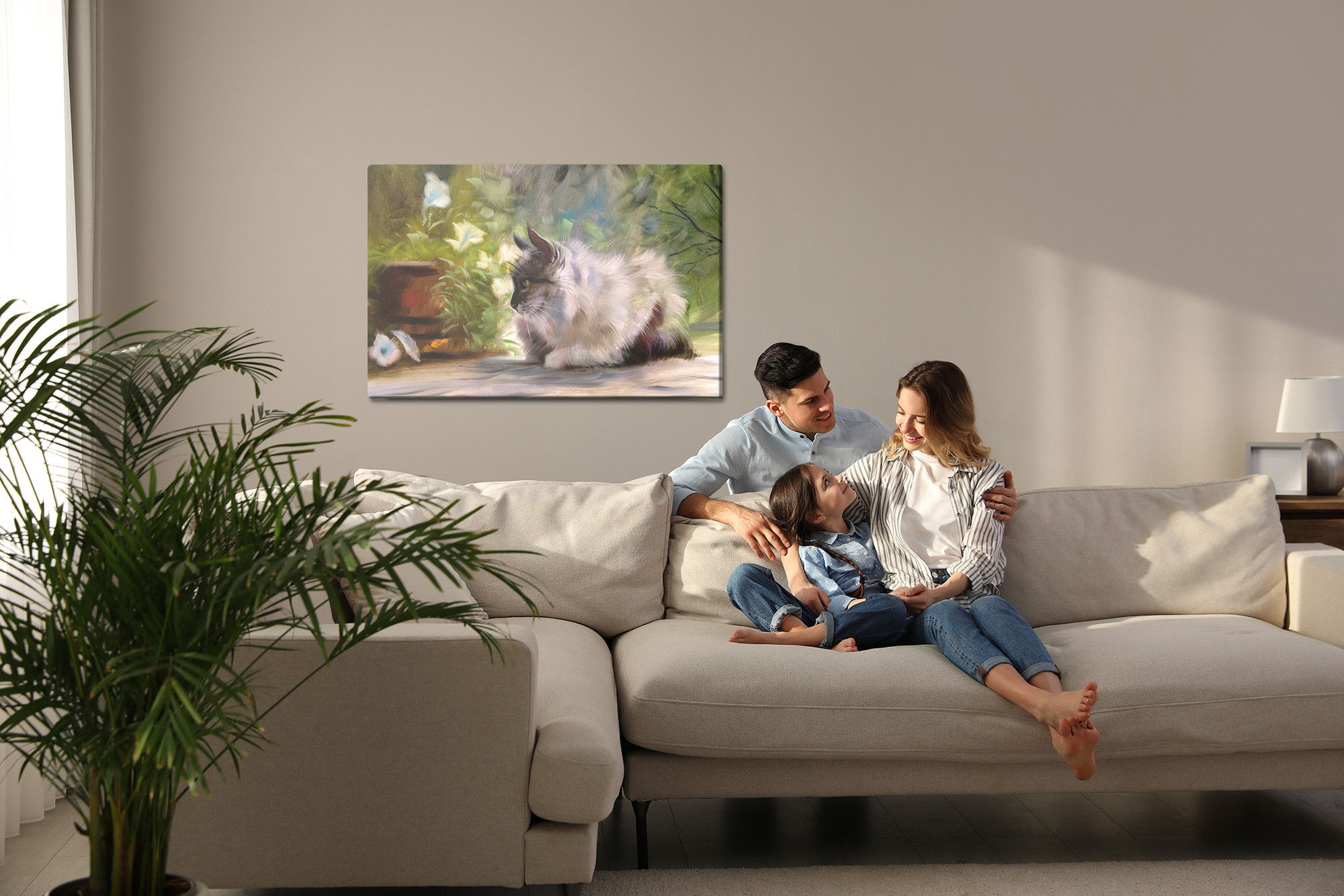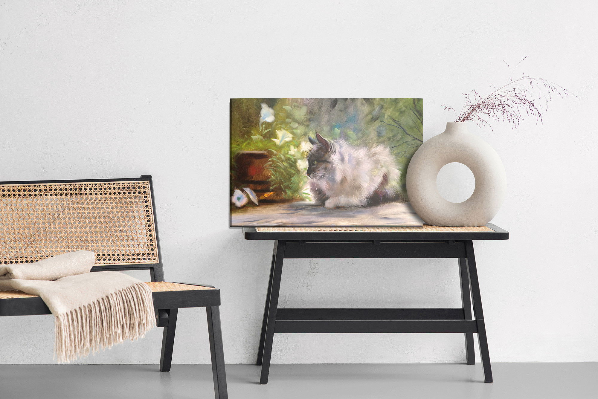 Varje tavla monteras på en massiv fururam. Format upp till 70×50 cm har en ram på 15 mm, medan format från 90×60 cm och uppåt har en ram på 20 mm. Den exakta dukspänningen gör att tavlan håller sin form över tid. Motivet A cat among the green trycks runt hela ramen vilket ger ett stilrent galleriuttryck där tavlan är lika vacker från sidan som framifrån. Kombinationen av rak dukspänning, rena linjer och korrekt tryck ger en professionell finish.