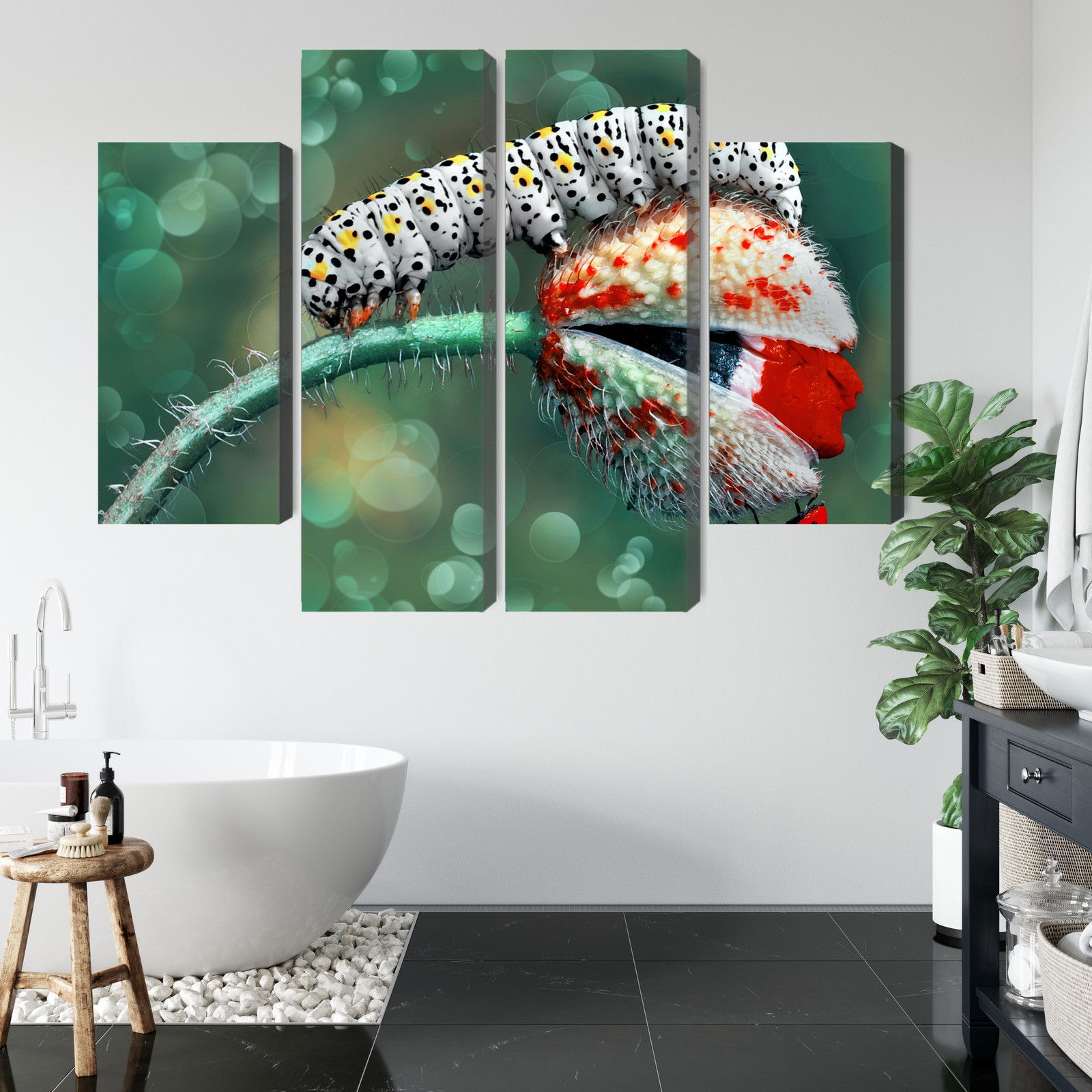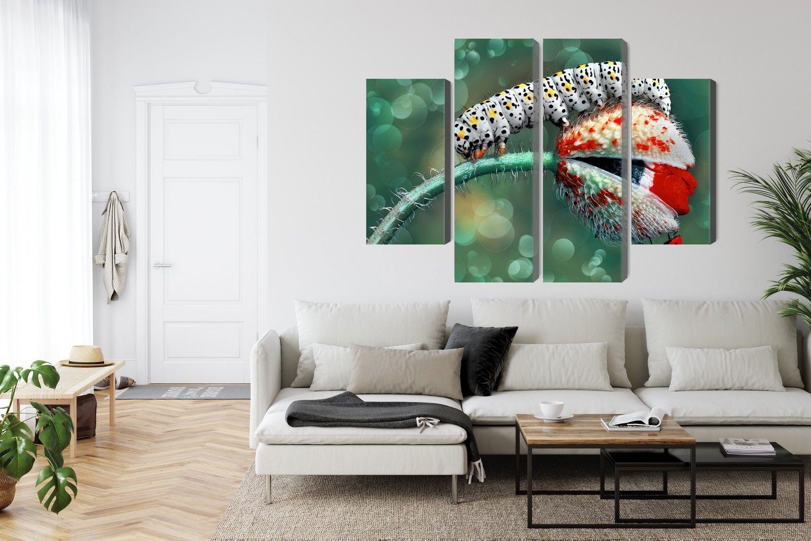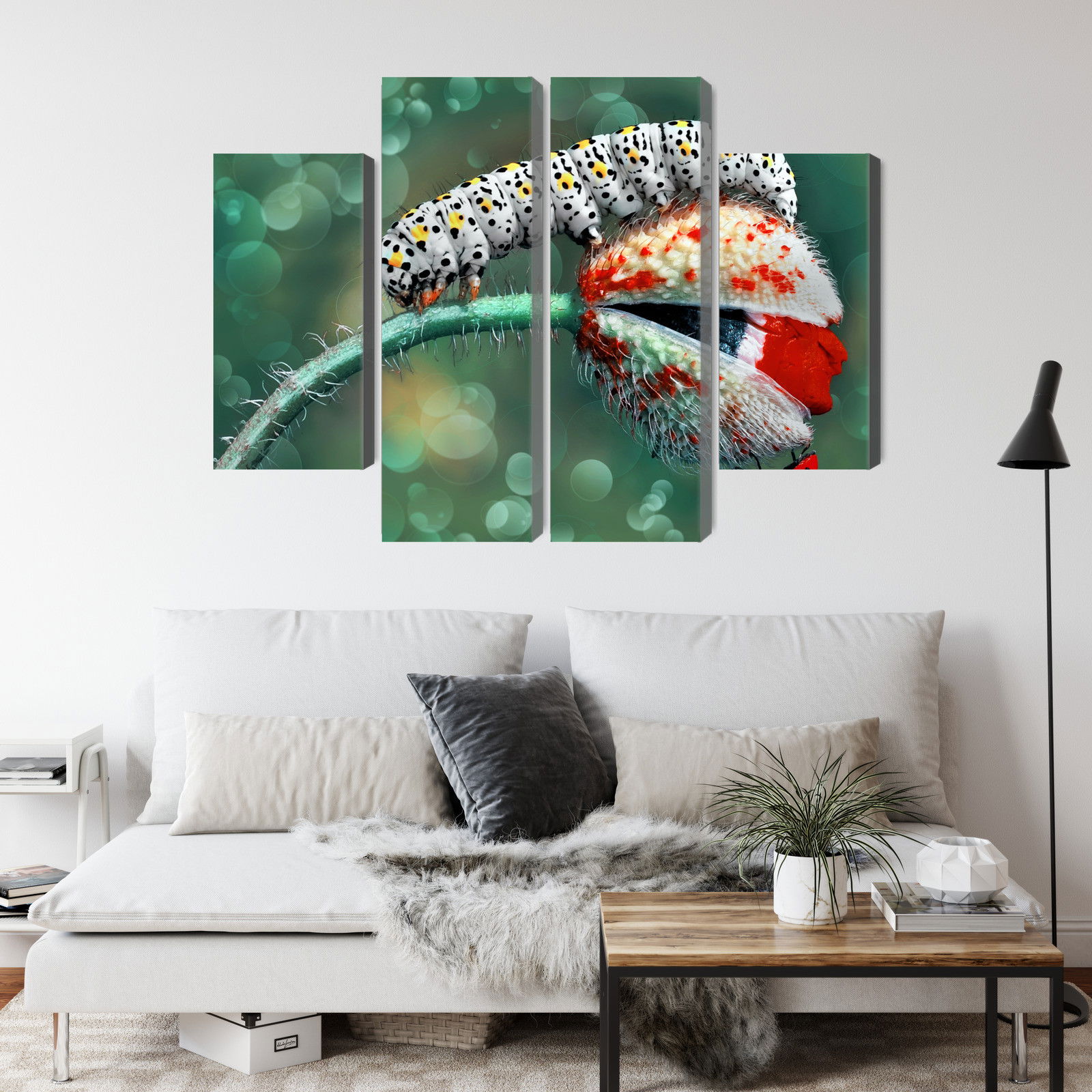 Motivet A caterpillar and a ladybug återges med hög färgprecision och detaljrikedom tack vare HP Latex-teknologi. Trycket sker med vattenbaserade, luktfria och GREENGUARD Gold-certifierade bläck som ger en upplösning på upp till 300 DPI. Färgerna är UV-beständiga och behåller sin styrka även i ljusa rum, vilket gör tavlan lämplig för både hem- och offentliga miljöer.