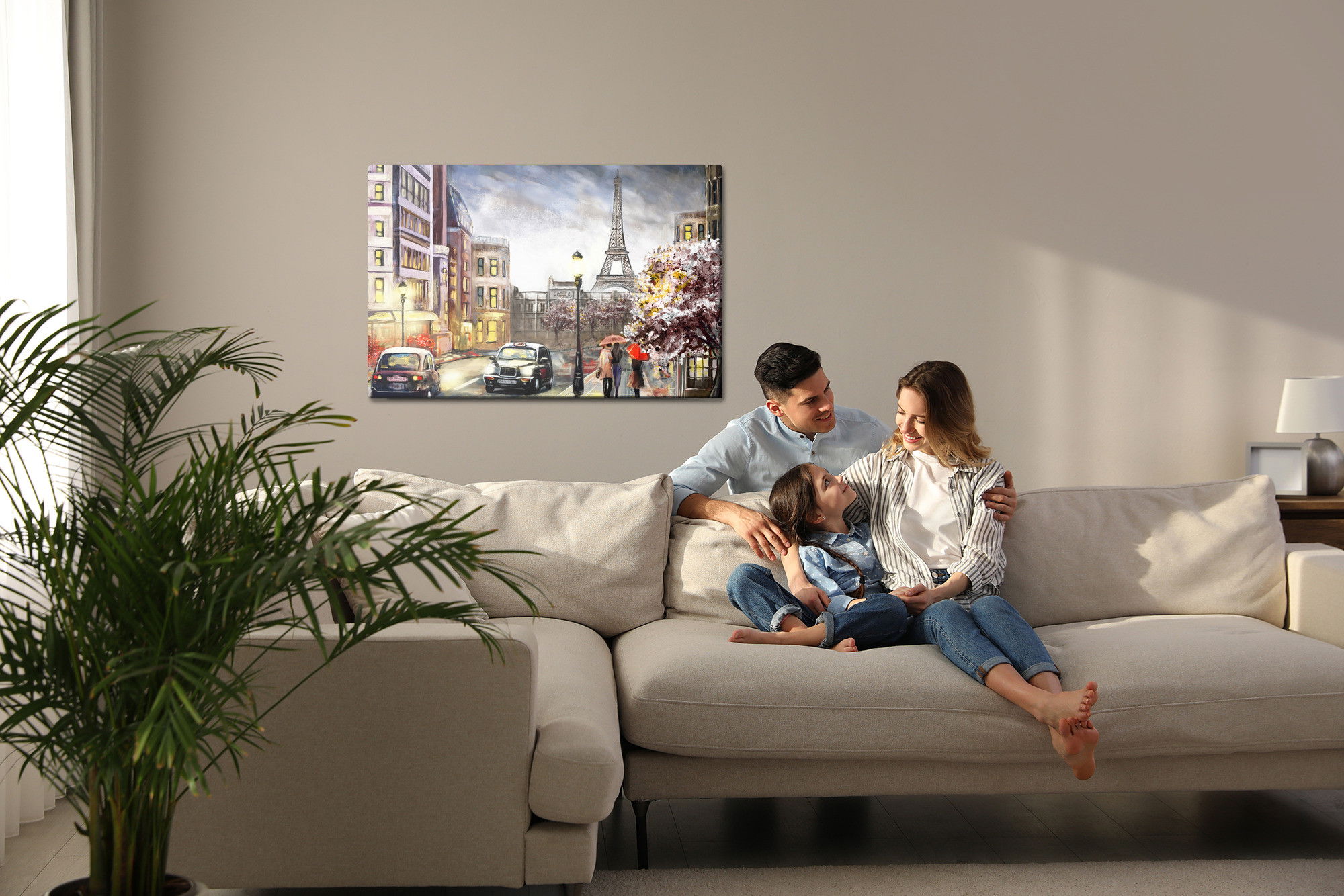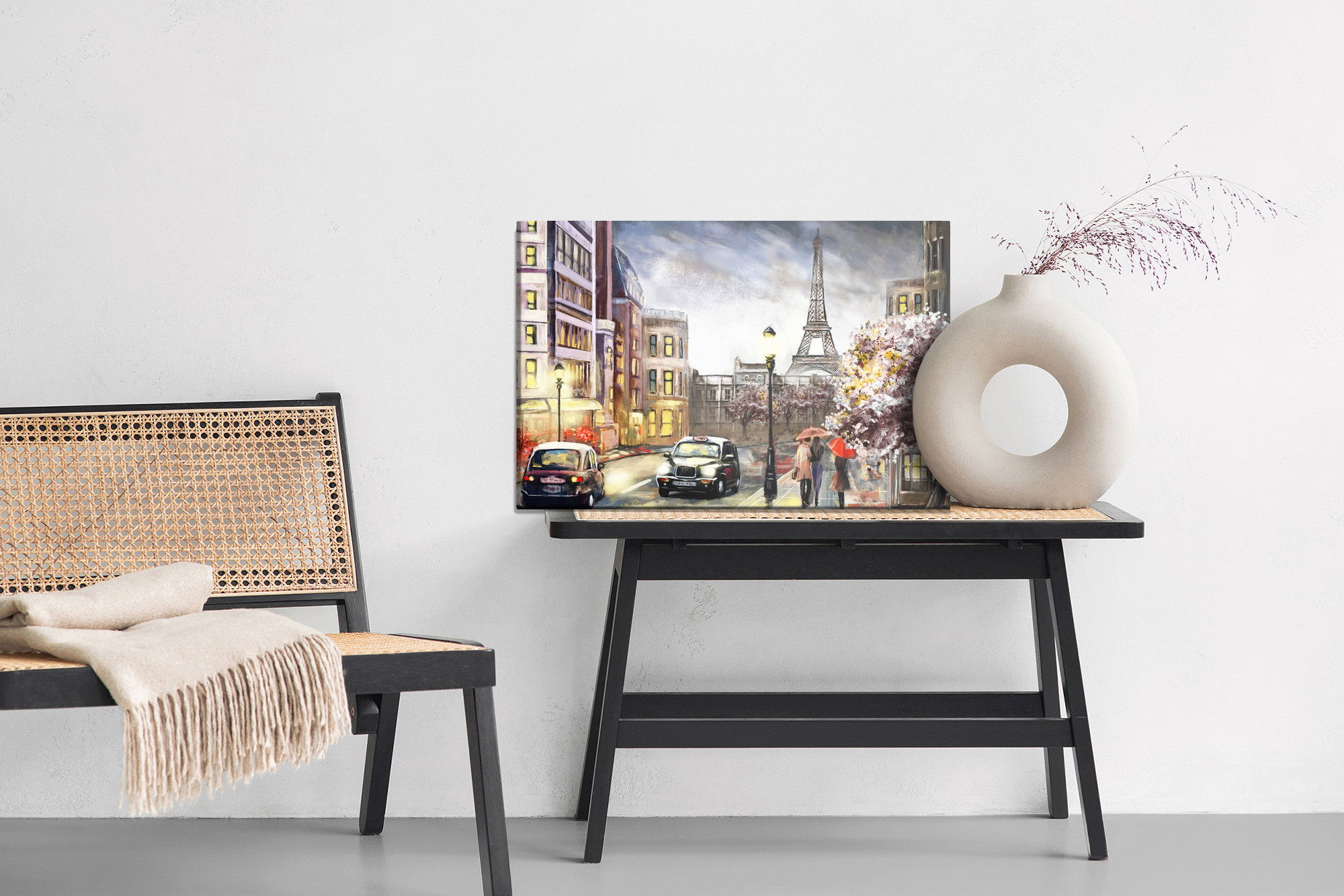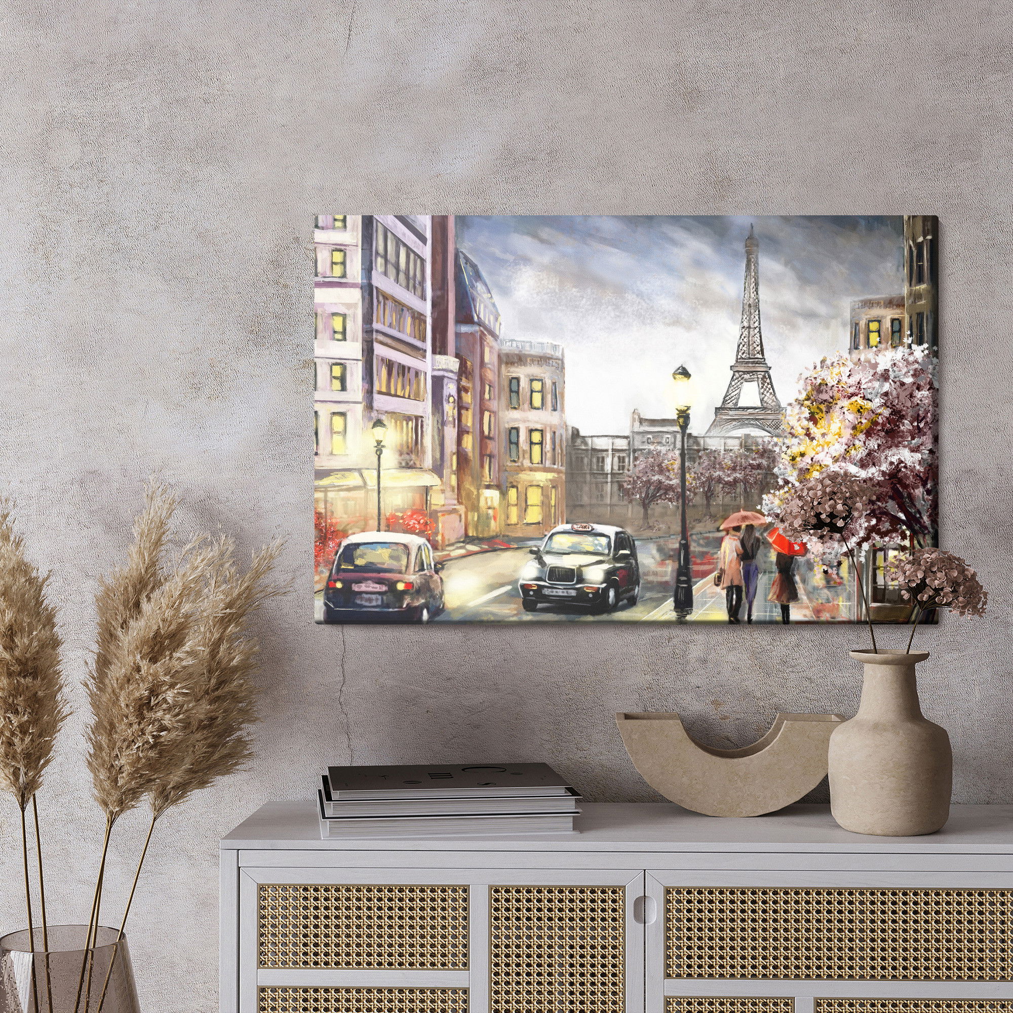 Varje tavla monteras på en massiv fururam. Format upp till 70×50 cm har en ram på 15 mm, medan format från 90×60 cm och uppåt har en ram på 20 mm. Den exakta dukspänningen gör att tavlan håller sin form över tid. Motivet A cloudy day in Paris trycks runt hela ramen vilket ger ett stilrent galleriuttryck där tavlan är lika vacker från sidan som framifrån. Kombinationen av rak dukspänning, rena linjer och korrekt tryck ger en professionell finish.
