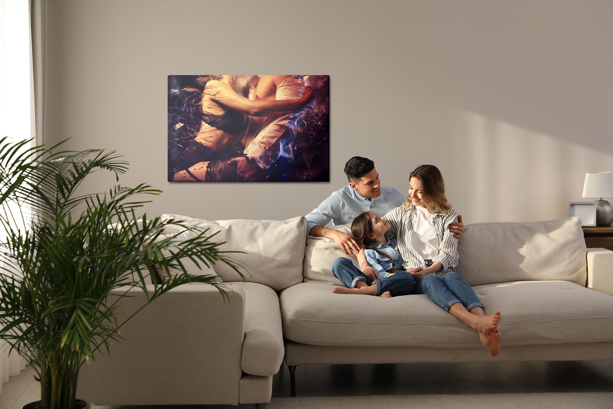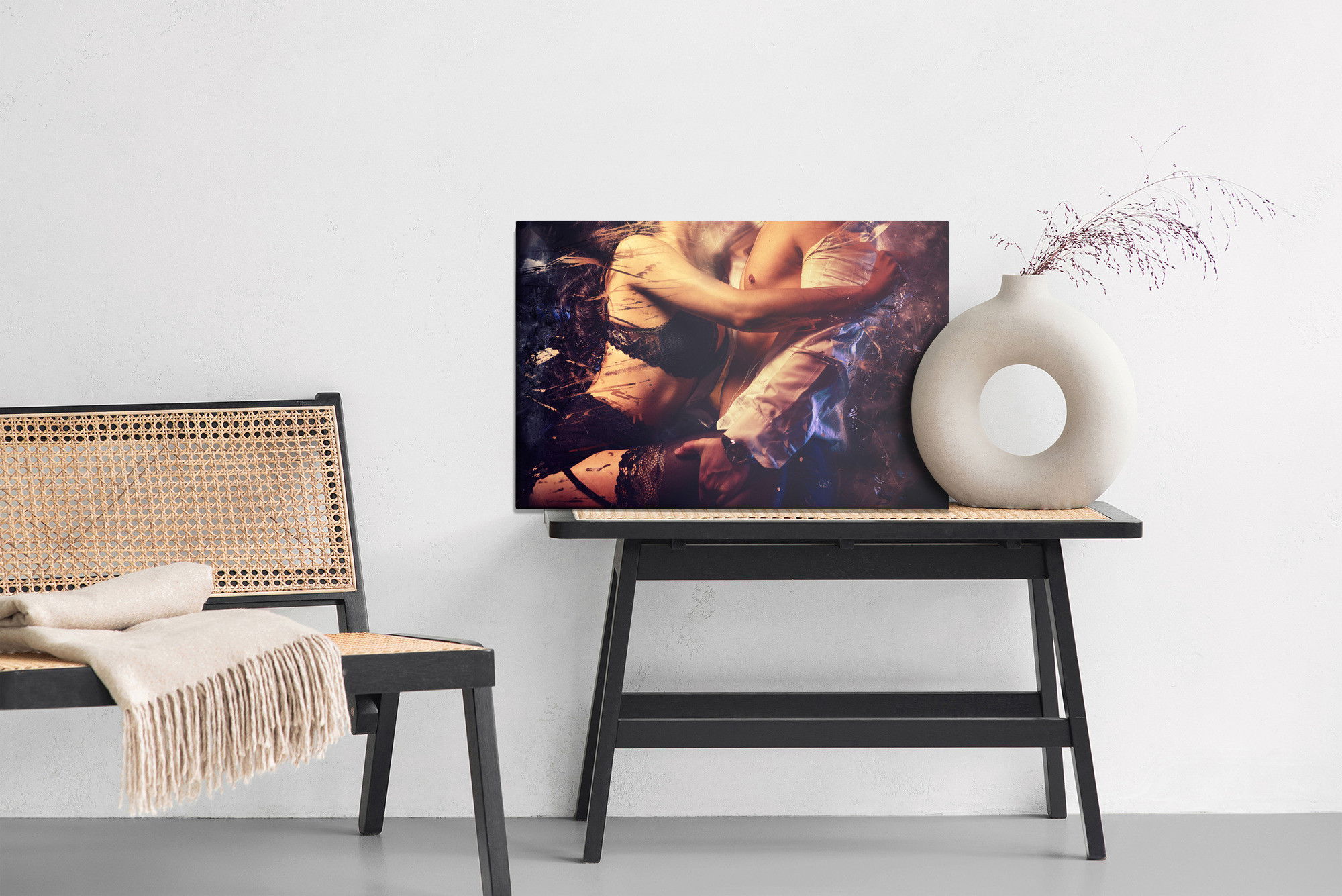 Varje tavla monteras på en massiv fururam. Format upp till 70×50 cm har en ram på 15 mm, medan format från 90×60 cm och uppåt har en ram på 20 mm. Den exakta dukspänningen gör att tavlan håller sin form över tid. Motivet A couple in a hot pose trycks runt hela ramen vilket ger ett stilrent galleriuttryck där tavlan är lika vacker från sidan som framifrån. Kombinationen av rak dukspänning, rena linjer och korrekt tryck ger en professionell finish.