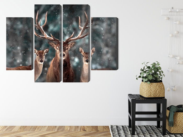 Motivet A deer and two does återges med hög färgprecision och detaljrikedom tack vare HP Latex-teknologi. Trycket sker med vattenbaserade, luktfria och GREENGUARD Gold-certifierade bläck som ger en upplösning på upp till 300 DPI. Färgerna är UV-beständiga och behåller sin styrka även i ljusa rum, vilket gör tavlan lämplig för både hem- och offentliga miljöer.
