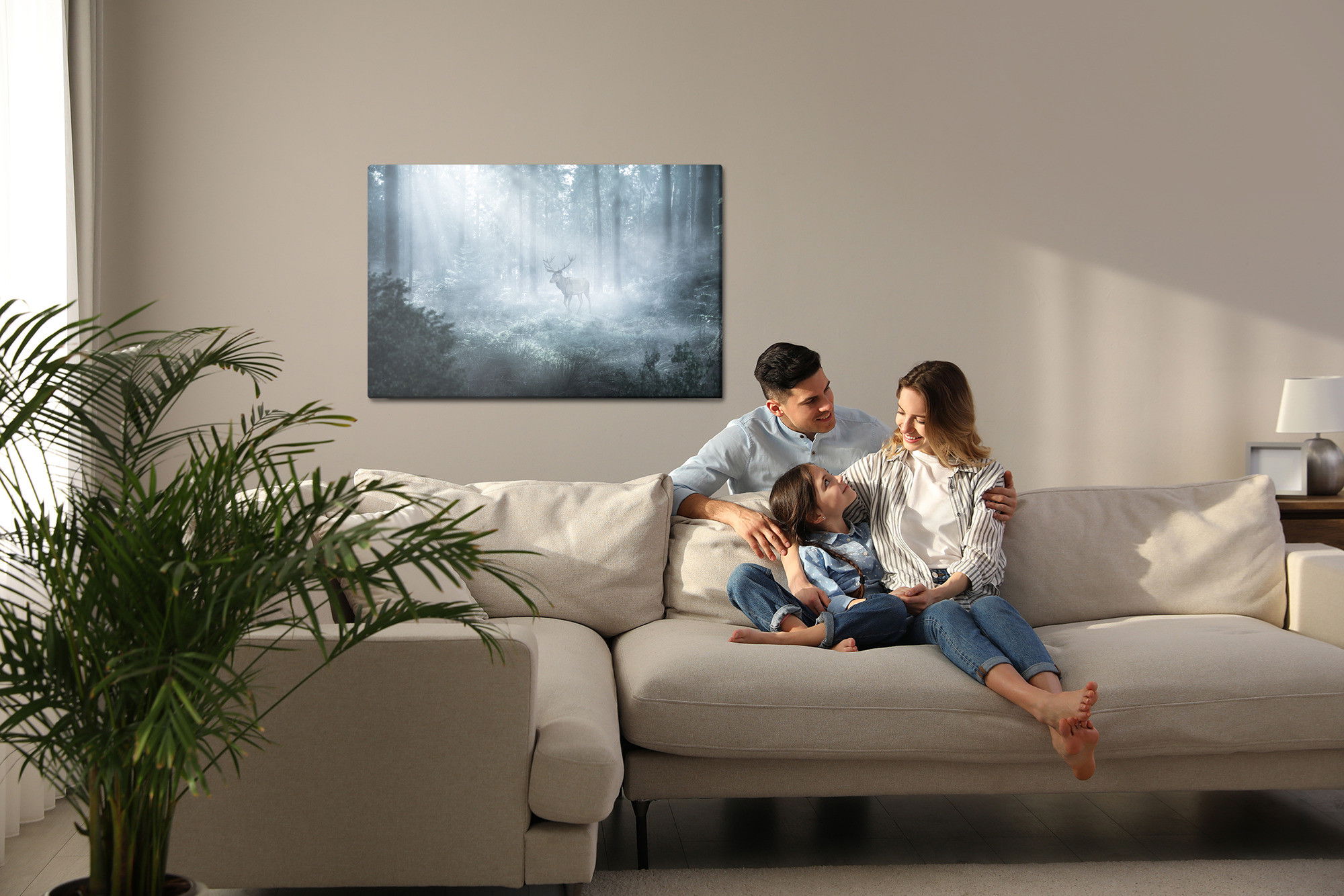 Varje tavla monteras på en massiv fururam. Format upp till 70×50 cm har en ram på 15 mm, medan format från 90×60 cm och uppåt har en ram på 20 mm. Den exakta dukspänningen gör att tavlan håller sin form över tid. Motivet A deer in a dark forest trycks runt hela ramen vilket ger ett stilrent galleriuttryck där tavlan är lika vacker från sidan som framifrån. Kombinationen av rak dukspänning, rena linjer och korrekt tryck ger en professionell finish.