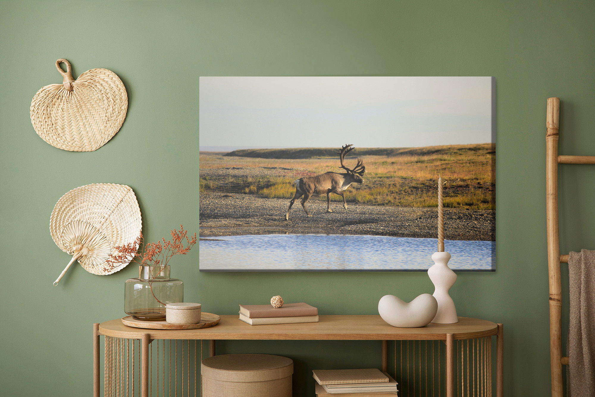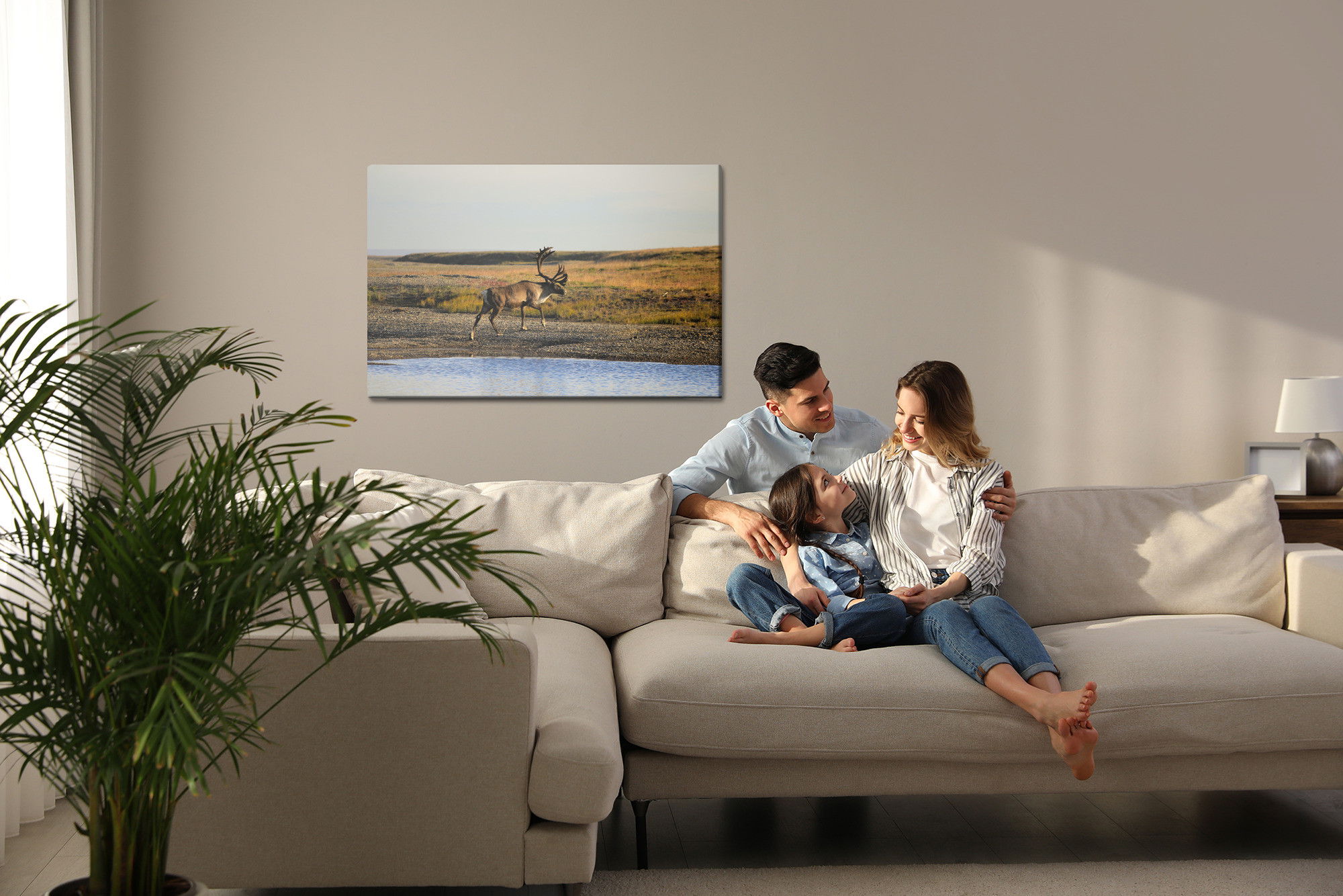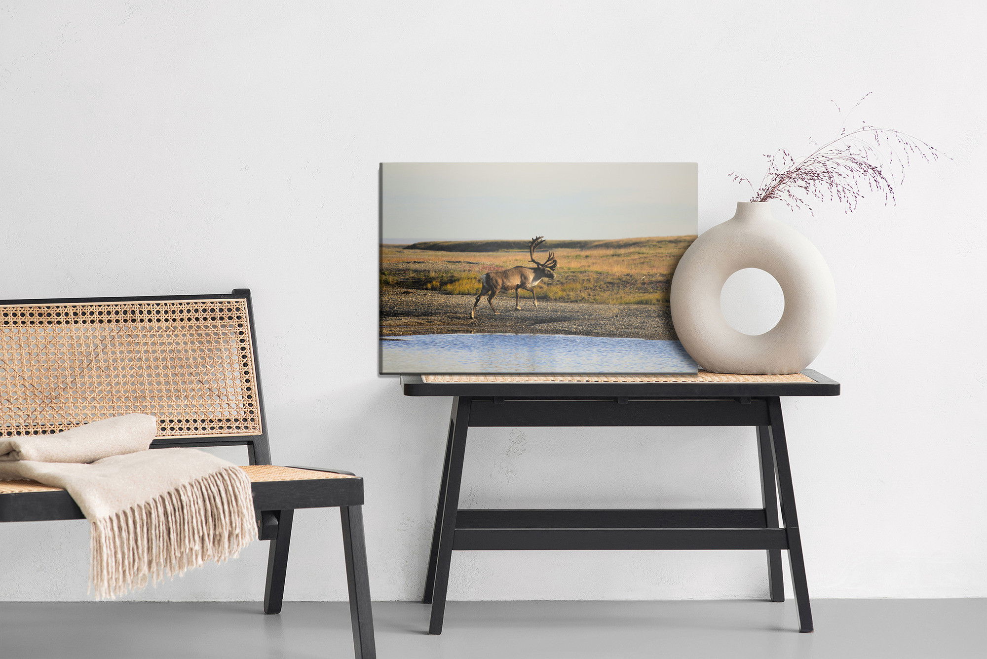 Varje tavla monteras på en massiv fururam. Format upp till 70×50 cm har en ram på 15 mm, medan format från 90×60 cm och uppåt har en ram på 20 mm. Den exakta dukspänningen gör att tavlan håller sin form över tid. Motivet A deer over the water trycks runt hela ramen vilket ger ett stilrent galleriuttryck där tavlan är lika vacker från sidan som framifrån. Kombinationen av rak dukspänning, rena linjer och korrekt tryck ger en professionell finish.