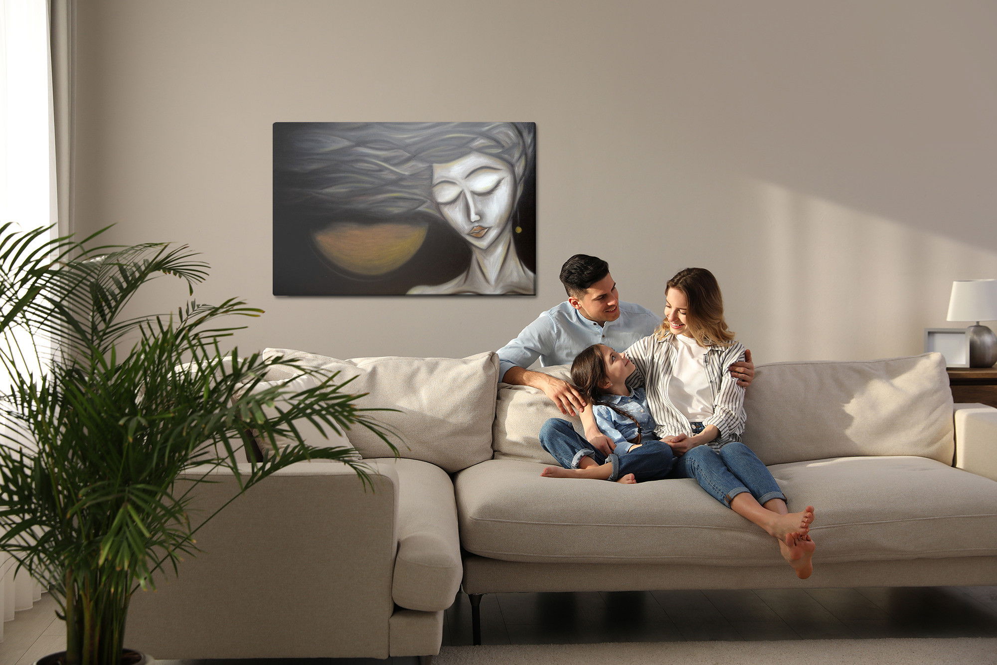 Varje tavla monteras på en massiv fururam. Format upp till 70×50 cm har en ram på 15 mm, medan format från 90×60 cm och uppåt har en ram på 20 mm. Den exakta dukspänningen gör att tavlan håller sin form över tid. Motivet A female portrait trycks runt hela ramen vilket ger ett stilrent galleriuttryck där tavlan är lika vacker från sidan som framifrån. Kombinationen av rak dukspänning, rena linjer och korrekt tryck ger en professionell finish.
