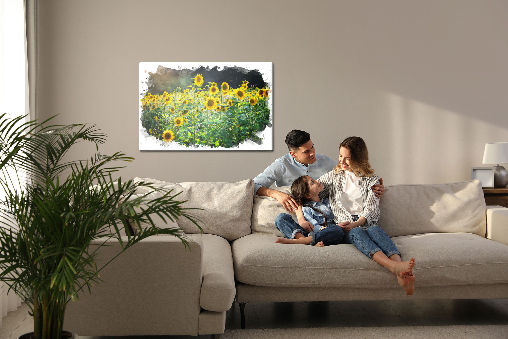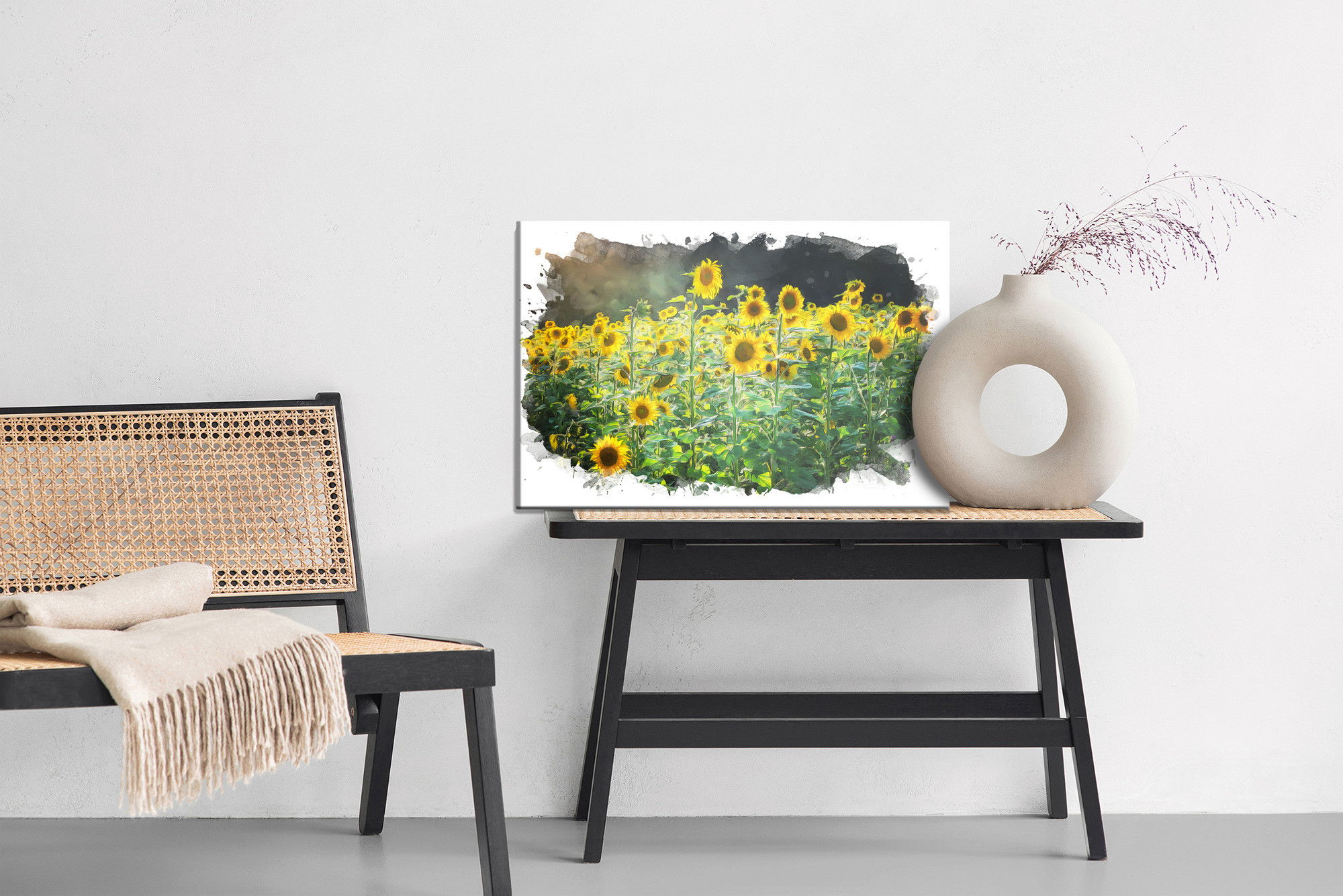 Varje tavla monteras på en massiv fururam. Format upp till 70×50 cm har en ram på 15 mm, medan format från 90×60 cm och uppåt har en ram på 20 mm. Den exakta dukspänningen gör att tavlan håller sin form över tid. Motivet A field of sunflowers trycks runt hela ramen vilket ger ett stilrent galleriuttryck där tavlan är lika vacker från sidan som framifrån. Kombinationen av rak dukspänning, rena linjer och korrekt tryck ger en professionell finish.