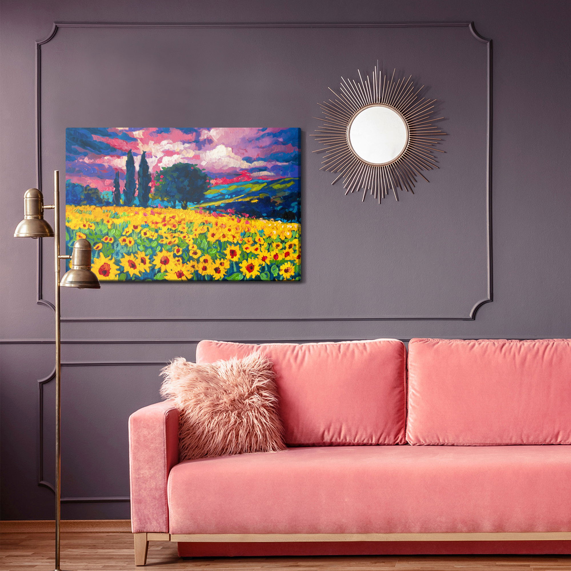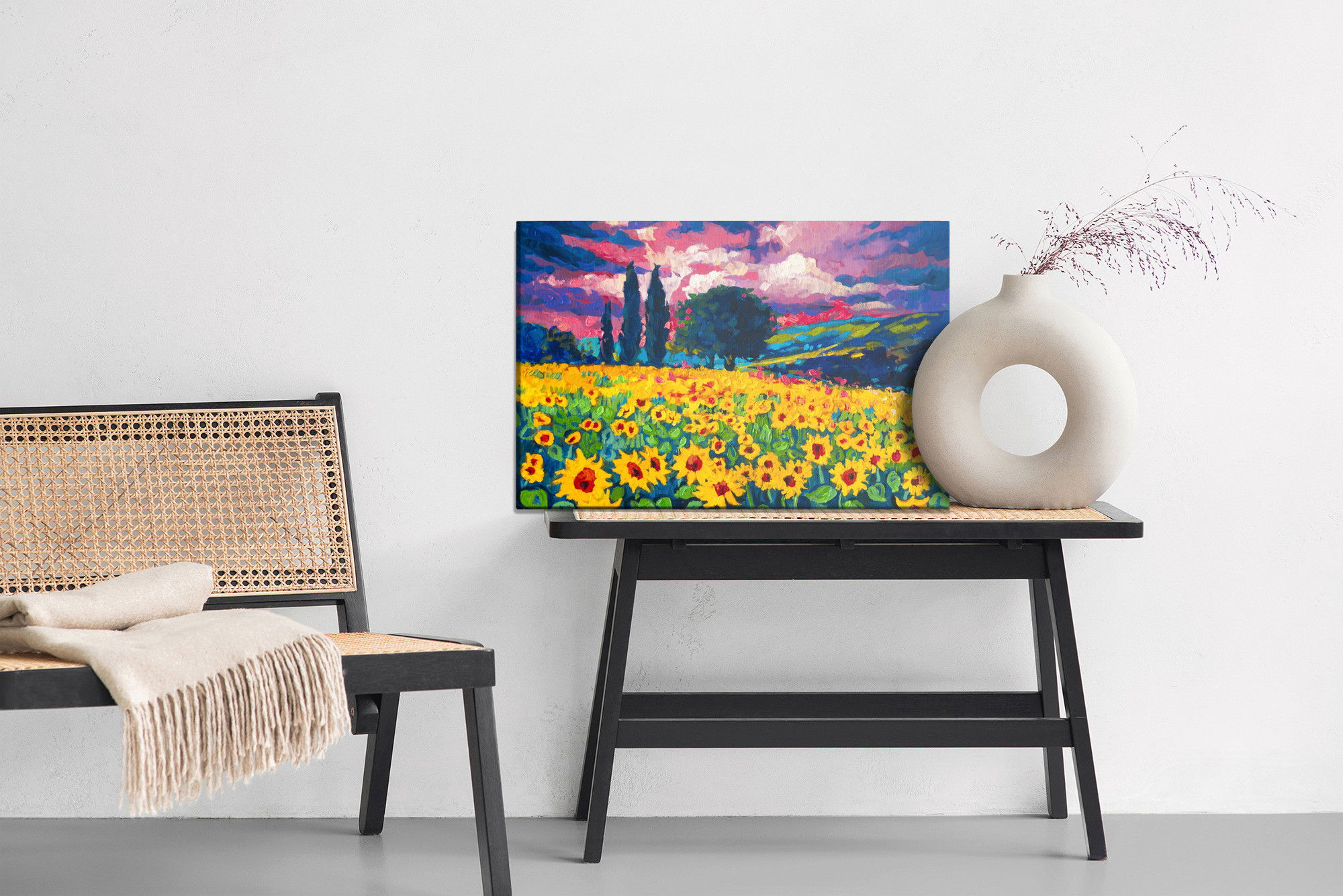 Motivet A field of sunflowers as återges med hög färgprecision och detaljrikedom tack vare HP Latex-teknologi. Trycket sker med vattenbaserade, luktfria och GREENGUARD Gold-certifierade bläck som ger en upplösning på upp till 300 DPI. Färgerna är UV-beständiga och behåller sin styrka även i ljusa rum, vilket gör tavlan lämplig för både hem- och offentliga miljöer.