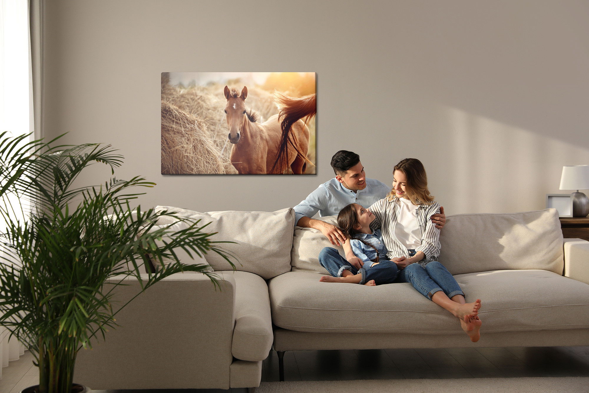 Varje tavla monteras på en massiv fururam. Format upp till 70×50 cm har en ram på 15 mm, medan format från 90×60 cm och uppåt har en ram på 20 mm. Den exakta dukspänningen gör att tavlan håller sin form över tid. Motivet A foal on a background trycks runt hela ramen vilket ger ett stilrent galleriuttryck där tavlan är lika vacker från sidan som framifrån. Kombinationen av rak dukspänning, rena linjer och korrekt tryck ger en professionell finish.