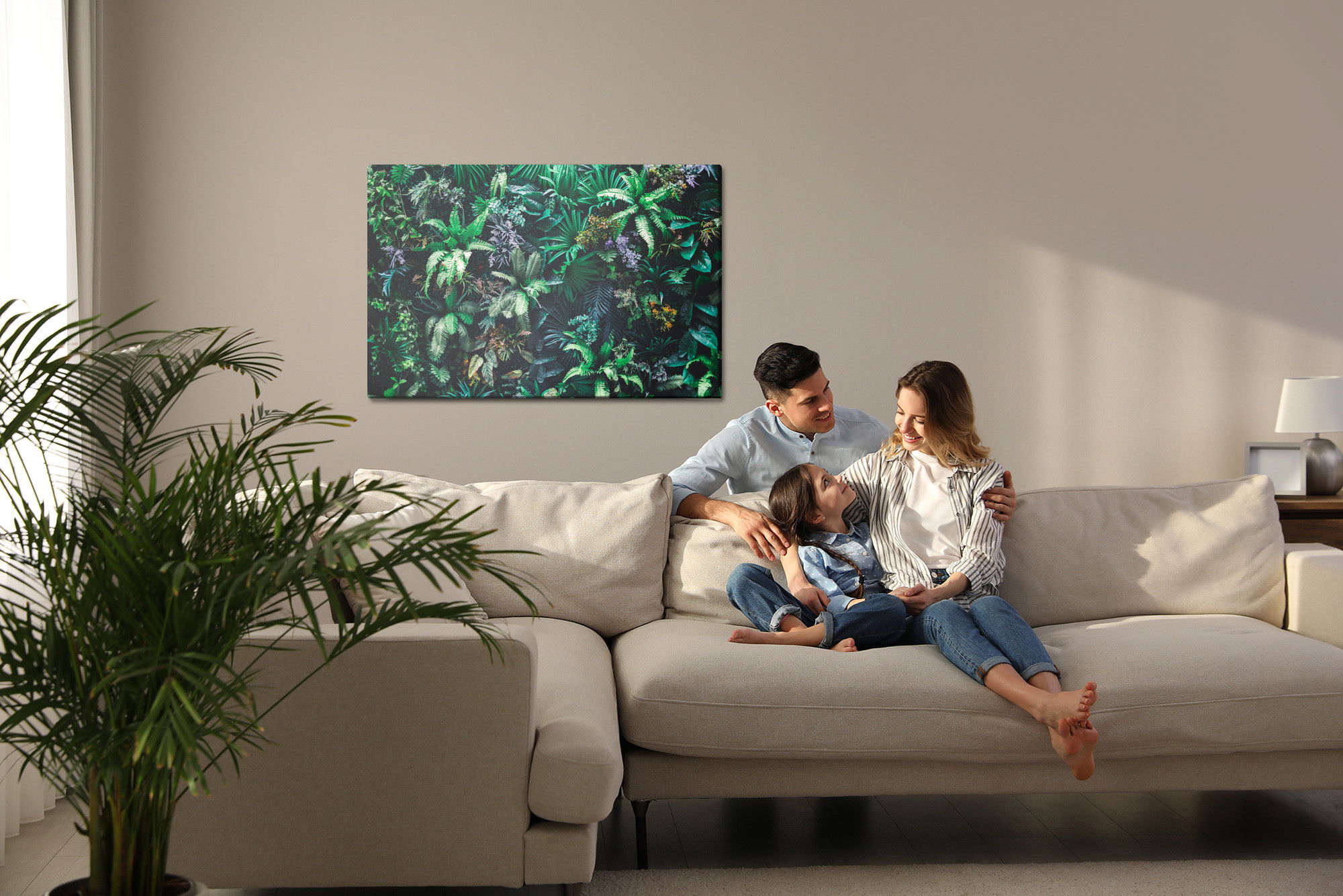 Motivet A garden full of tropical återges med hög färgprecision och detaljrikedom tack vare HP Latex-teknologi. Trycket sker med vattenbaserade, luktfria och GREENGUARD Gold-certifierade bläck som ger en upplösning på upp till 300 DPI. Färgerna är UV-beständiga och behåller sin styrka även i ljusa rum, vilket gör tavlan lämplig för både hem- och offentliga miljöer.