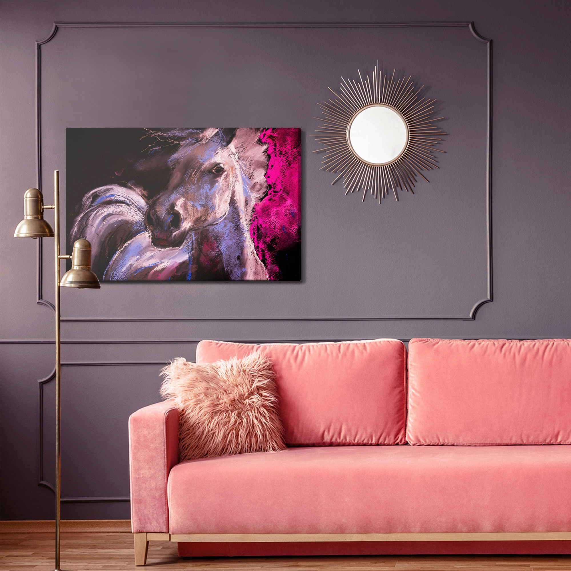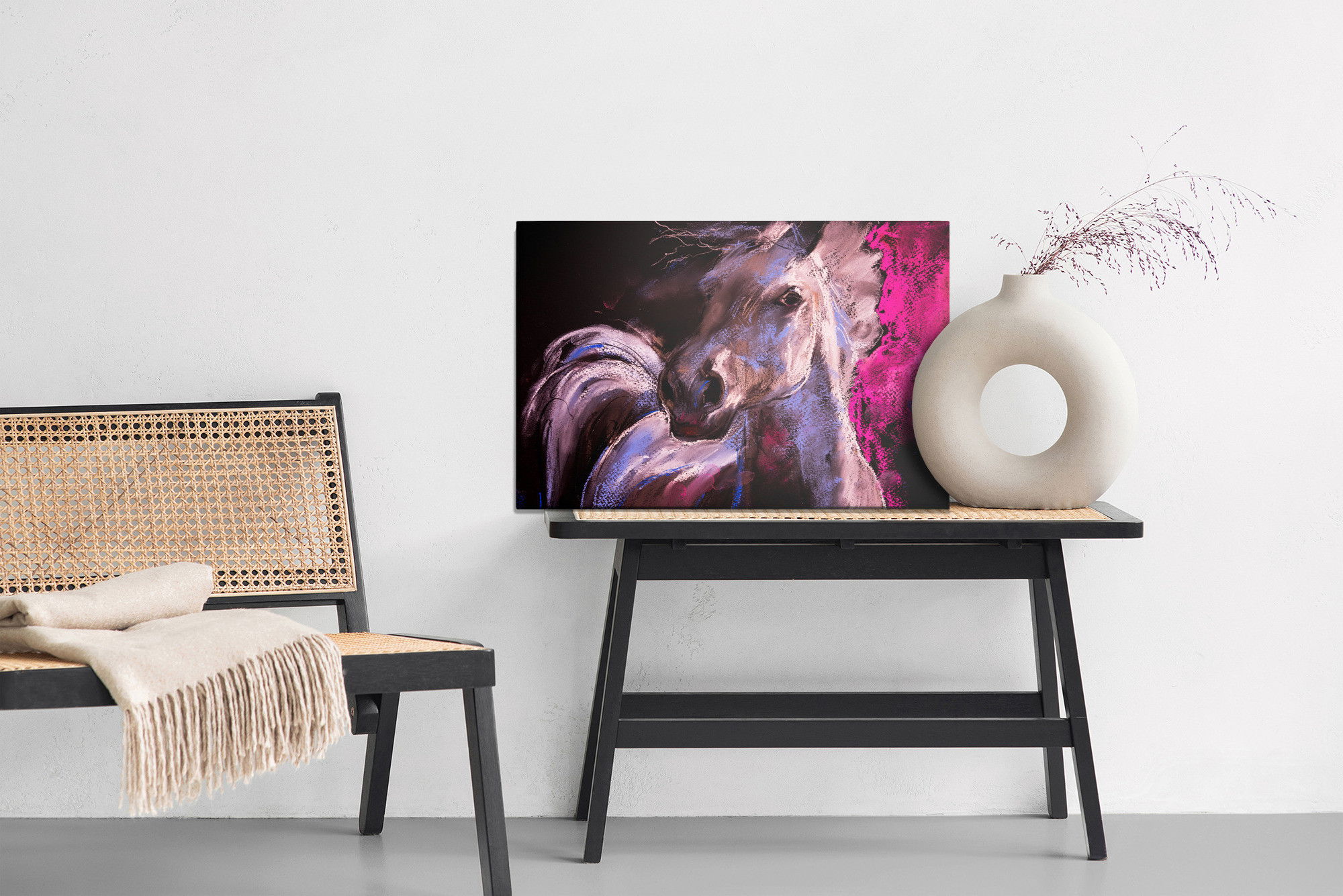 Motivet A horse in pastel colours återges med hög färgprecision och detaljrikedom tack vare HP Latex-teknologi. Trycket sker med vattenbaserade, luktfria och GREENGUARD Gold-certifierade bläck som ger en upplösning på upp till 300 DPI. Färgerna är UV-beständiga och behåller sin styrka även i ljusa rum, vilket gör tavlan lämplig för både hem- och offentliga miljöer.