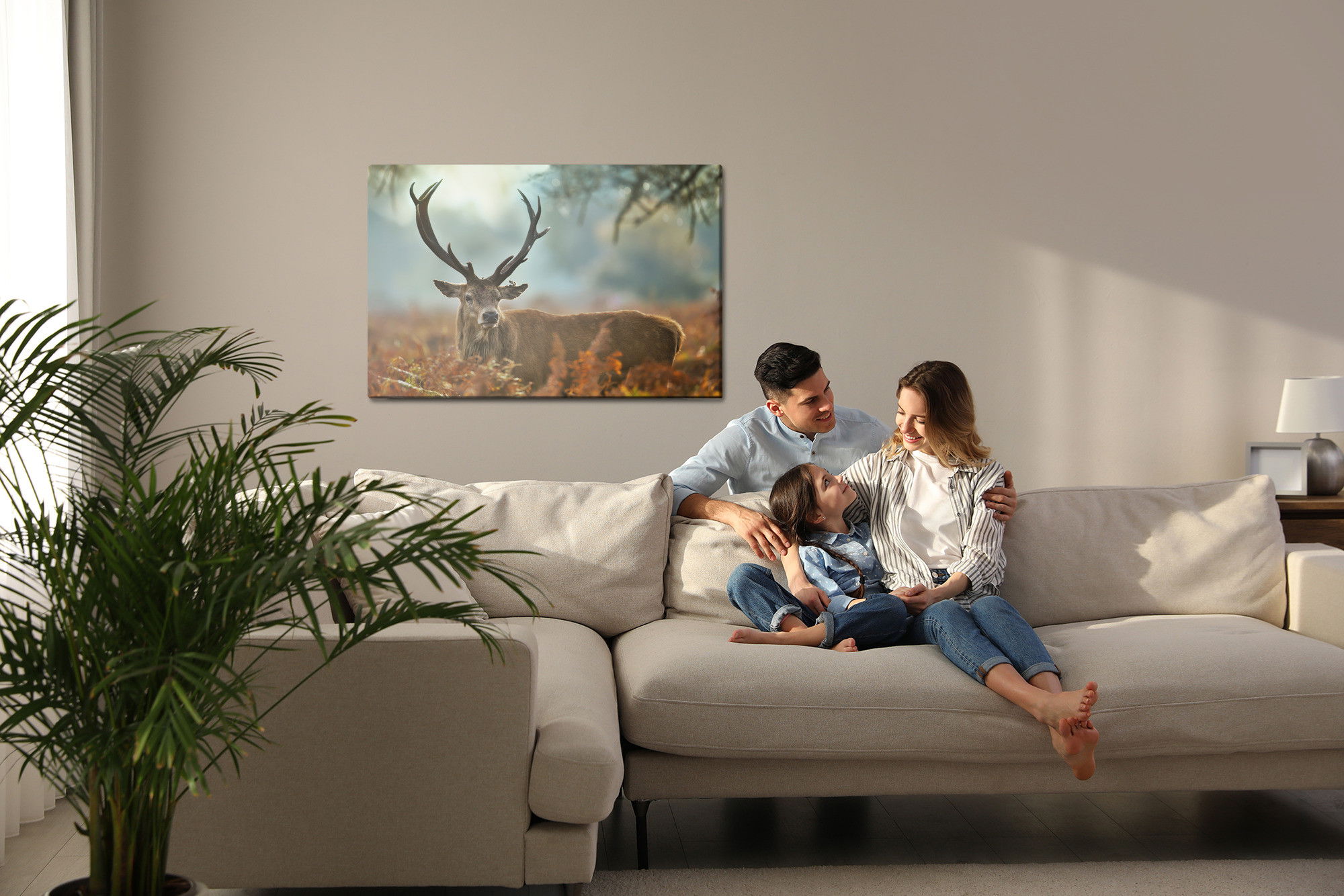 Motivet A magnificent stag återges med hög färgprecision och detaljrikedom tack vare HP Latex-teknologi. Trycket sker med vattenbaserade, luktfria och GREENGUARD Gold-certifierade bläck som ger en upplösning på upp till 300 DPI. Färgerna är UV-beständiga och behåller sin styrka även i ljusa rum, vilket gör tavlan lämplig för både hem- och offentliga miljöer.