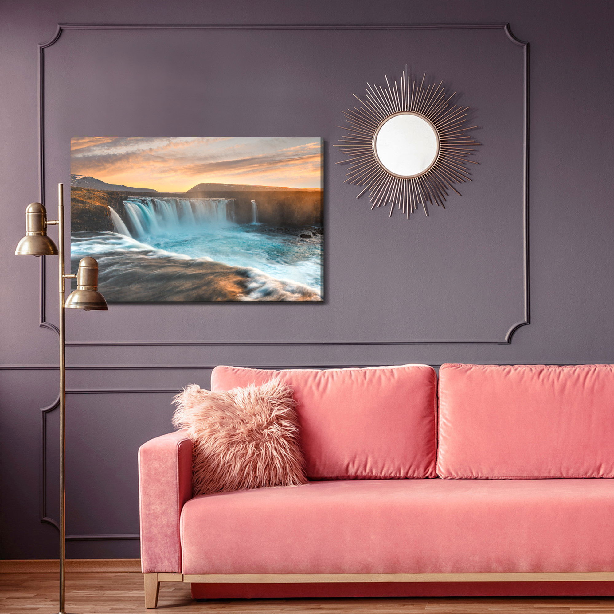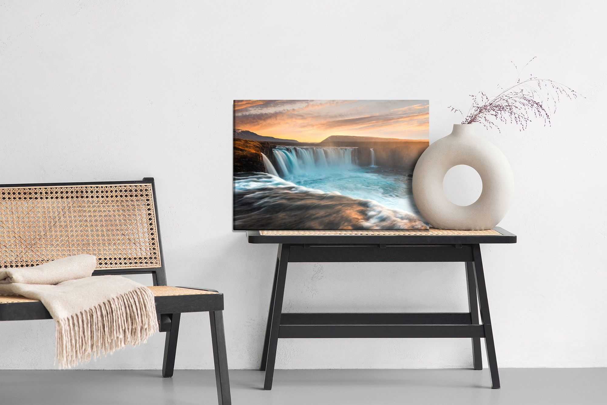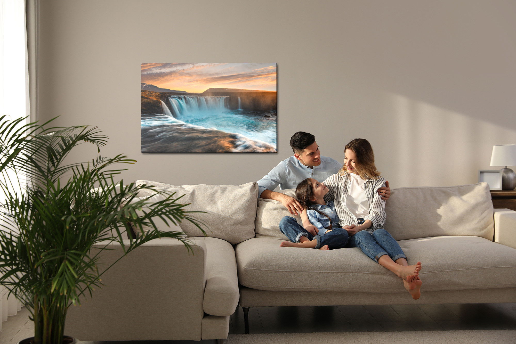 Motivet A majestic waterfall återges med hög färgprecision och detaljrikedom tack vare HP Latex-teknologi. Trycket sker med vattenbaserade, luktfria och GREENGUARD Gold-certifierade bläck som ger en upplösning på upp till 300 DPI. Färgerna är UV-beständiga och behåller sin styrka även i ljusa rum, vilket gör tavlan lämplig för både hem- och offentliga miljöer.