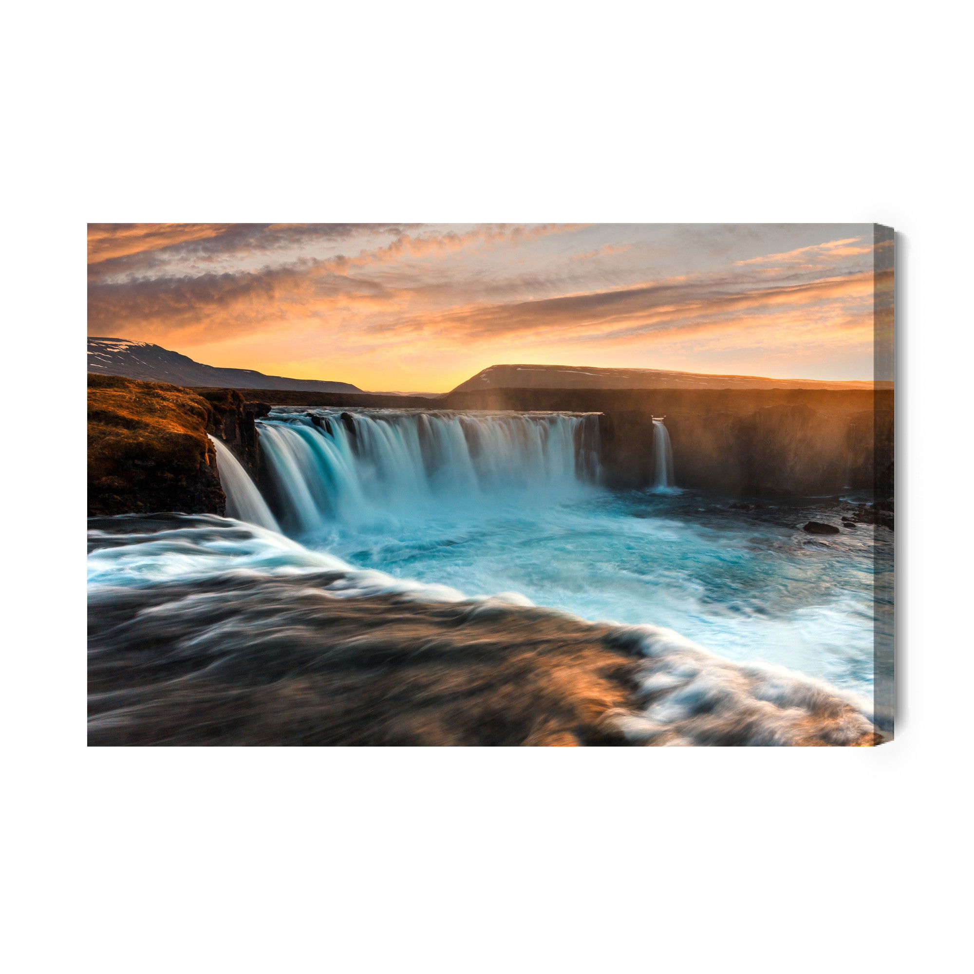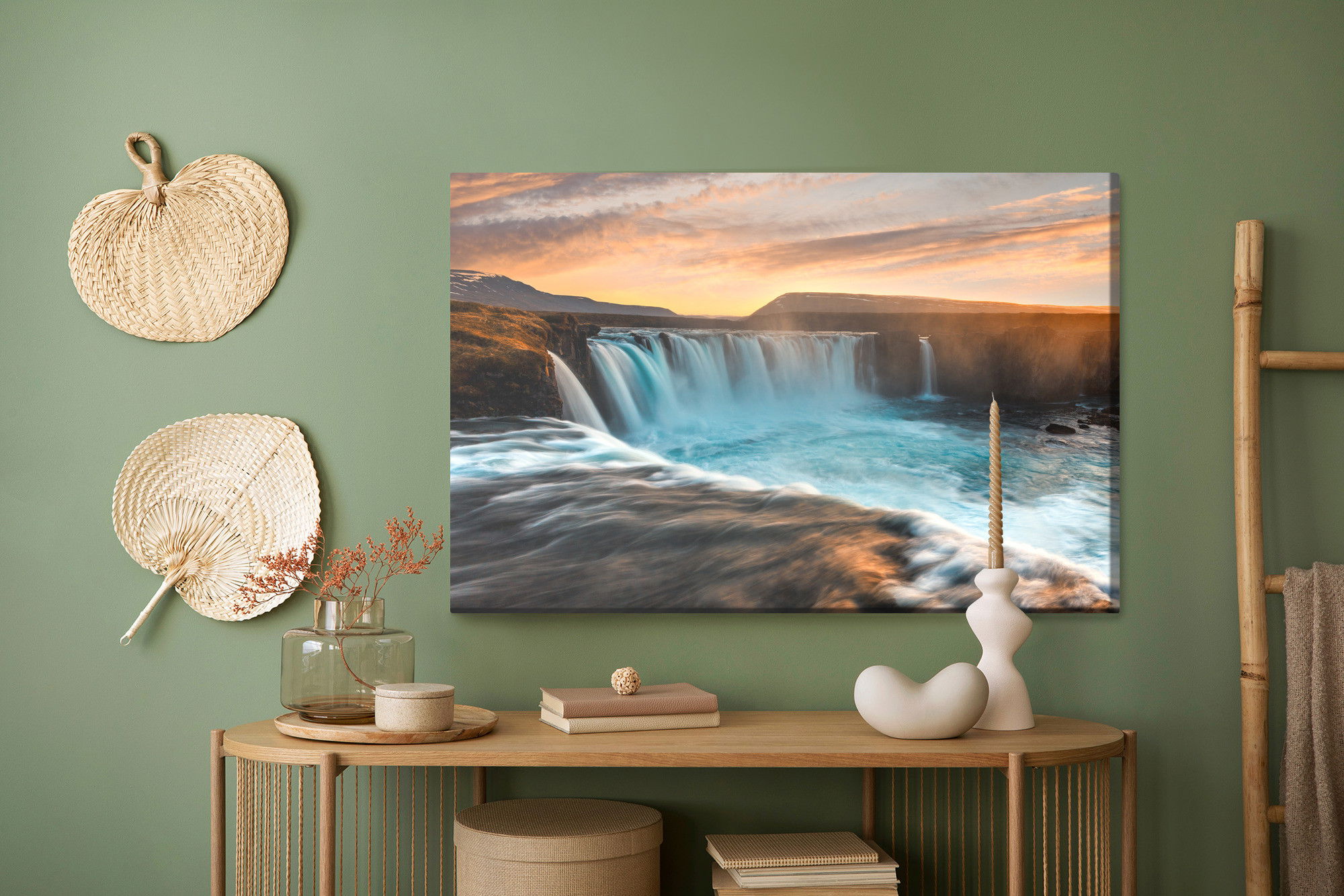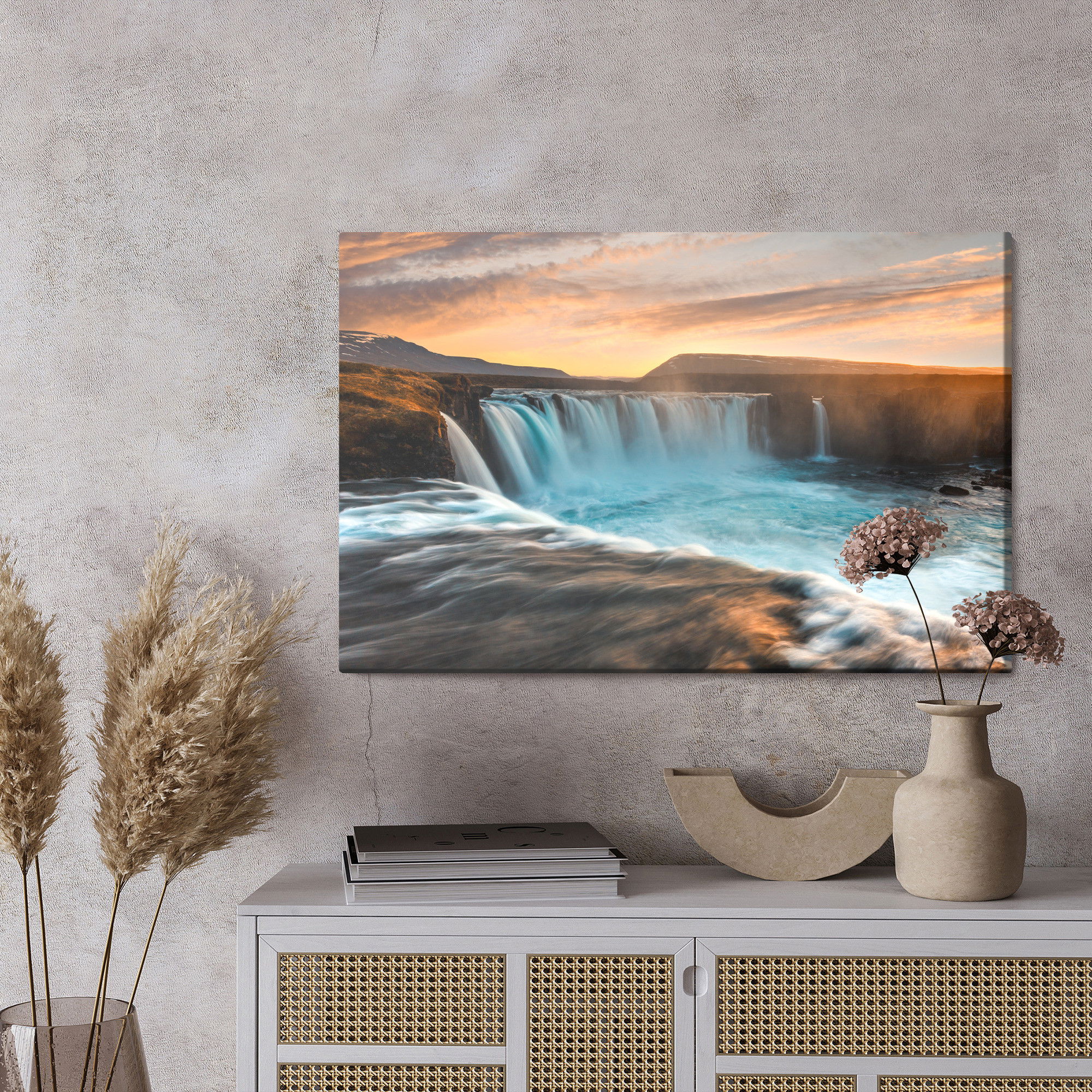 Motivet A majestic waterfall återges med hög färgprecision och detaljrikedom tack vare HP Latex-teknologi. Trycket sker med vattenbaserade, luktfria och GREENGUARD Gold-certifierade bläck som ger en upplösning på upp till 300 DPI. Färgerna är UV-beständiga och behåller sin styrka även i ljusa rum, vilket gör tavlan lämplig för både hem- och offentliga miljöer.