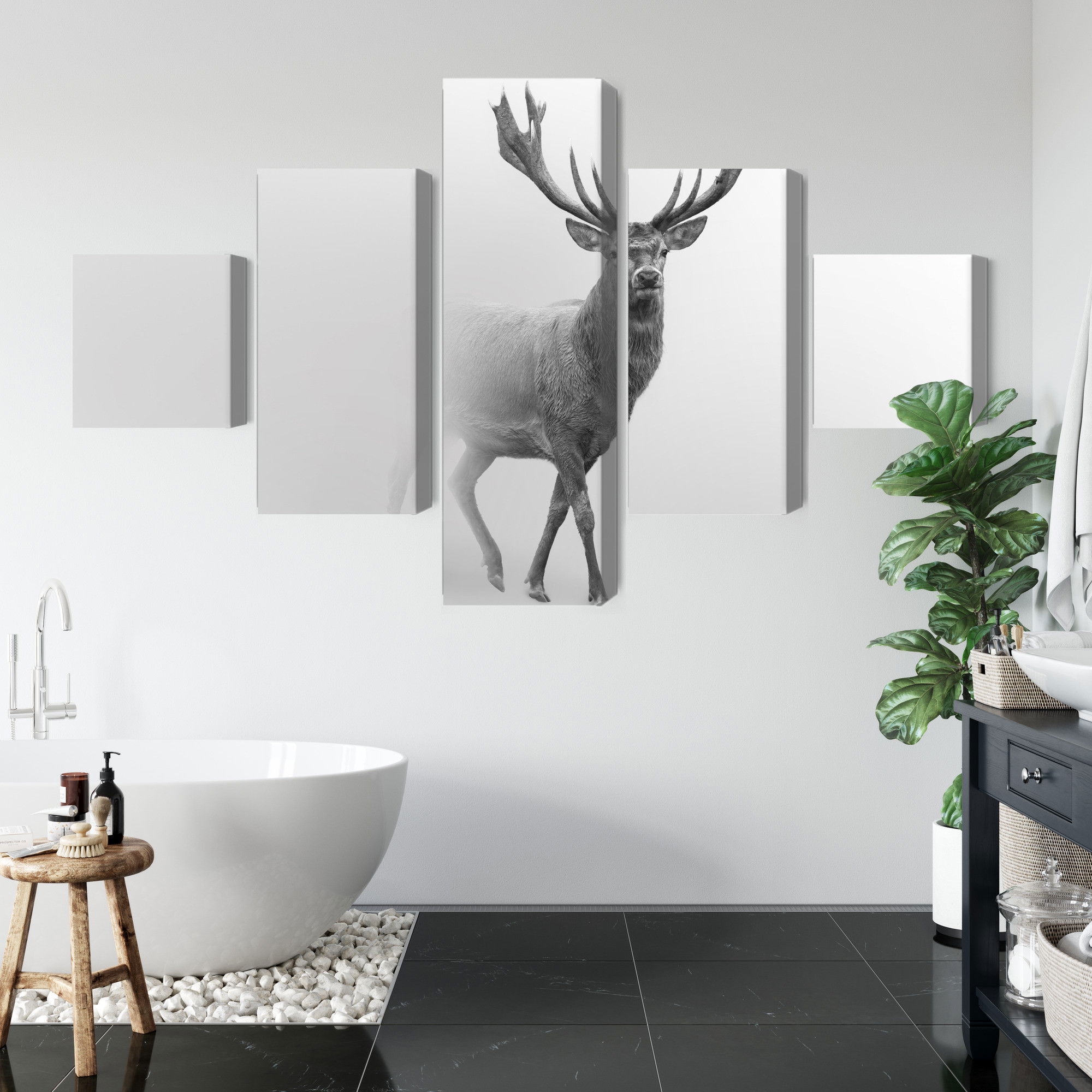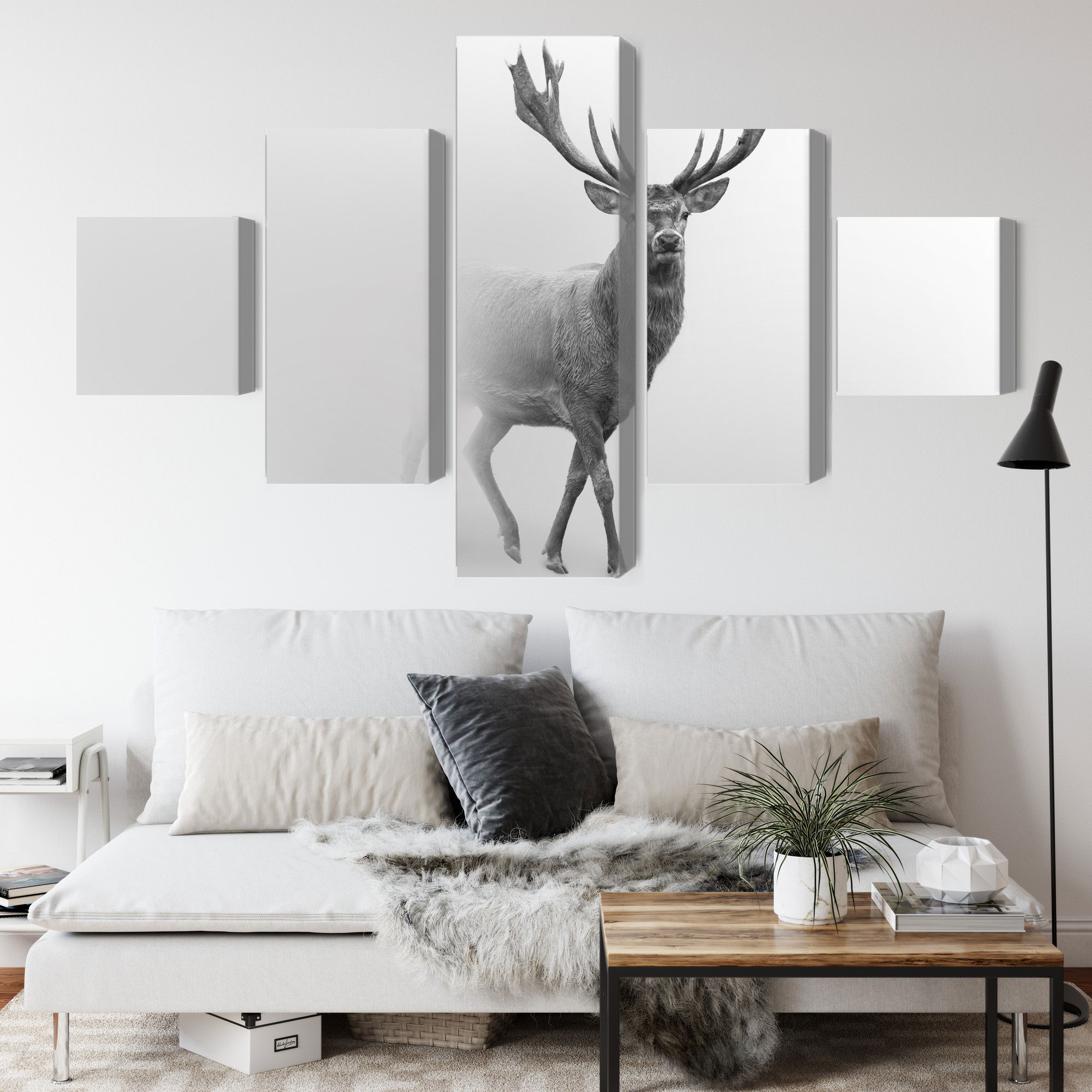 Varje tavla monteras på en massiv fururam. Format upp till 70×50 cm har en ram på 15 mm, medan format från 90×60 cm och uppåt har en ram på 20 mm. Den exakta dukspänningen gör att tavlan håller sin form över tid. Motivet A stately deer in the fog trycks runt hela ramen vilket ger ett stilrent galleriuttryck där tavlan är lika vacker från sidan som framifrån. Kombinationen av rak dukspänning, rena linjer och korrekt tryck ger en professionell finish.