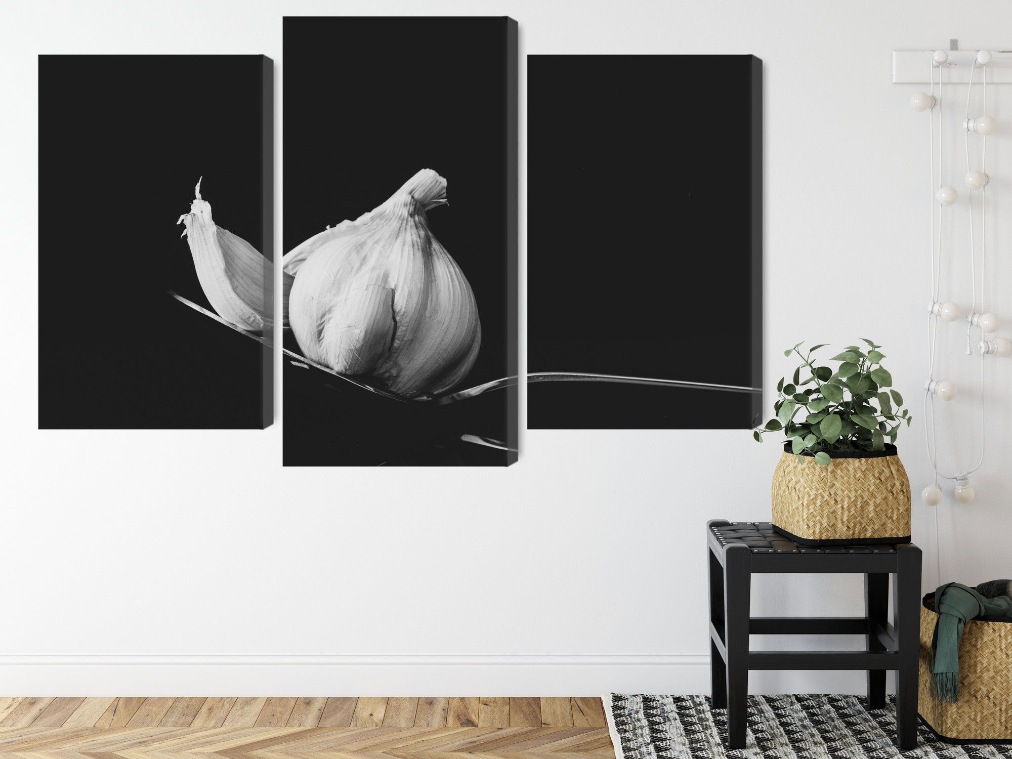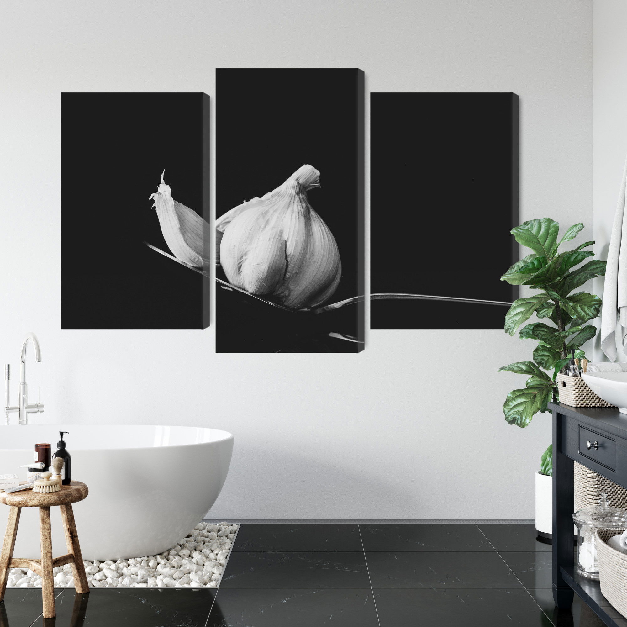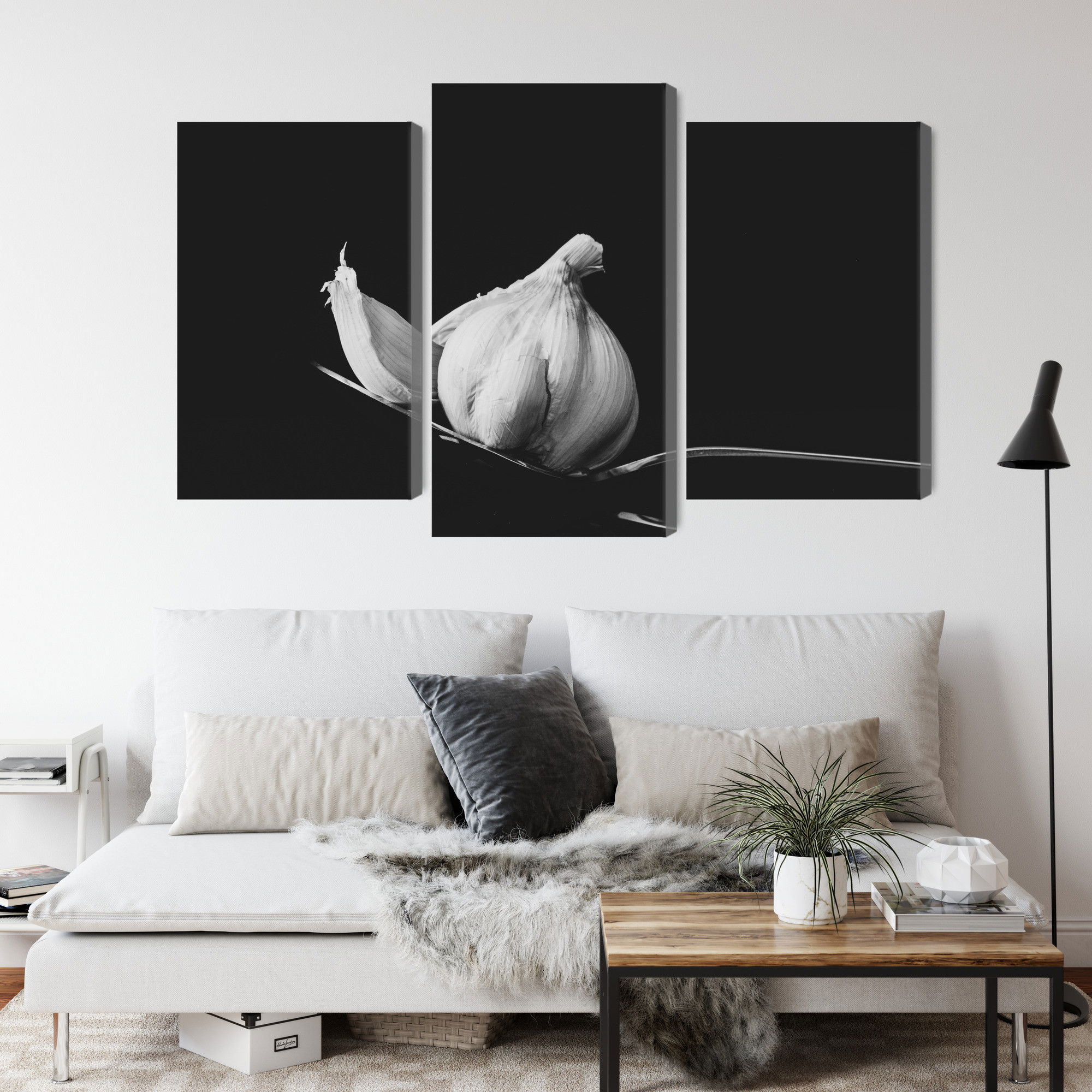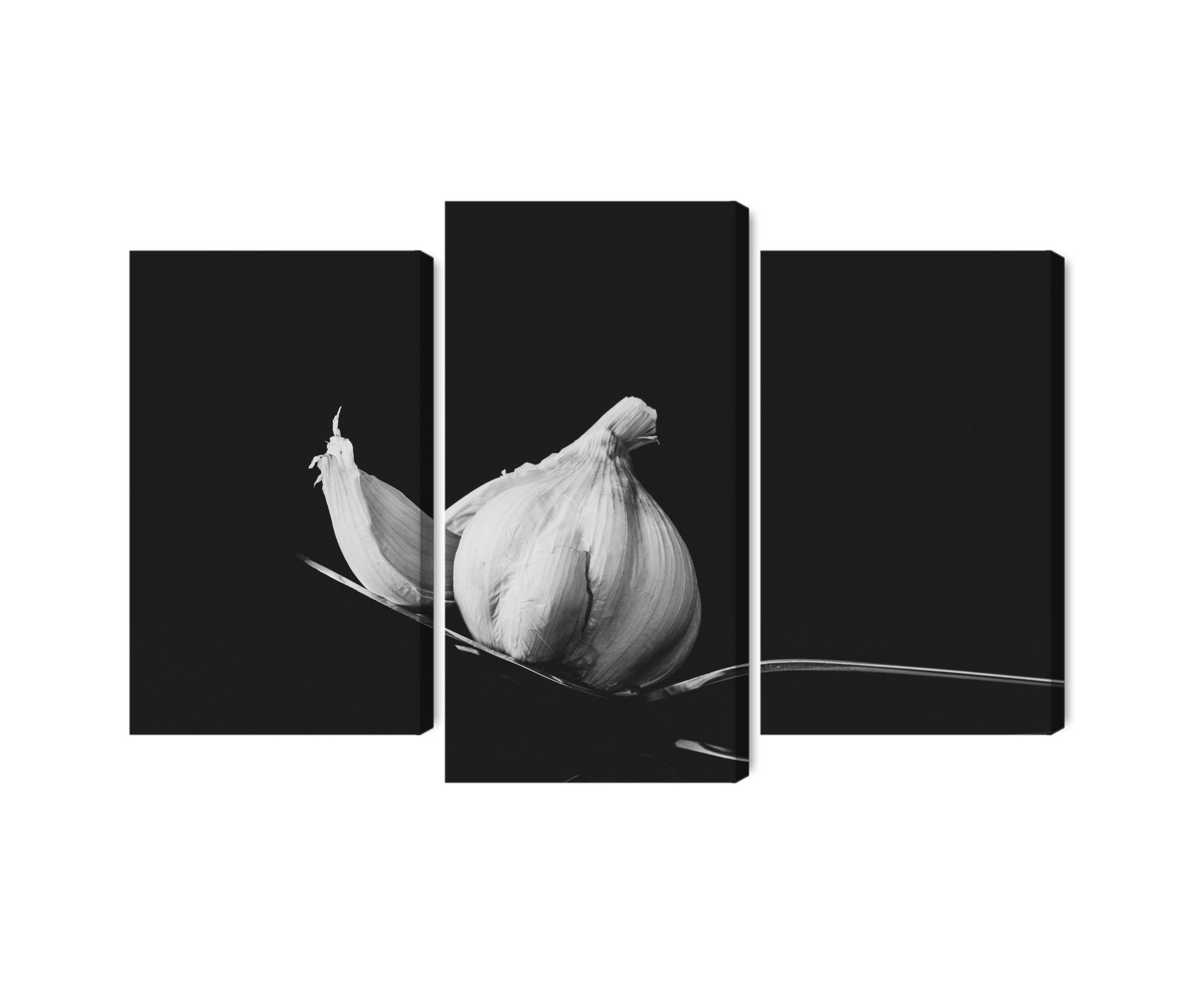 Varje tavla monteras på en massiv fururam. Format upp till 70×50 cm har en ram på 15 mm, medan format från 90×60 cm och uppåt har en ram på 20 mm. Den exakta dukspänningen gör att tavlan håller sin form över tid. Motivet A tablespoon of garlic trycks runt hela ramen vilket ger ett stilrent galleriuttryck där tavlan är lika vacker från sidan som framifrån. Kombinationen av rak dukspänning, rena linjer och korrekt tryck ger en professionell finish.