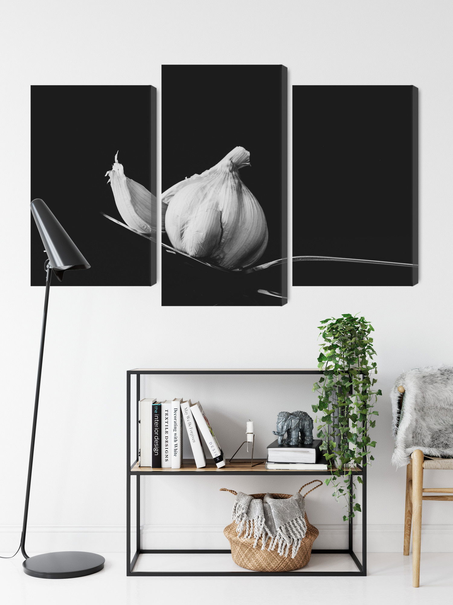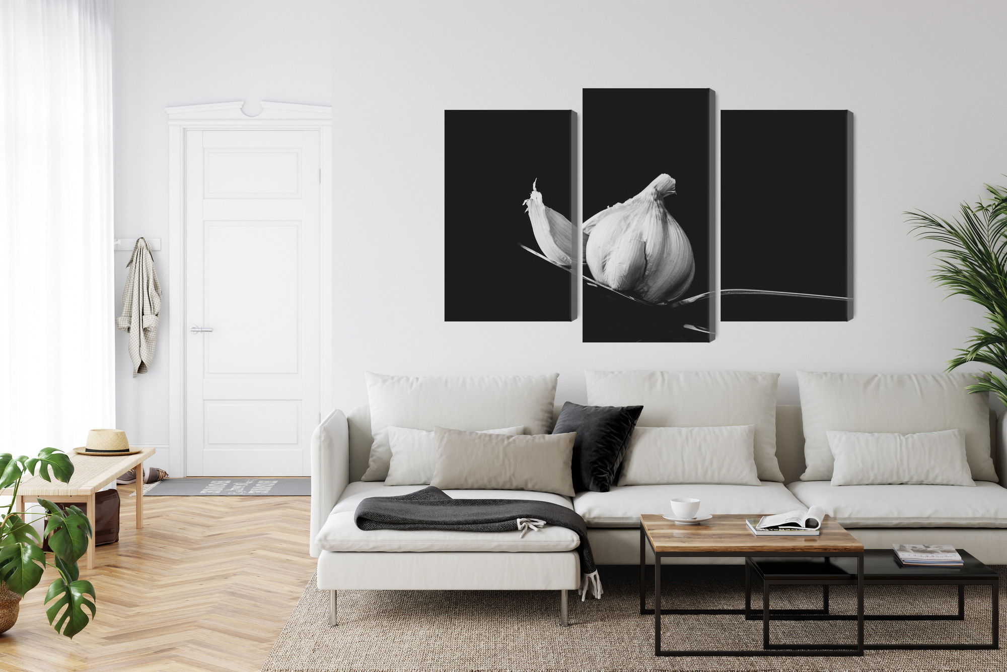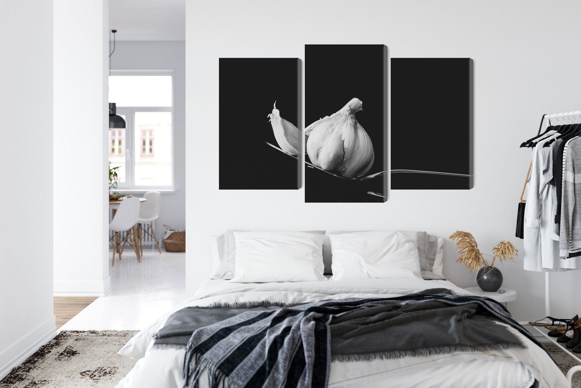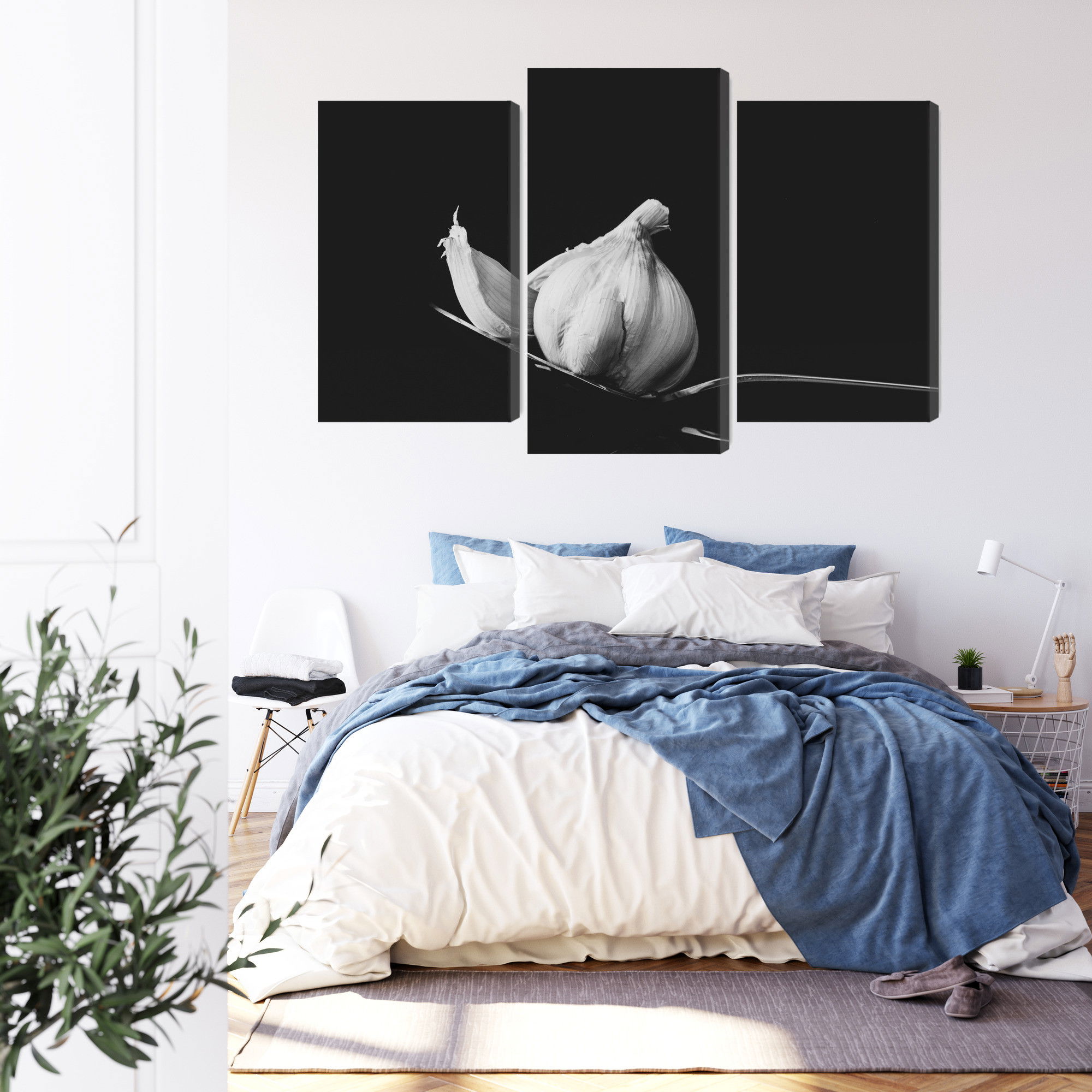 Varje tavla monteras på en massiv fururam. Format upp till 70×50 cm har en ram på 15 mm, medan format från 90×60 cm och uppåt har en ram på 20 mm. Den exakta dukspänningen gör att tavlan håller sin form över tid. Motivet A tablespoon of garlic trycks runt hela ramen vilket ger ett stilrent galleriuttryck där tavlan är lika vacker från sidan som framifrån. Kombinationen av rak dukspänning, rena linjer och korrekt tryck ger en professionell finish.