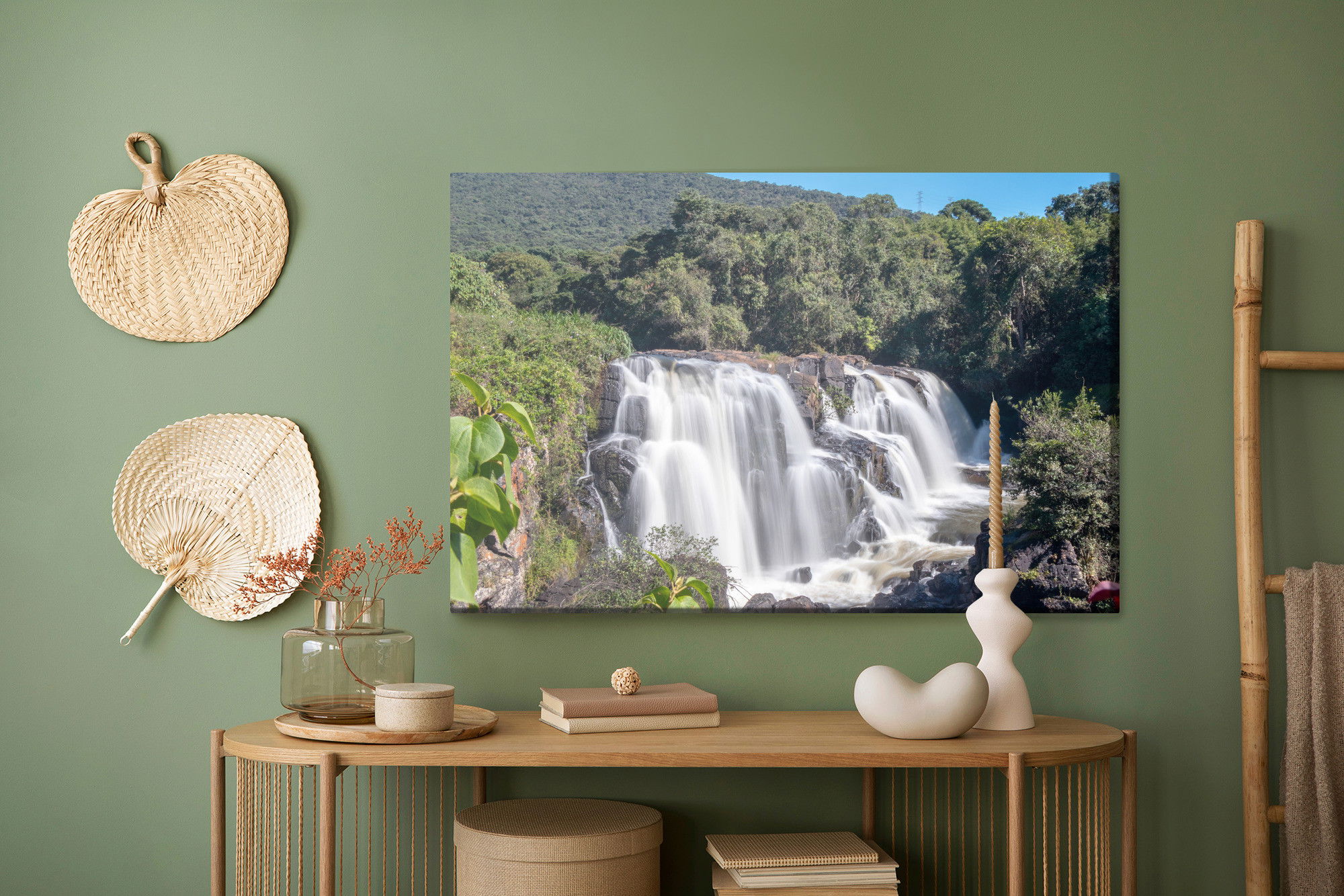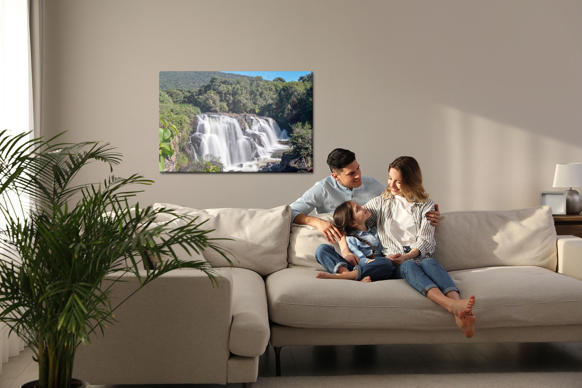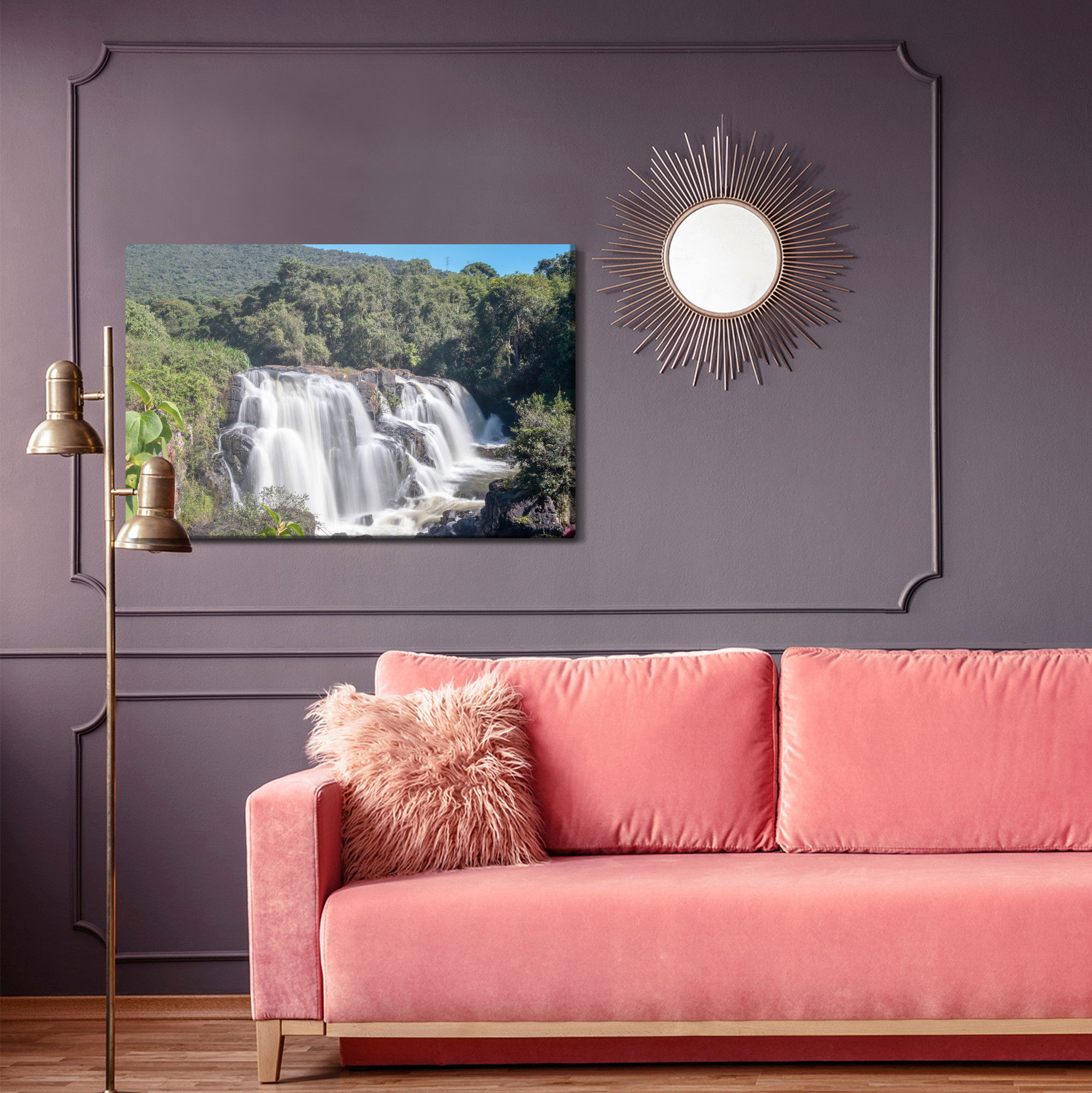 Motivet A waterfall among lush återges med hög färgprecision och detaljrikedom tack vare HP Latex-teknologi. Trycket sker med vattenbaserade, luktfria och GREENGUARD Gold-certifierade bläck som ger en upplösning på upp till 300 DPI. Färgerna är UV-beständiga och behåller sin styrka även i ljusa rum, vilket gör tavlan lämplig för både hem- och offentliga miljöer.