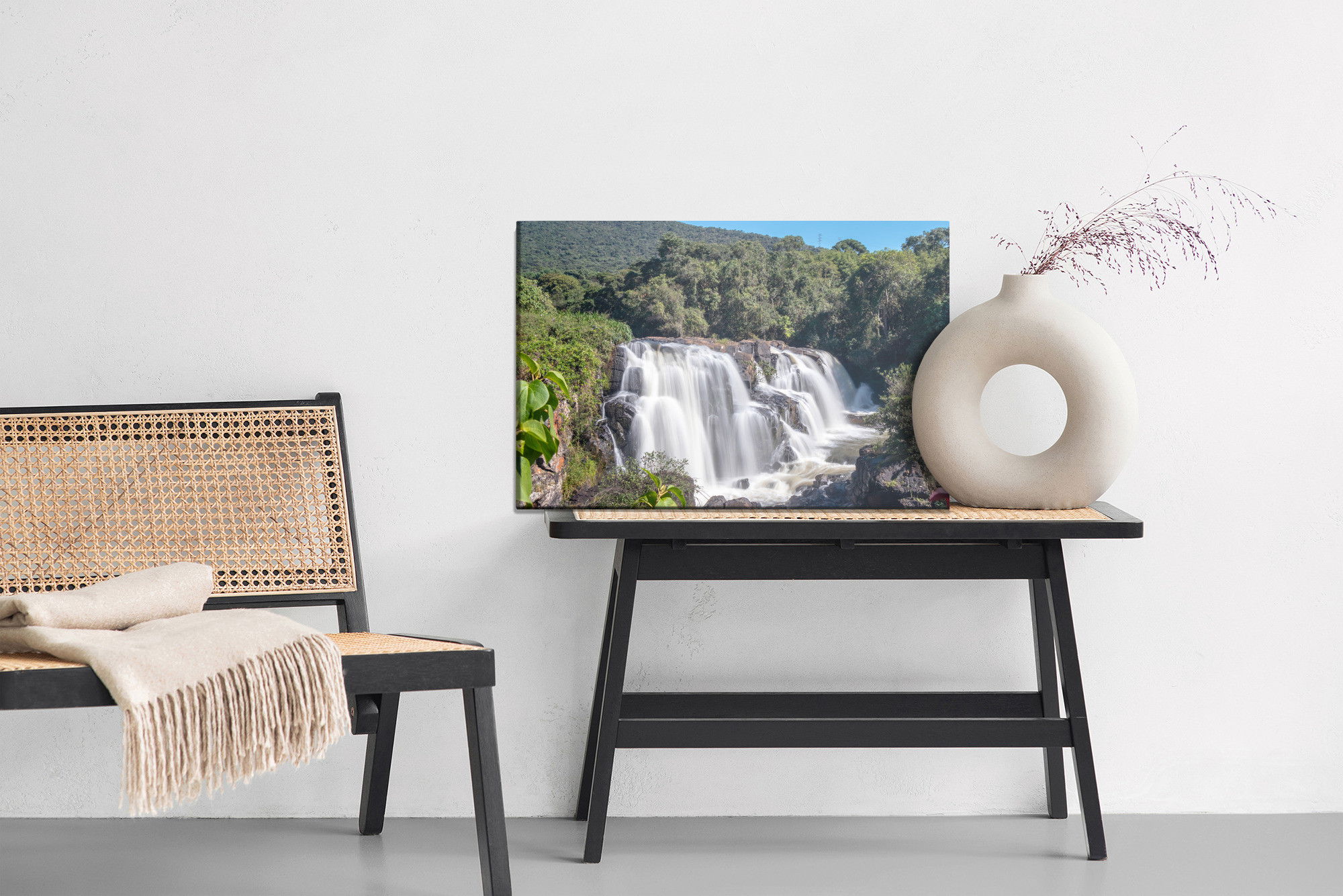 Varje tavla monteras på en massiv fururam. Format upp till 70×50 cm har en ram på 15 mm, medan format från 90×60 cm och uppåt har en ram på 20 mm. Den exakta dukspänningen gör att tavlan håller sin form över tid. Motivet A waterfall among lush trycks runt hela ramen vilket ger ett stilrent galleriuttryck där tavlan är lika vacker från sidan som framifrån. Kombinationen av rak dukspänning, rena linjer och korrekt tryck ger en professionell finish.