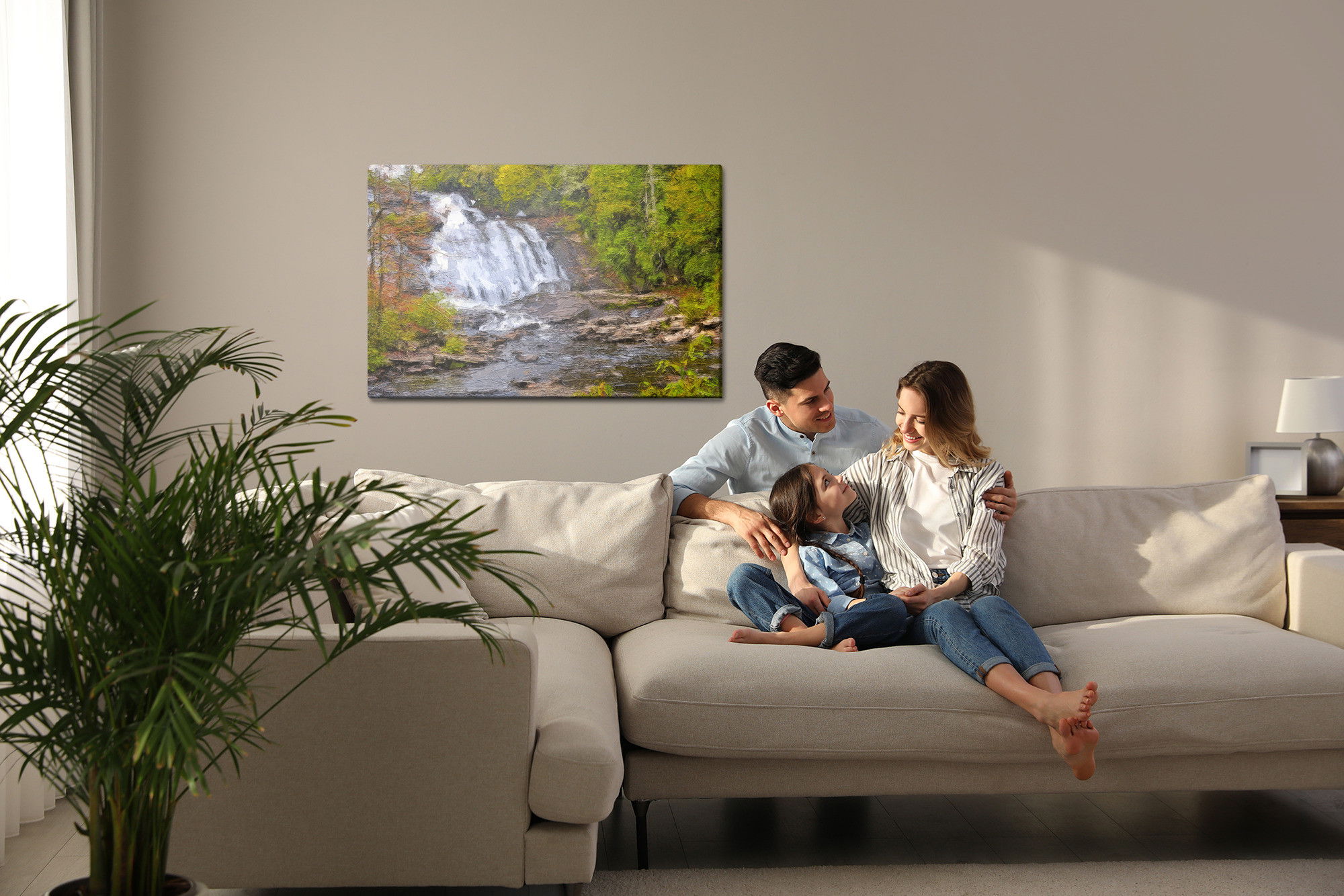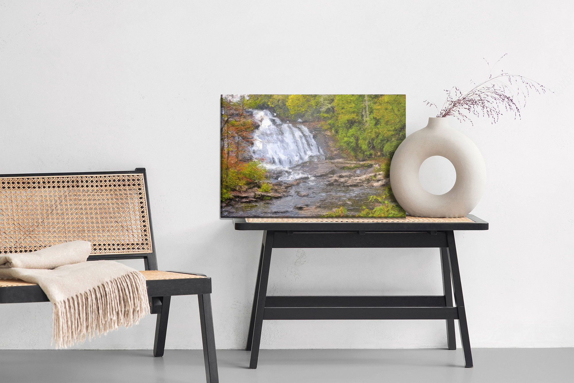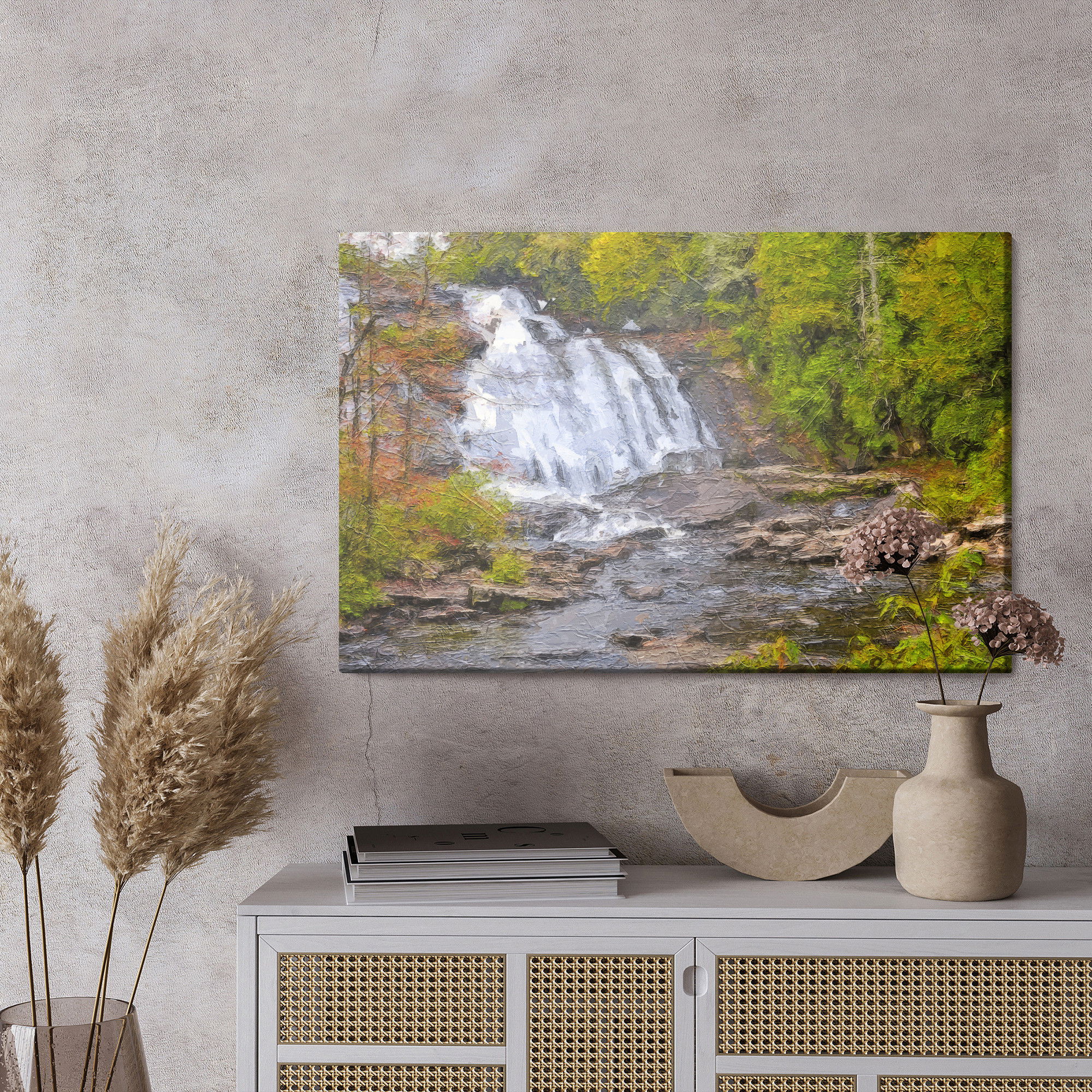 Varje tavla monteras på en massiv fururam. Format upp till 70×50 cm har en ram på 15 mm, medan format från 90×60 cm och uppåt har en ram på 20 mm. Den exakta dukspänningen gör att tavlan håller sin form över tid. Motivet A waterfall in the forest as trycks runt hela ramen vilket ger ett stilrent galleriuttryck där tavlan är lika vacker från sidan som framifrån. Kombinationen av rak dukspänning, rena linjer och korrekt tryck ger en professionell finish.