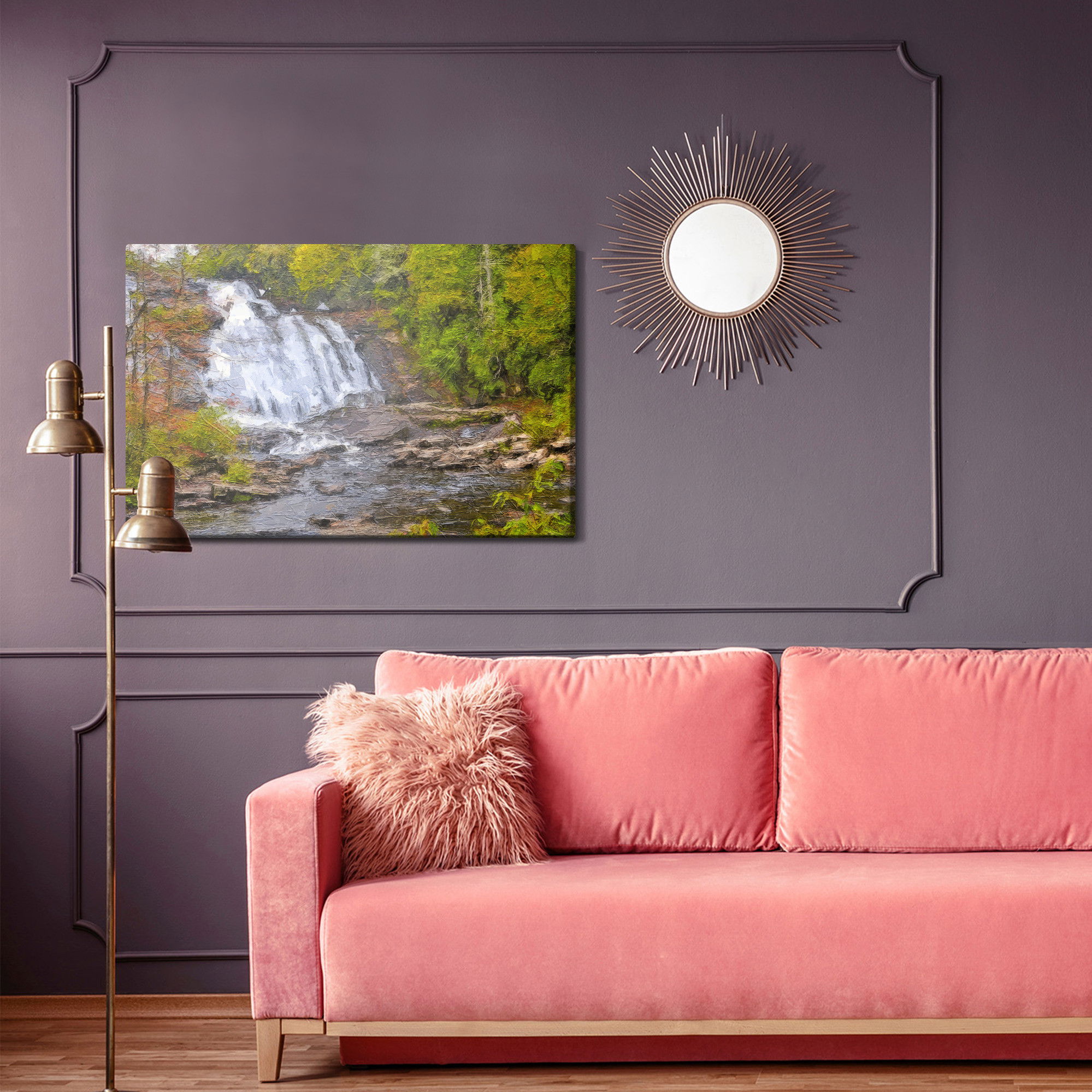 SilentDirects ljuddämpande tavla A waterfall in the forest as kombinerar ett högupplöst motiv med avancerad akustikteknik. Varje tavla monteras i Sverige och bygger på en stabil canvastavla med fururam, där insidan av ramen fylls med en ljudabsorberande kärna av återvunnen polyester. Konstruktionen gör tavlan till ett både estetiskt och funktionellt inslag i rummet.