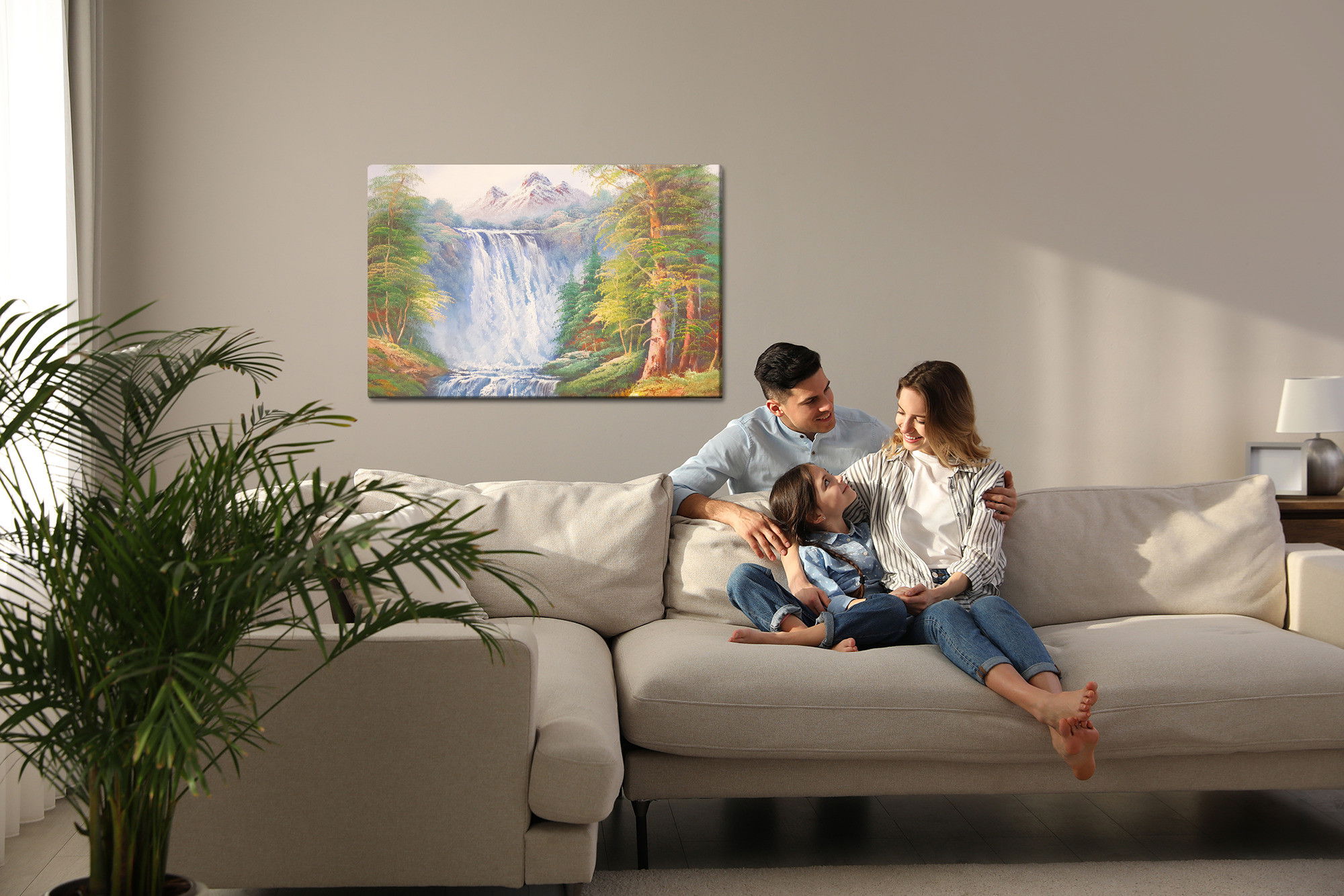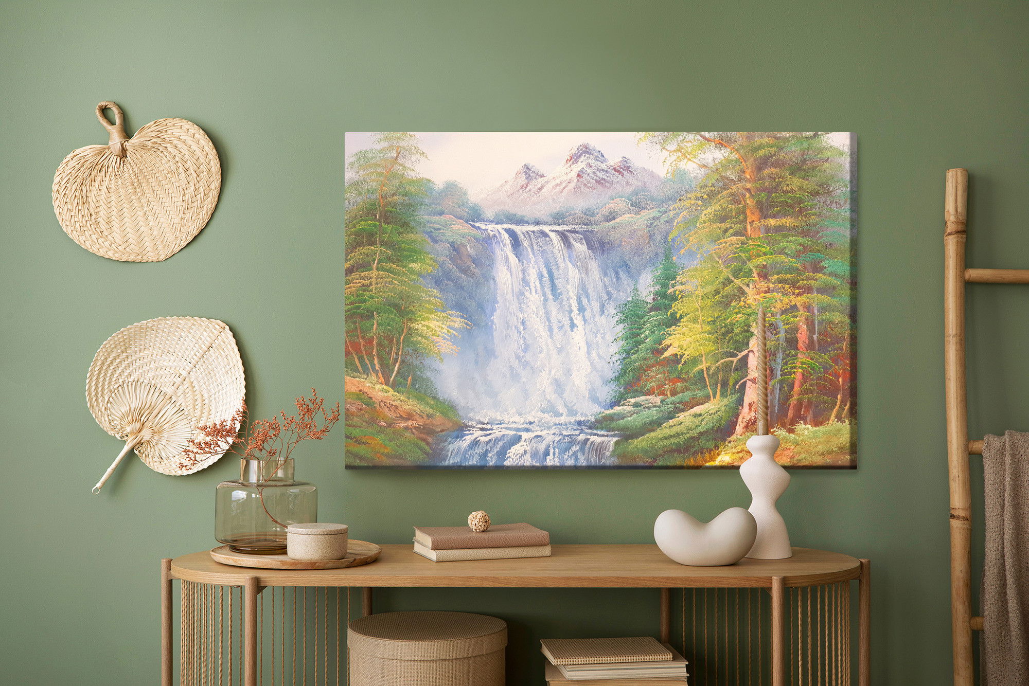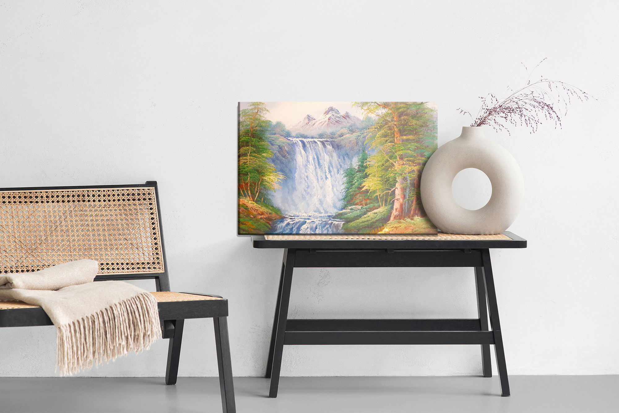 Motivet A waterfall in the mountains återges med hög färgprecision och detaljrikedom tack vare HP Latex-teknologi. Trycket sker med vattenbaserade, luktfria och GREENGUARD Gold-certifierade bläck som ger en upplösning på upp till 300 DPI. Färgerna är UV-beständiga och behåller sin styrka även i ljusa rum, vilket gör tavlan lämplig för både hem- och offentliga miljöer.