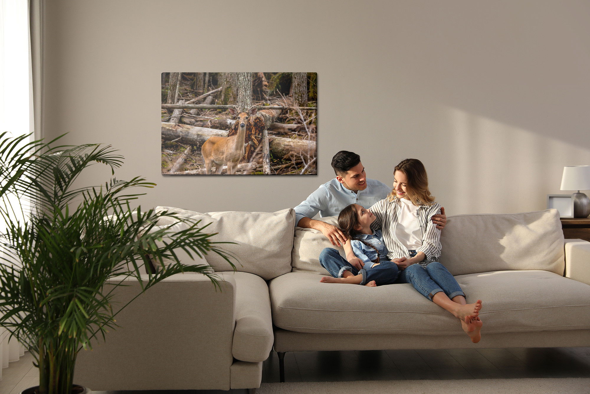 Motivet A young deer among the trees återges med hög färgprecision och detaljrikedom tack vare HP Latex-teknologi. Trycket sker med vattenbaserade, luktfria och GREENGUARD Gold-certifierade bläck som ger en upplösning på upp till 300 DPI. Färgerna är UV-beständiga och behåller sin styrka även i ljusa rum, vilket gör tavlan lämplig för både hem- och offentliga miljöer.