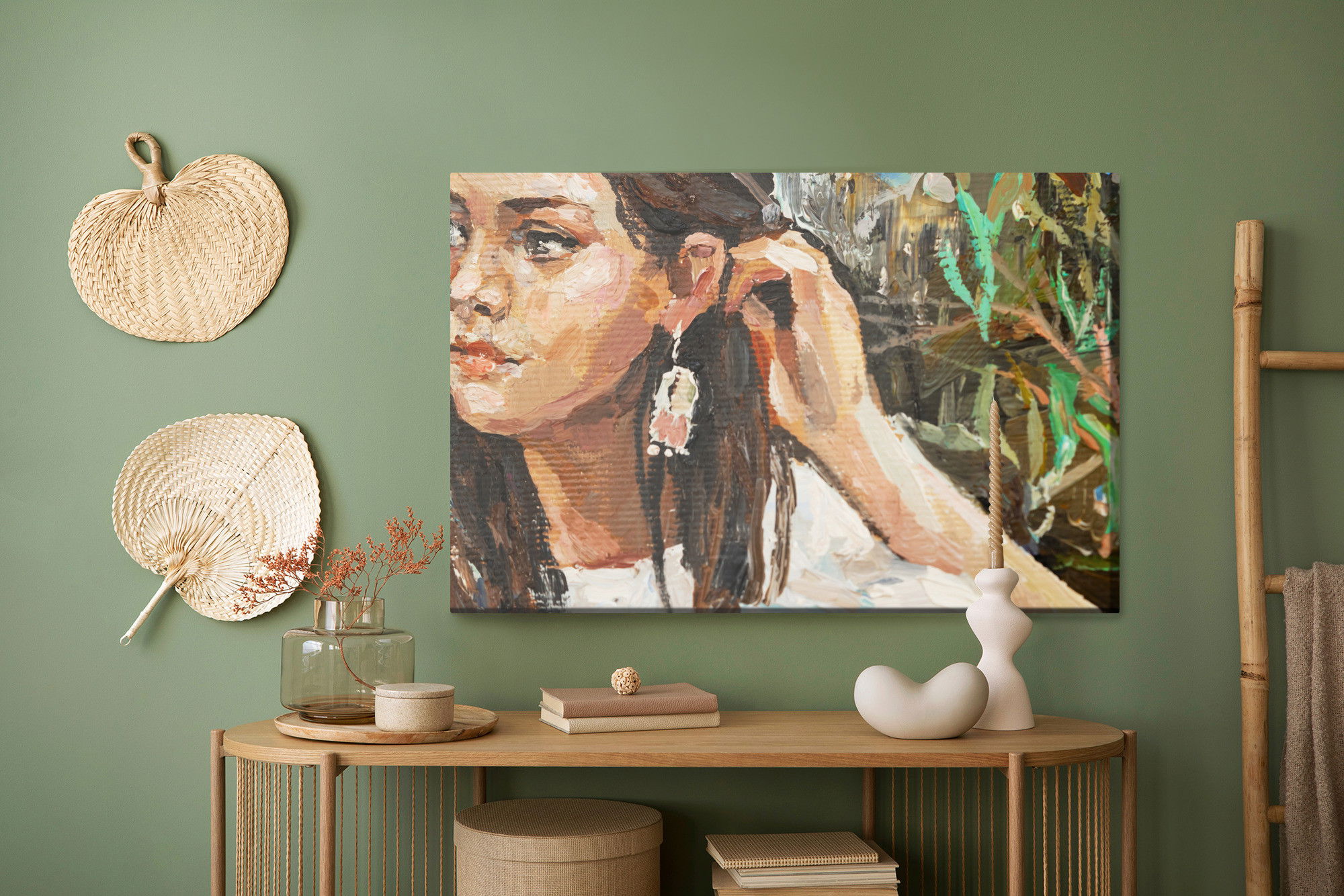 Motivet A young girl is sitting återges med hög färgprecision och detaljrikedom tack vare HP Latex-teknologi. Trycket sker med vattenbaserade, luktfria och GREENGUARD Gold-certifierade bläck som ger en upplösning på upp till 300 DPI. Färgerna är UV-beständiga och behåller sin styrka även i ljusa rum, vilket gör tavlan lämplig för både hem- och offentliga miljöer.
