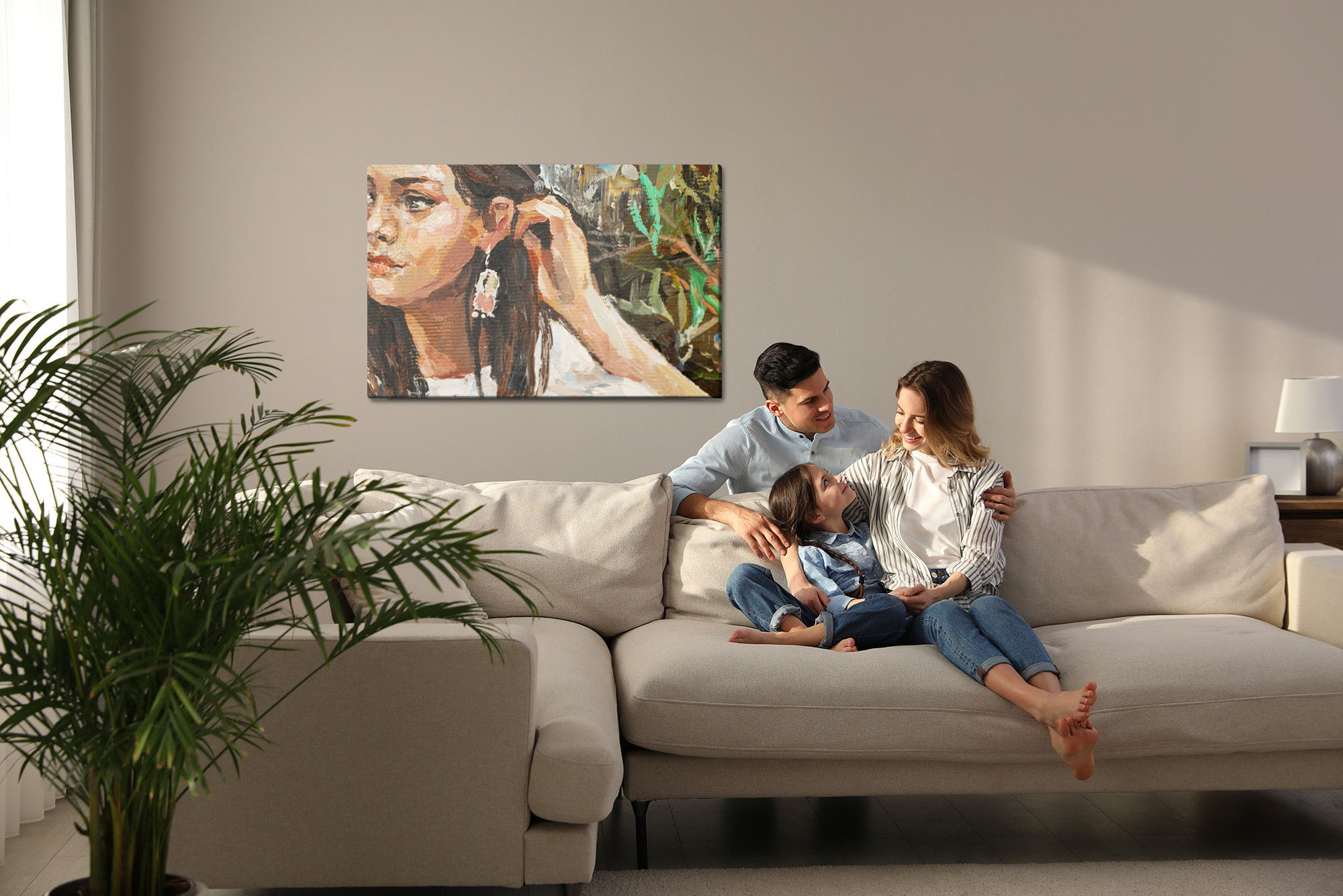 Varje tavla monteras på en massiv fururam. Format upp till 70×50 cm har en ram på 15 mm, medan format från 90×60 cm och uppåt har en ram på 20 mm. Den exakta dukspänningen gör att tavlan håller sin form över tid. Motivet A young girl is sitting trycks runt hela ramen vilket ger ett stilrent galleriuttryck där tavlan är lika vacker från sidan som framifrån. Kombinationen av rak dukspänning, rena linjer och korrekt tryck ger en professionell finish.
